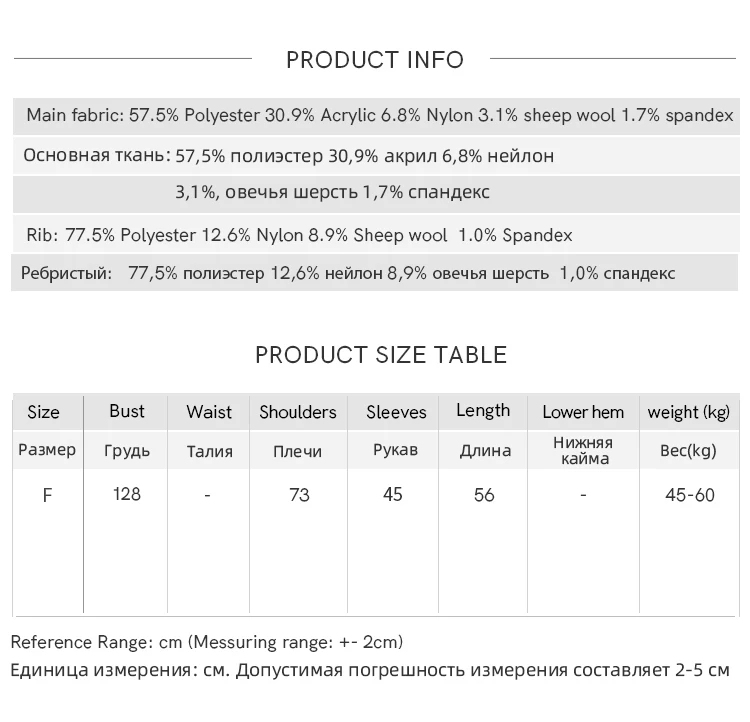 Material Composition: 57.5% polyester fiber 30.9% acrylic 6.8% nylon 3.1% wool 1.7% spande