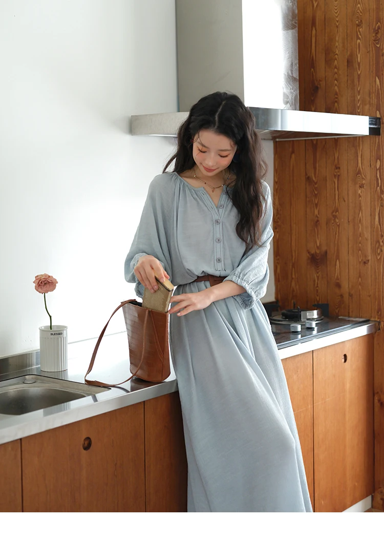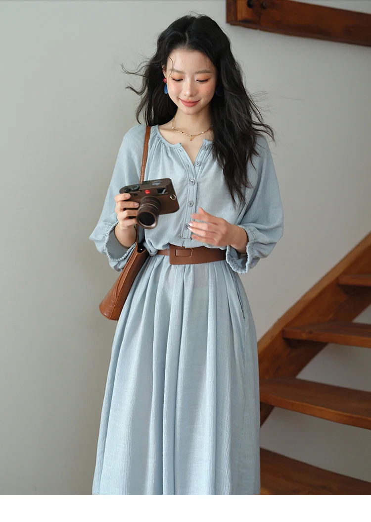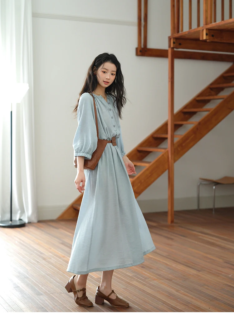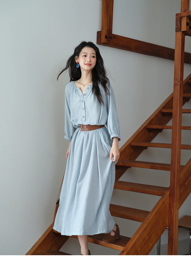 MISHOW Women's Half Sleeve Button Bamboo Knot Dress with Bohemian Belt 2025 Autumn Blue Long Dress Ladies Clothing MXE20L2468