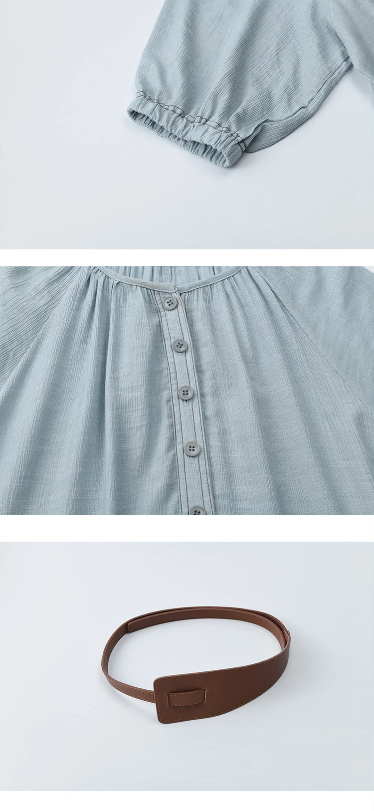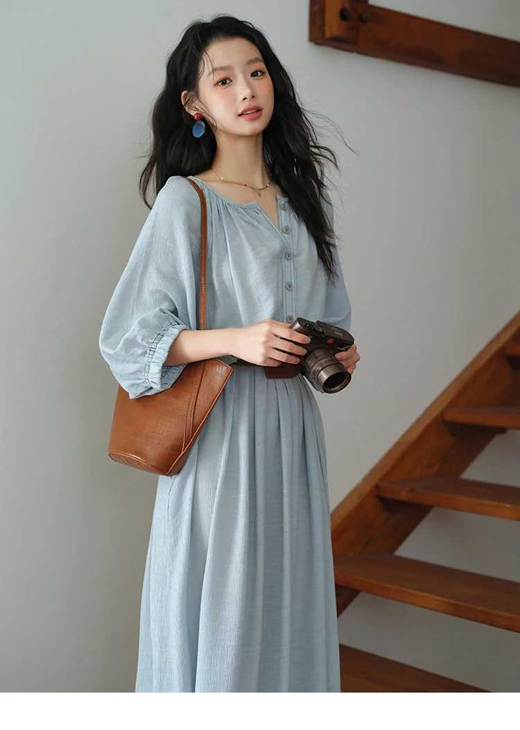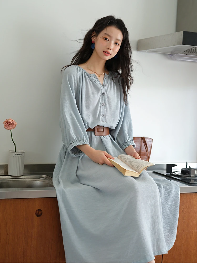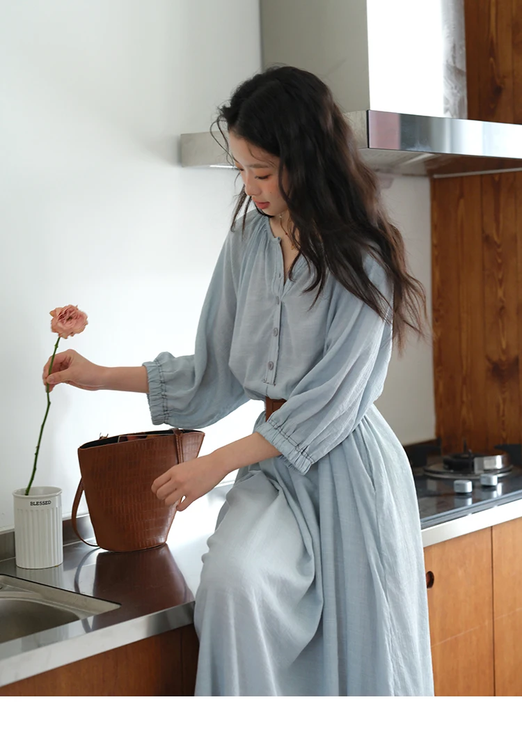 MISHOW Women's Half Sleeve Button Bamboo Knot Dress with Bohemian Belt 2025 Autumn Blue Long Dress Ladies Clothing MXE20L2468