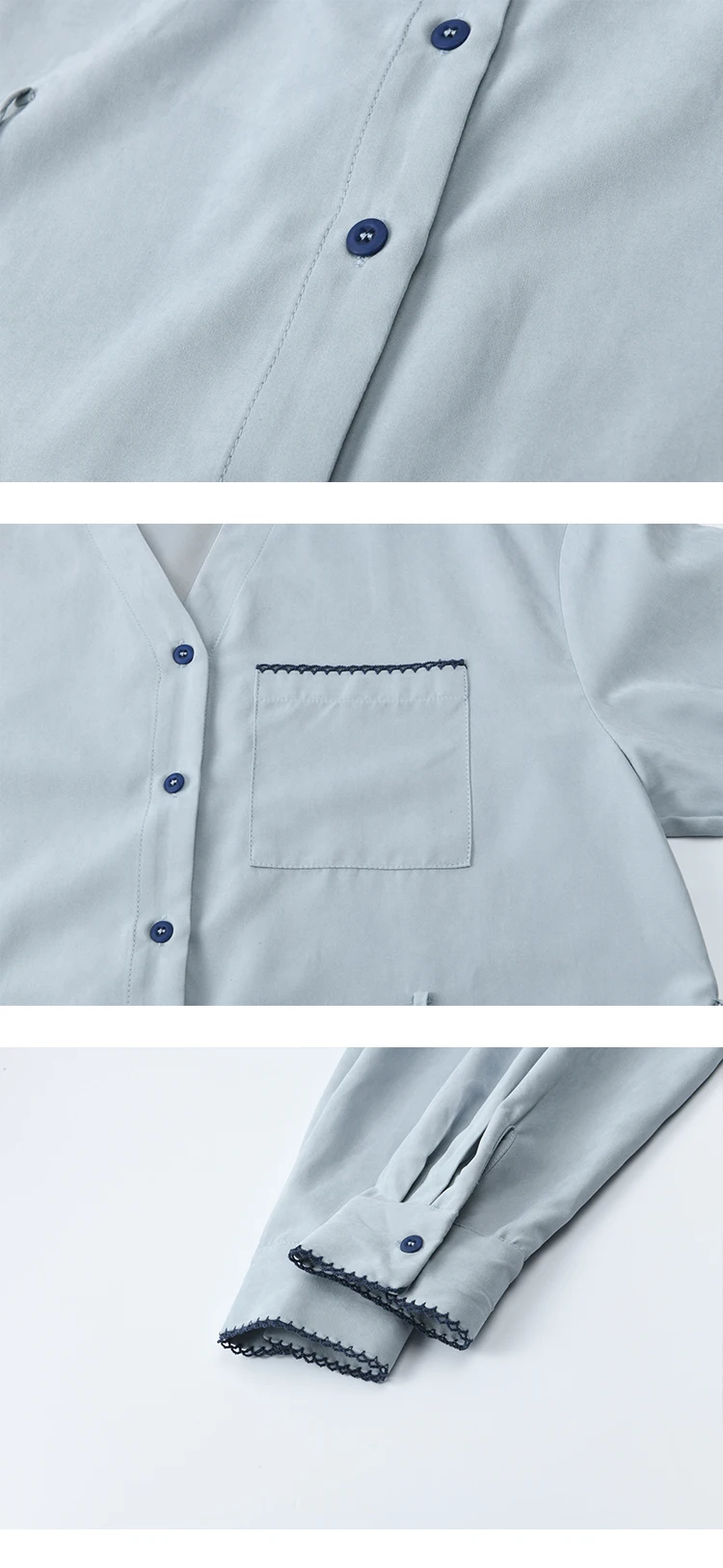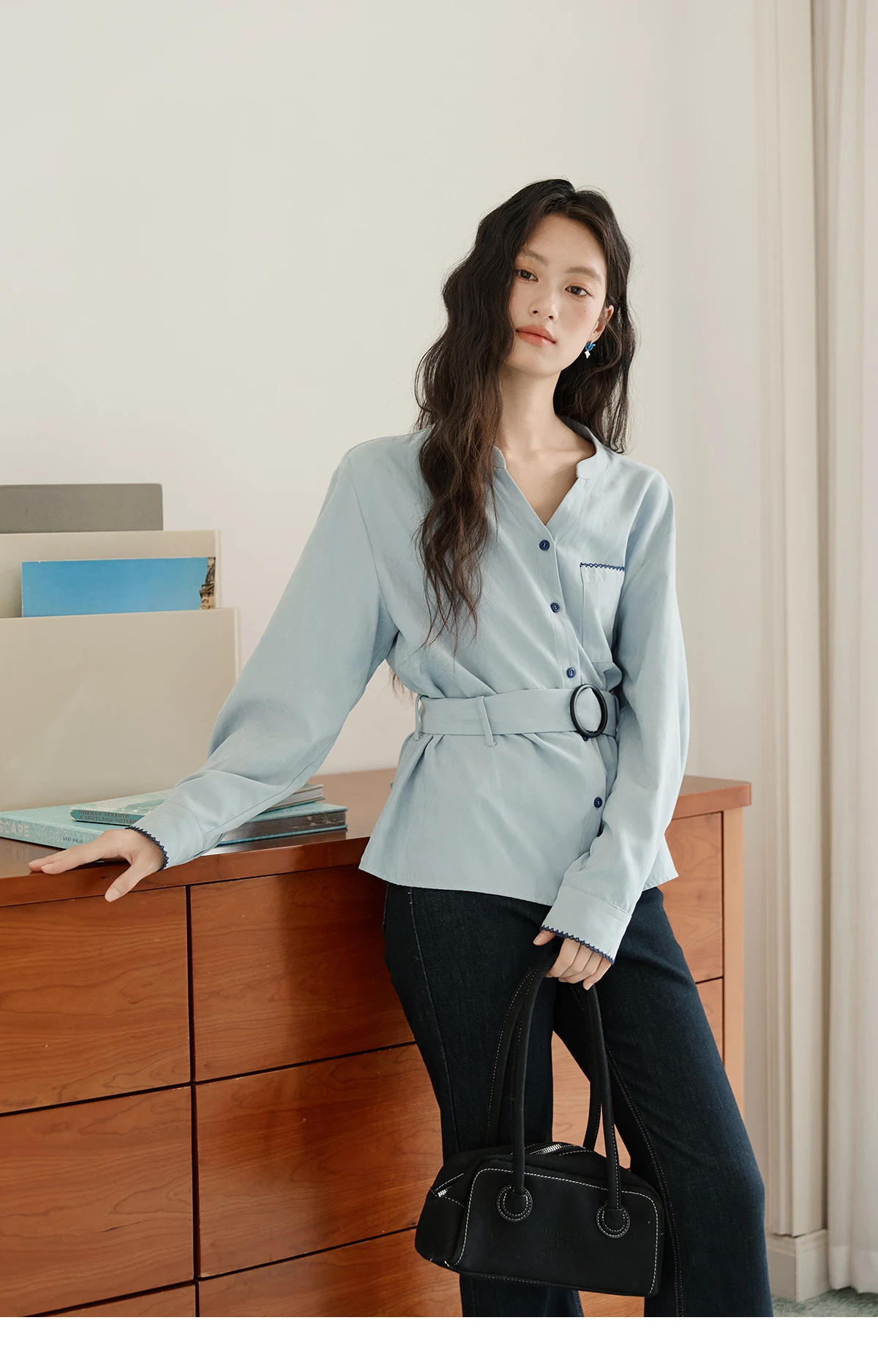 MISHOW Women's Haze Blue Peach Skin Velvet Shirt Autumn 2025 Contrast Color Design Waist Shirts Commute Versatile Top MXE47X2497