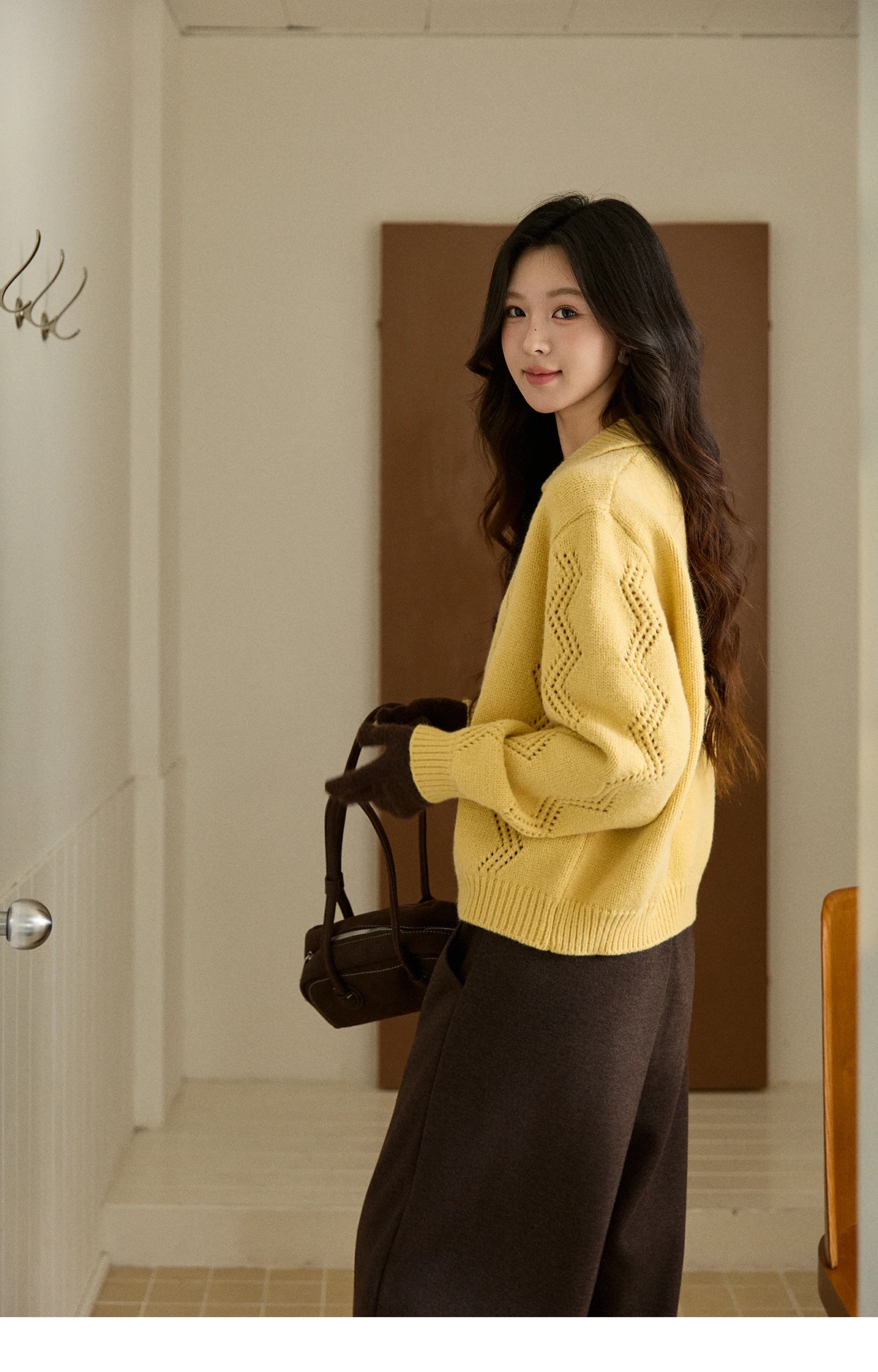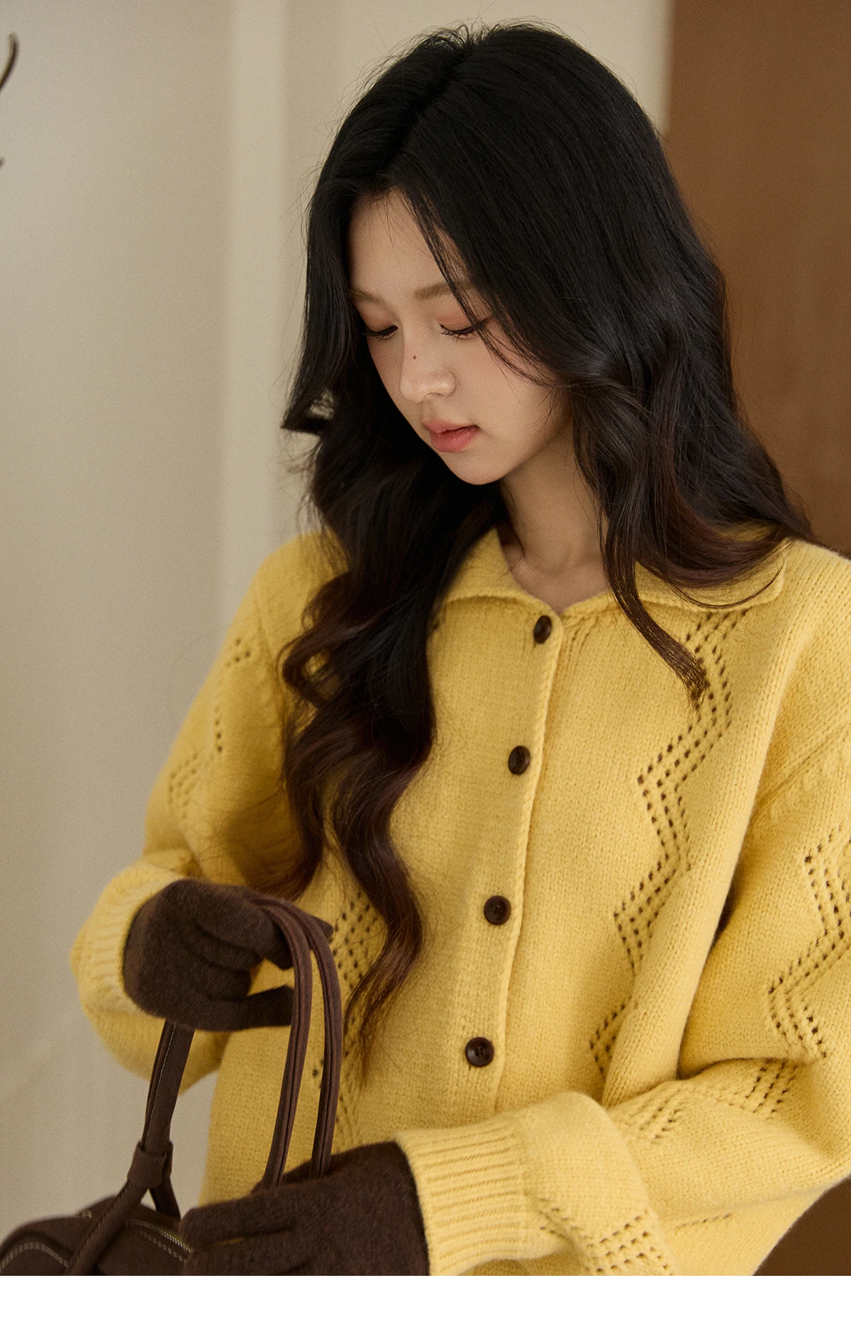 MISHOW Women's Hollow Pattern Knitted Cardigan 2025 Winter Yellow Lapel Single Breasted Sweater Loose Pullover Tops MXE94Z2961