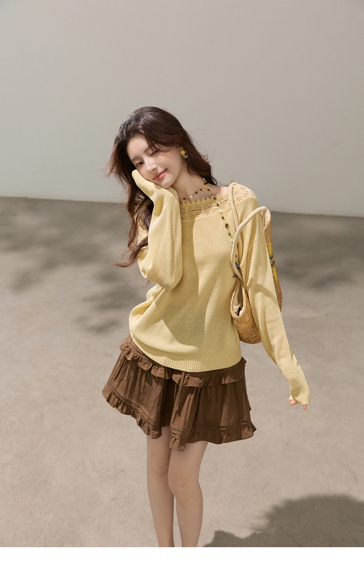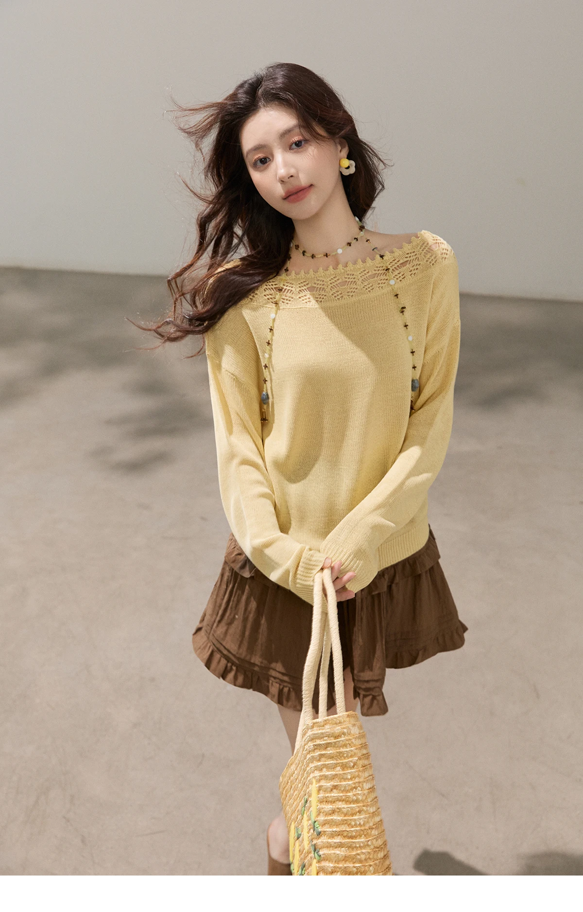 MISHOW Women's Hollowed Out Lace Trim Knit Tops 2026 Spring Boat Neck Long Sleeve Knitwear Casual Soft Yellow Sweater MXF15Z3050