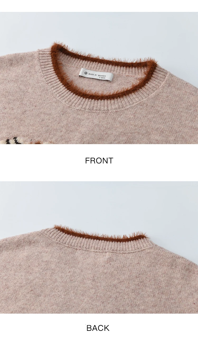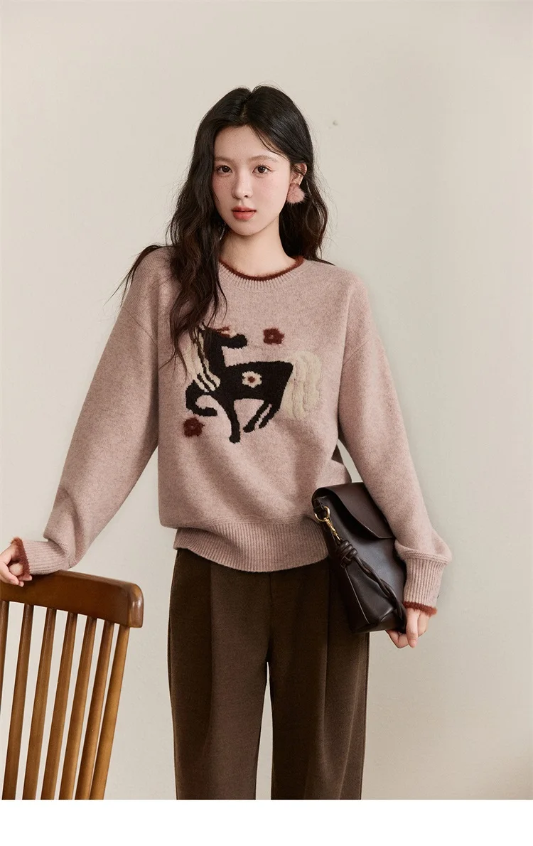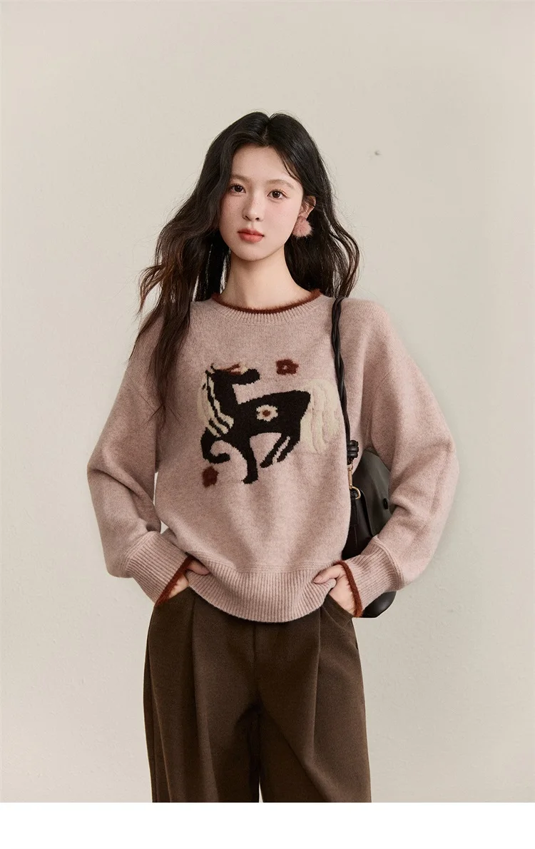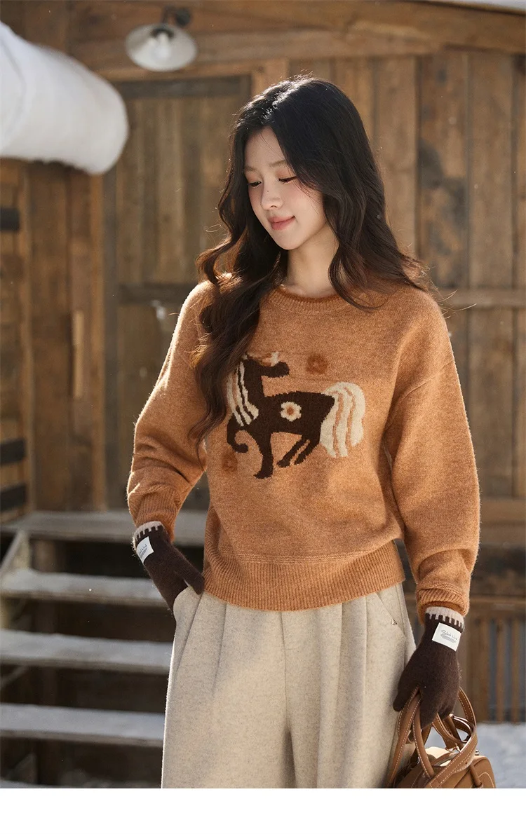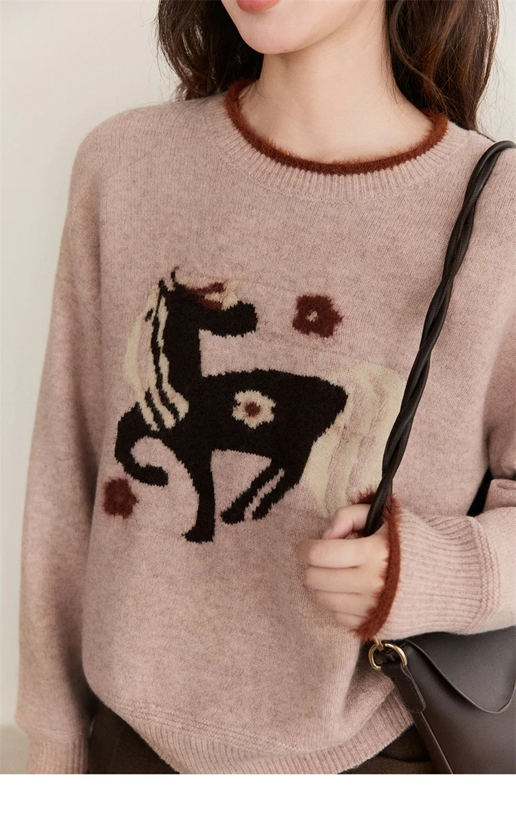 MISHOW Women's Horse Pattern Knit Sweater Winter Crew Neck Sweaters Collar Cuffs Splice Contrasting Faux Mink Fur Top MXE94Z2863