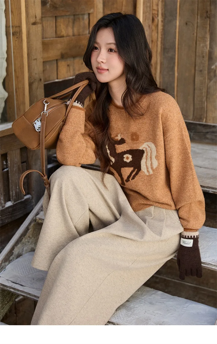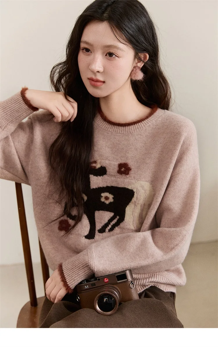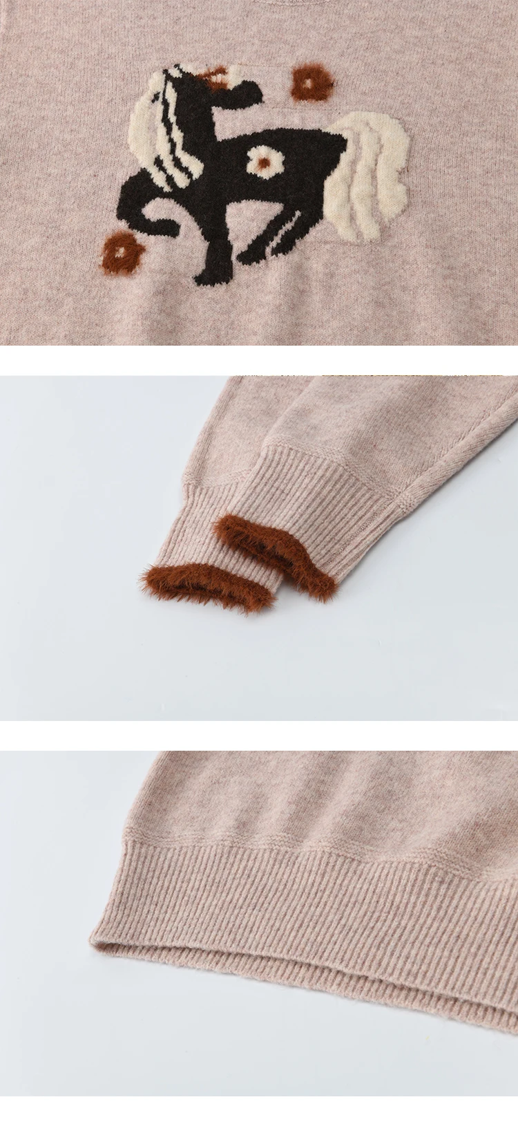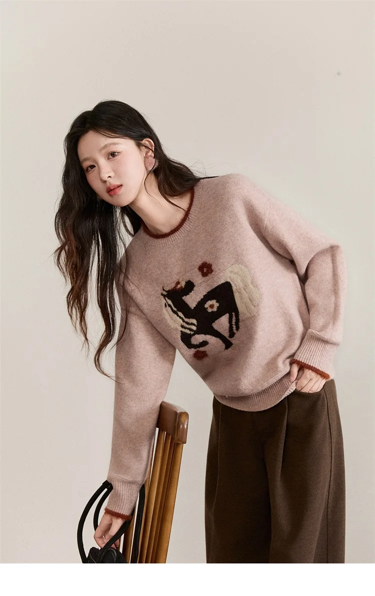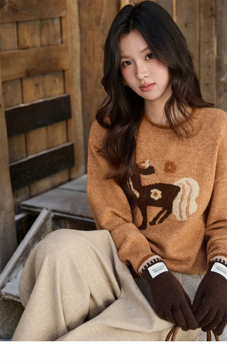 MISHOW Women's Horse Pattern Knit Sweater Winter Crew Neck Sweaters Collar Cuffs Splice Contrasting Faux Mink Fur Top MXE94Z2863