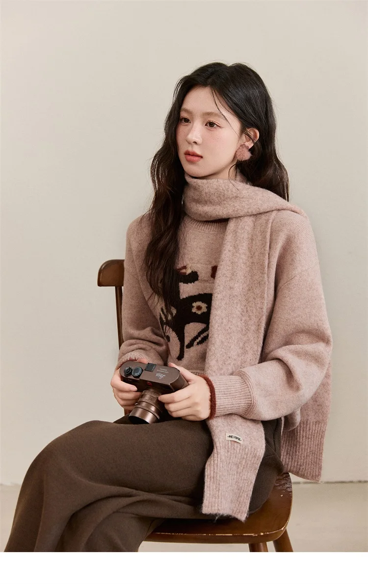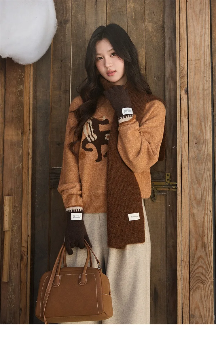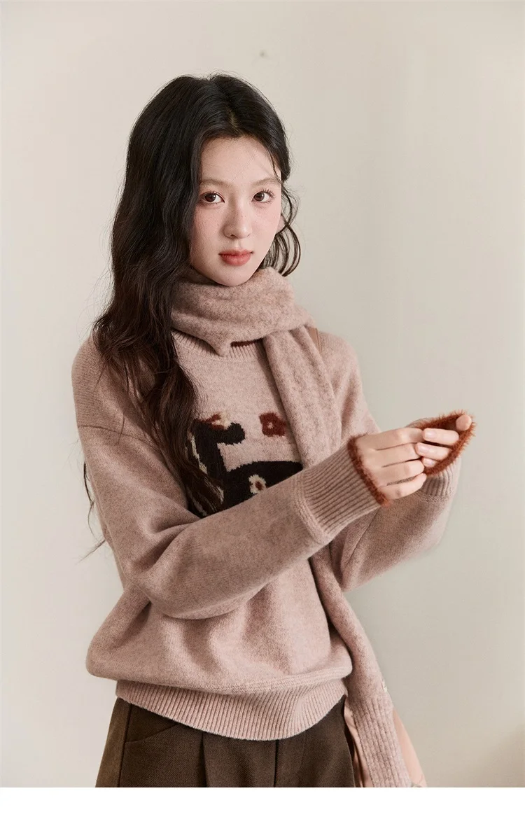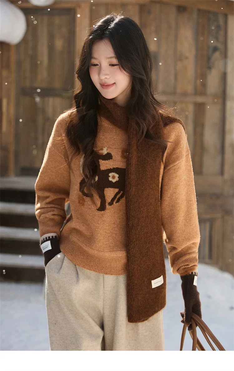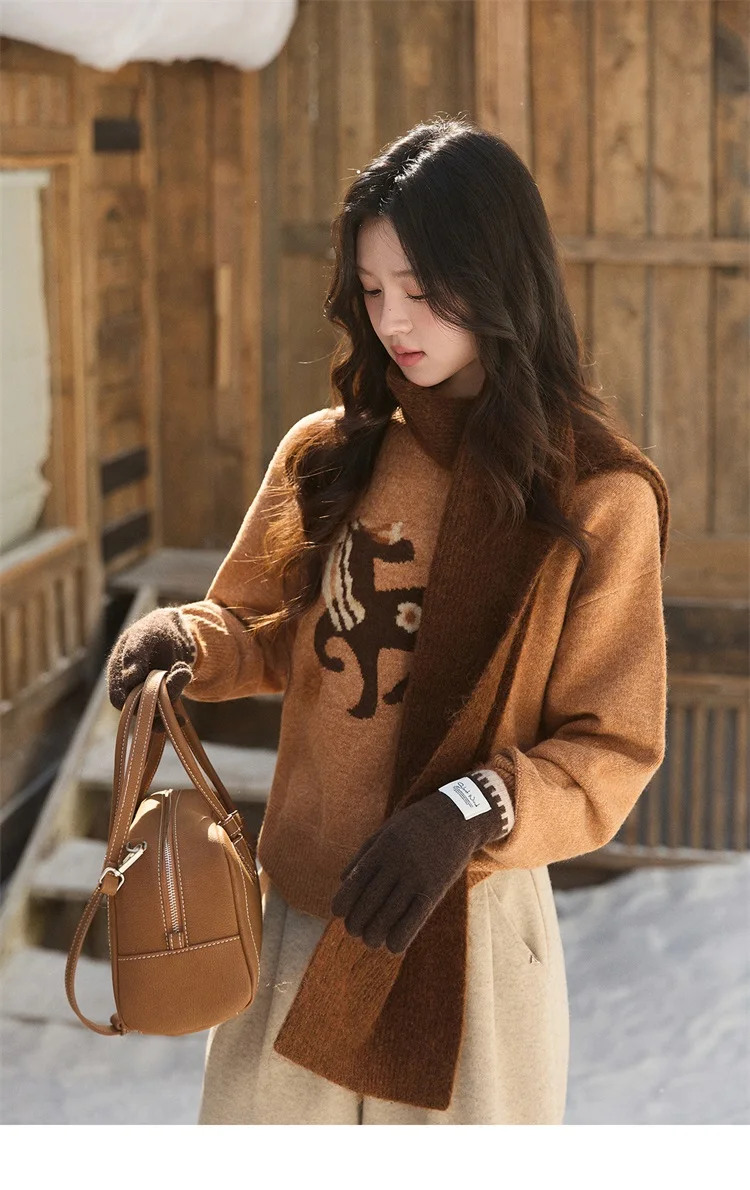 MISHOW Women's Horse Pattern Knit Sweater Winter Crew Neck Sweaters Collar Cuffs Splice Contrasting Faux Mink Fur Top MXE94Z2863