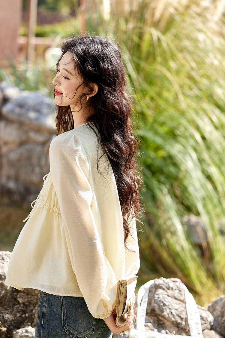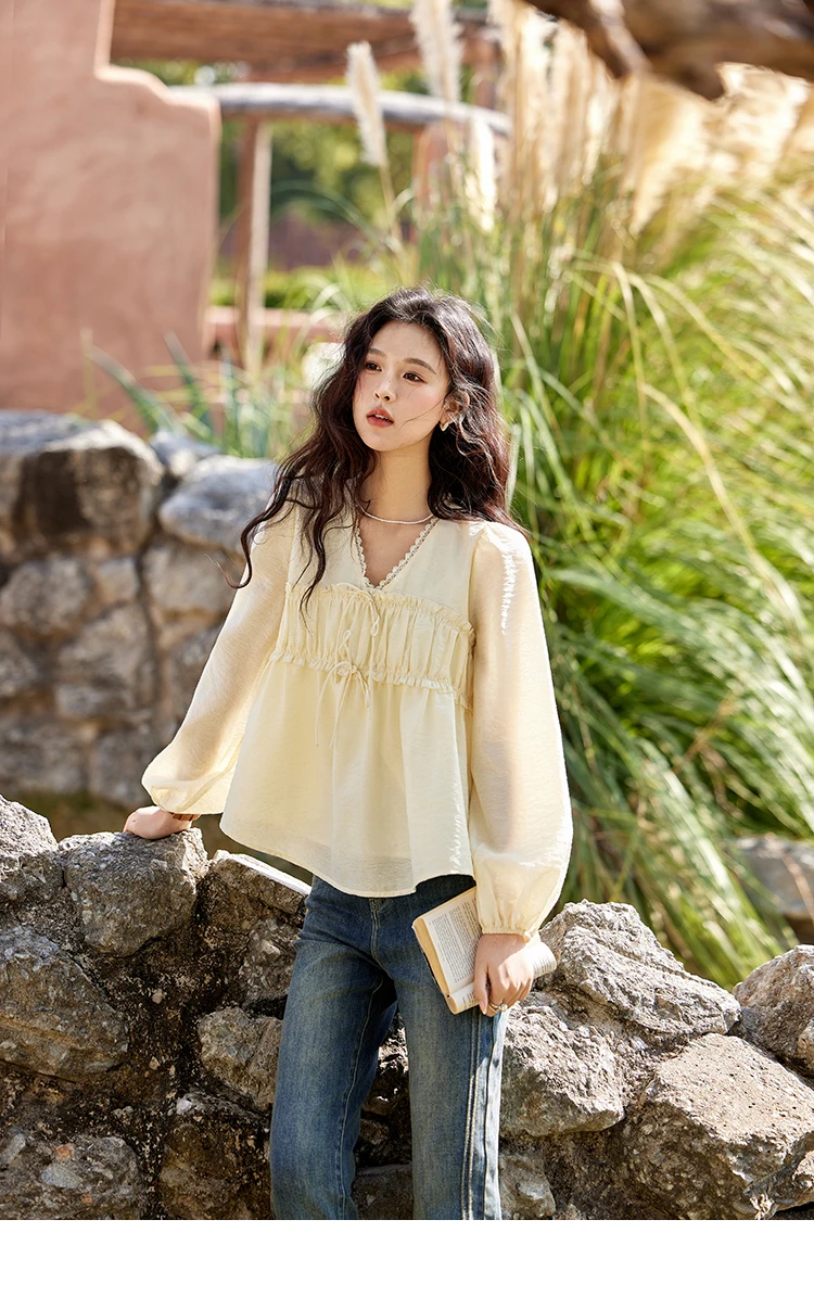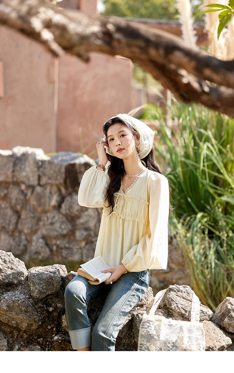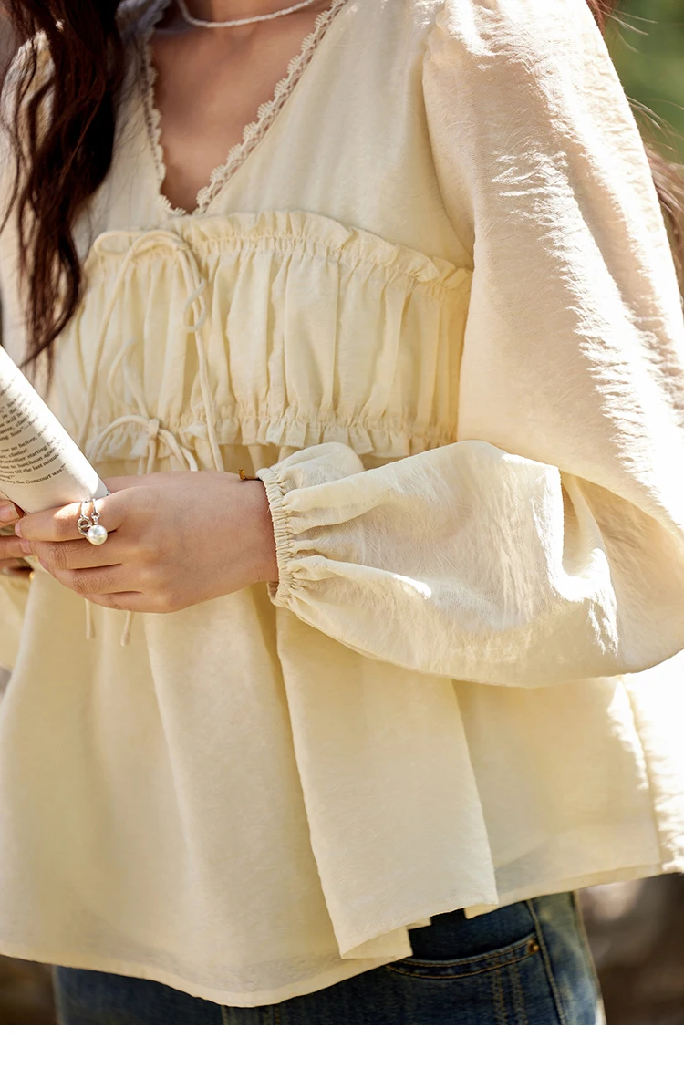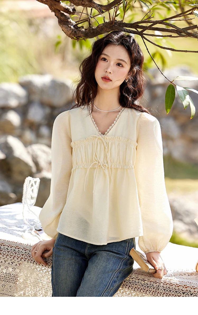 MISHOW Women's Jacquard Lace V-neck Blouses 2025 Spring Ruffled Wavy Design Blouse Slim Elegant Commuting Sweet Top MXE12C0397