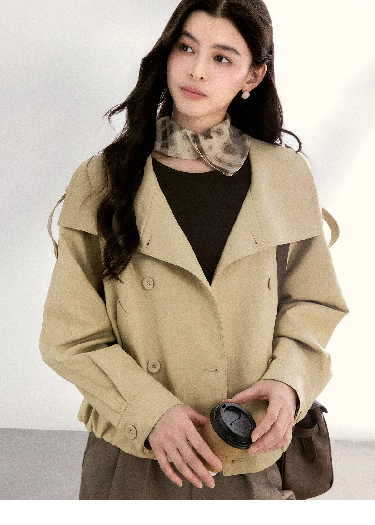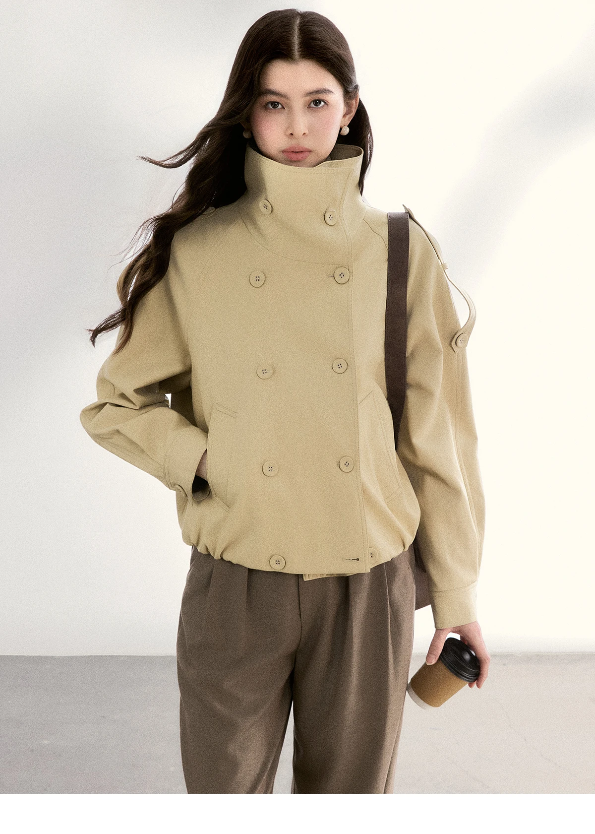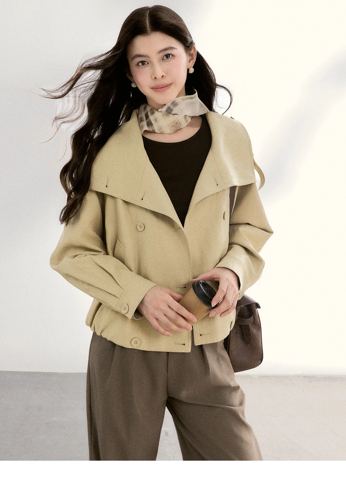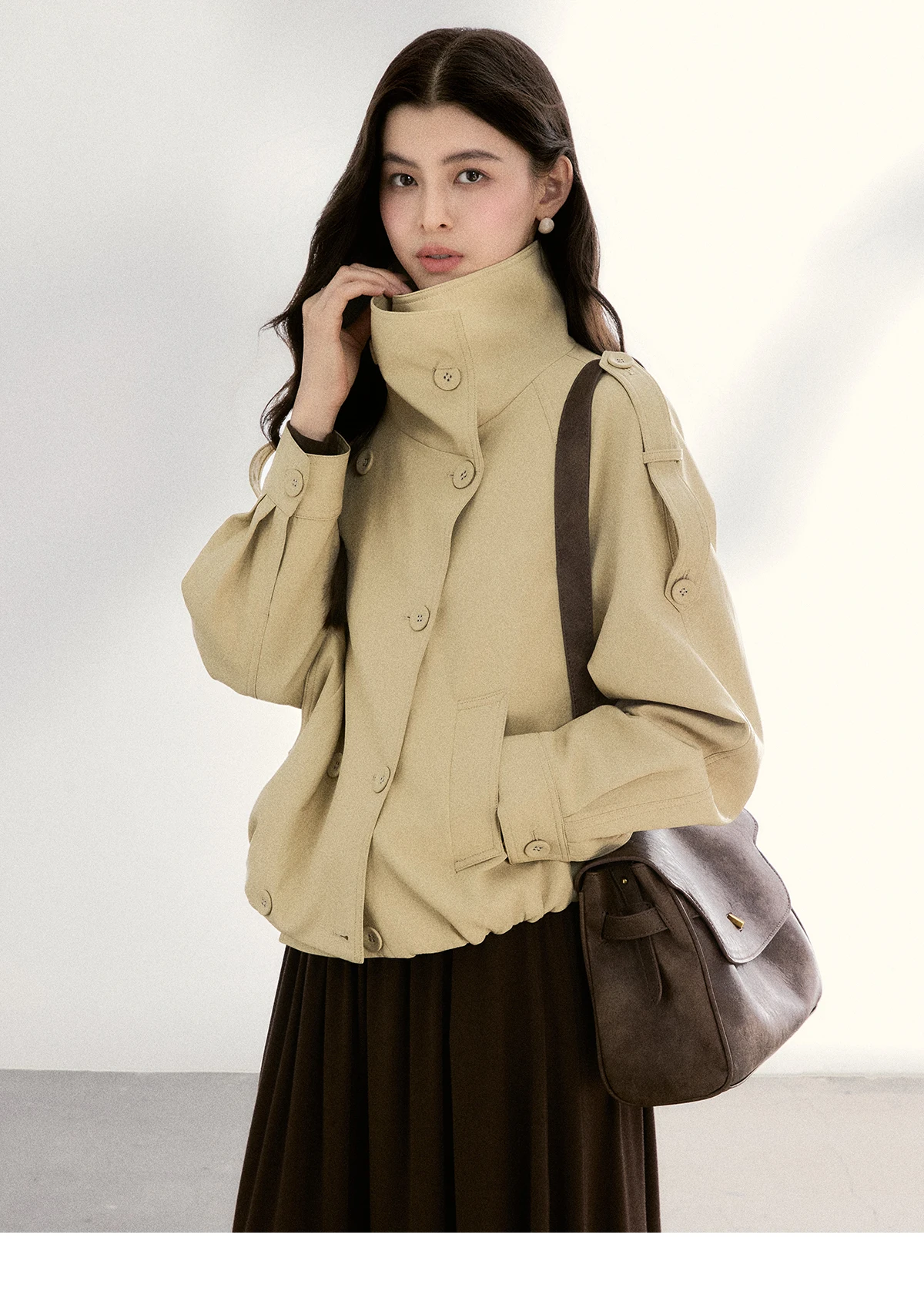 MISHOW Women's Khaki Cropped Short Leather Jacket 2026 Spring Lapel Stand Collar Double Breasted Casual Loose Coat MXF108W1000
