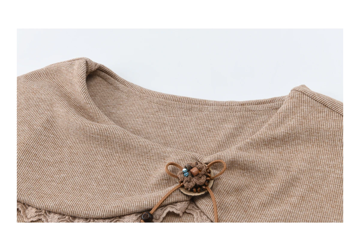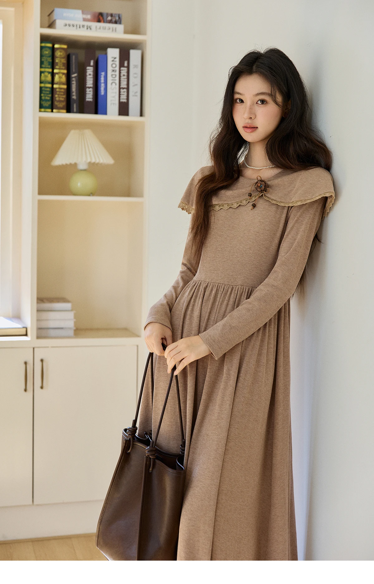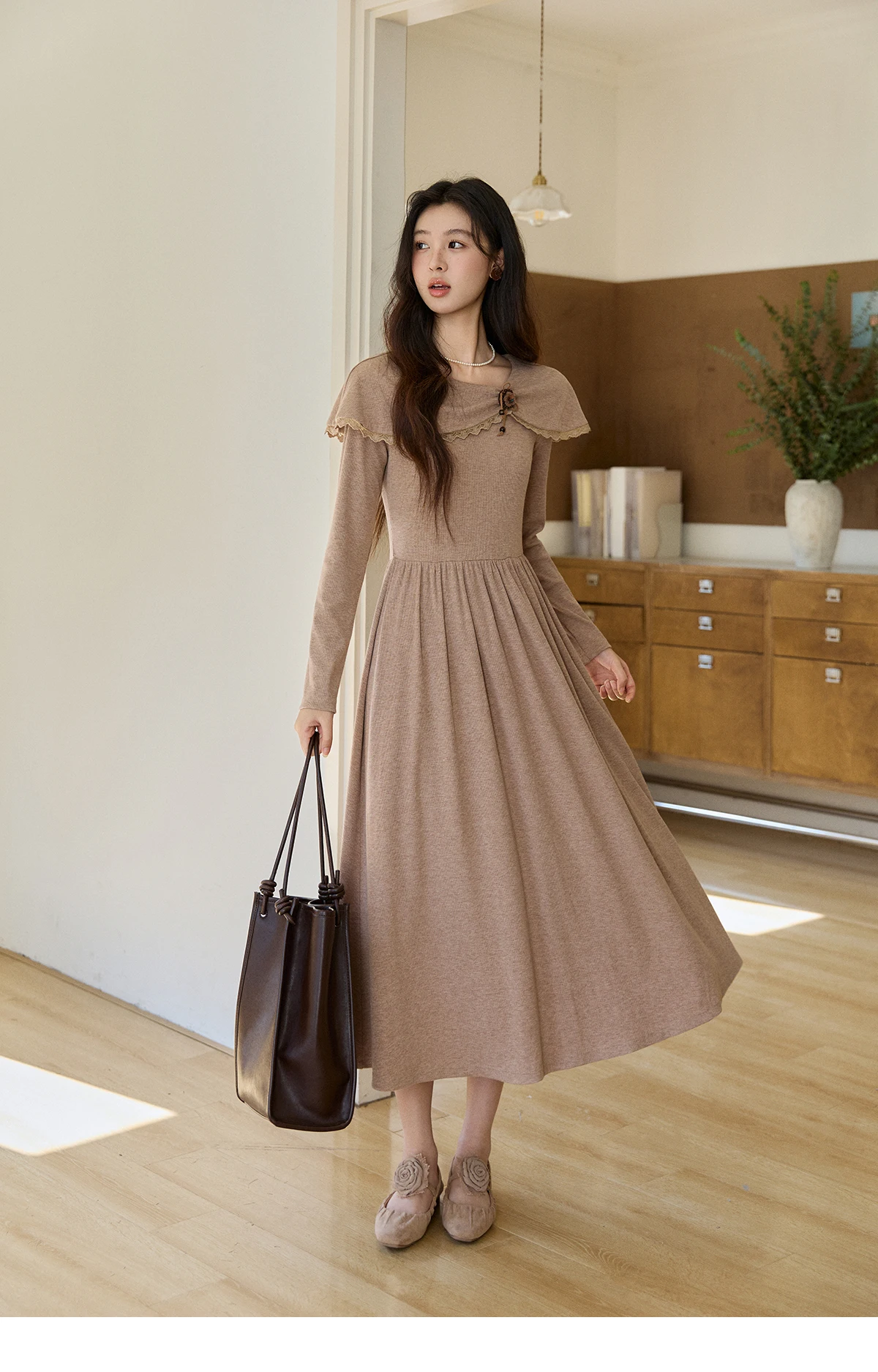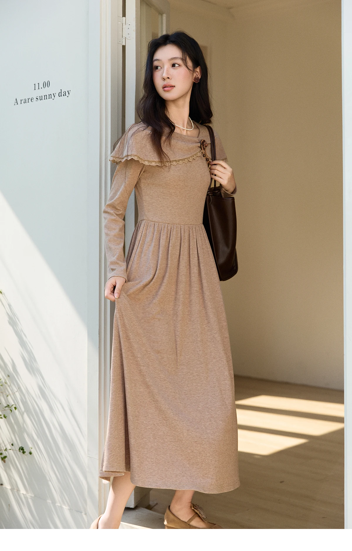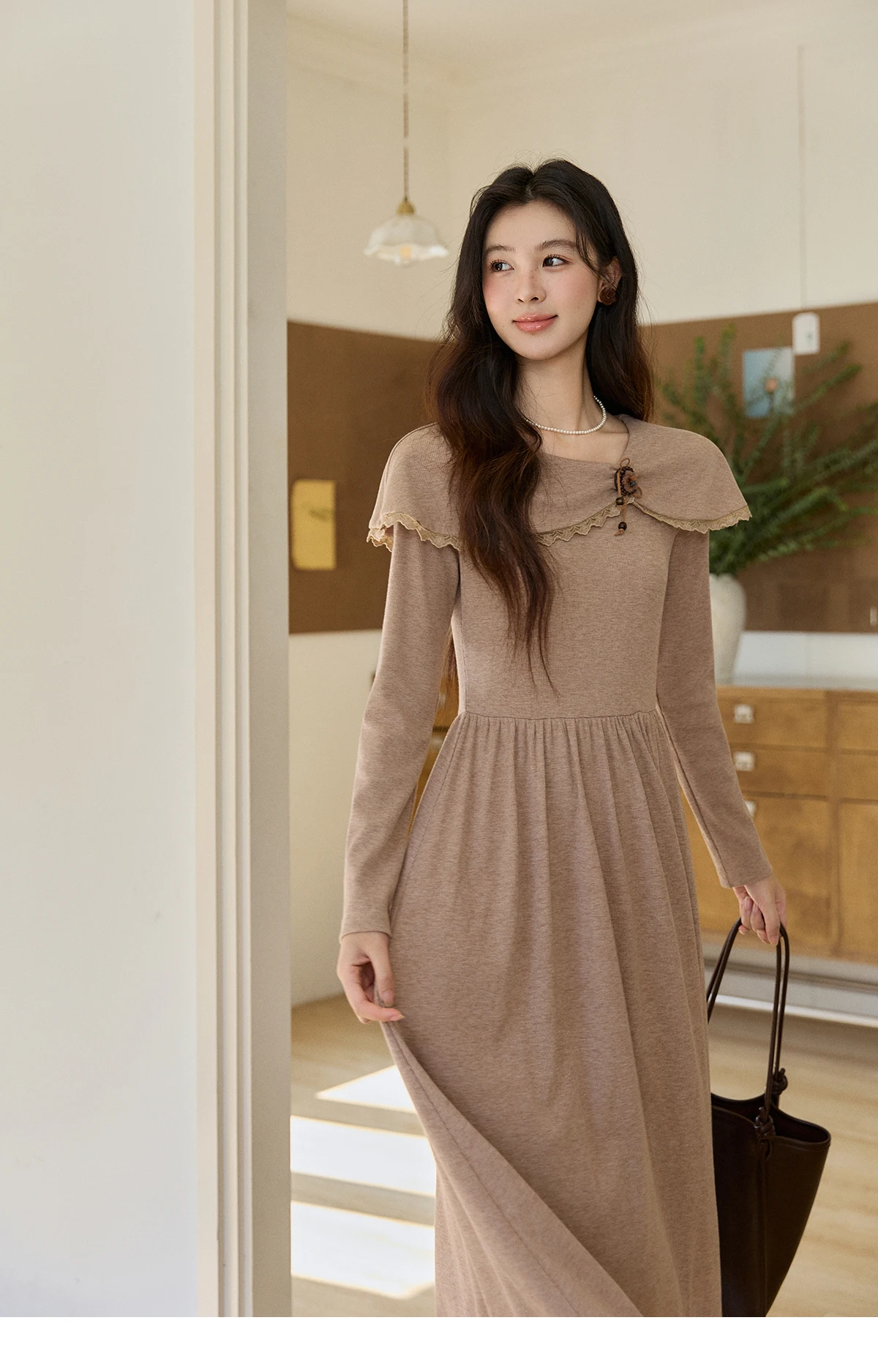 MISHOW Women's Khaki Knitted Dress 2026 Spring Large Collar Decor Long Sleeve Dresses Pleated Casual Elegant Dress MXF11L2553