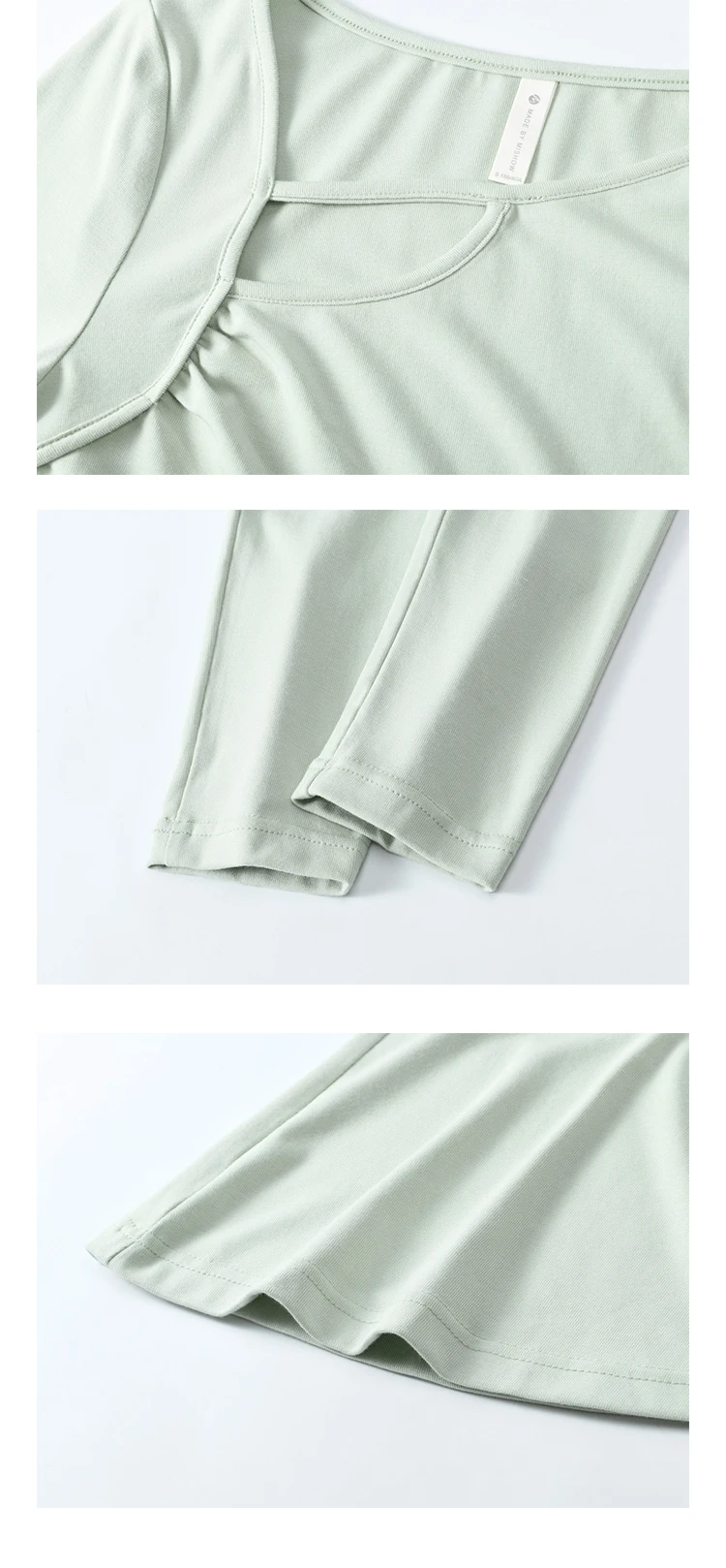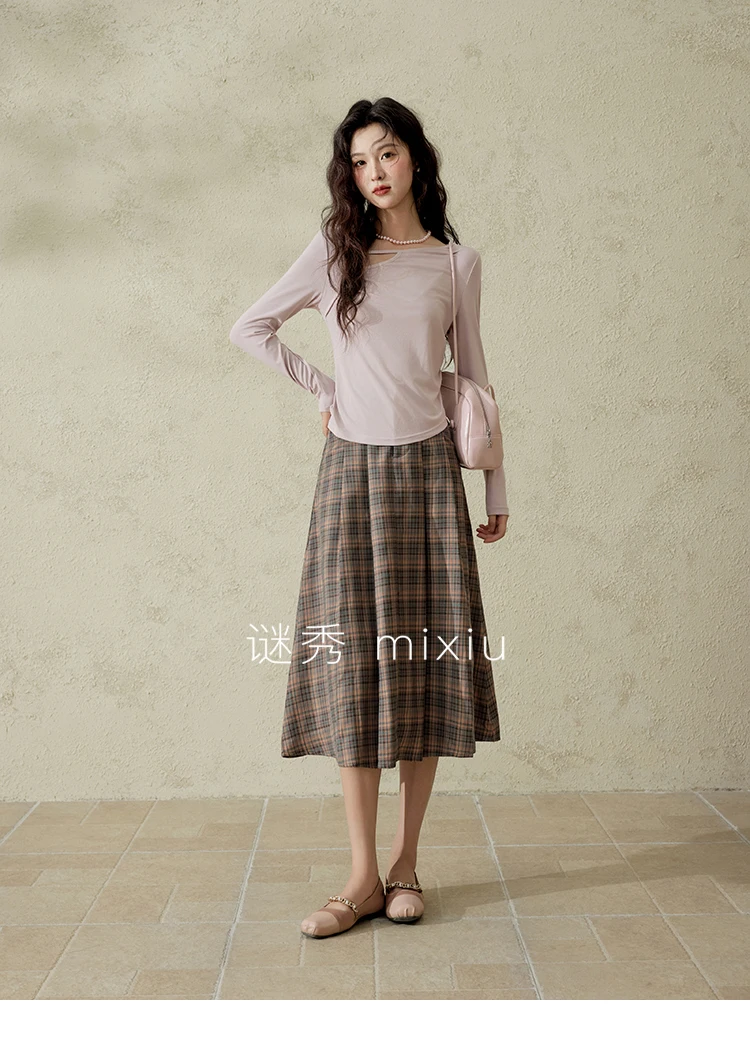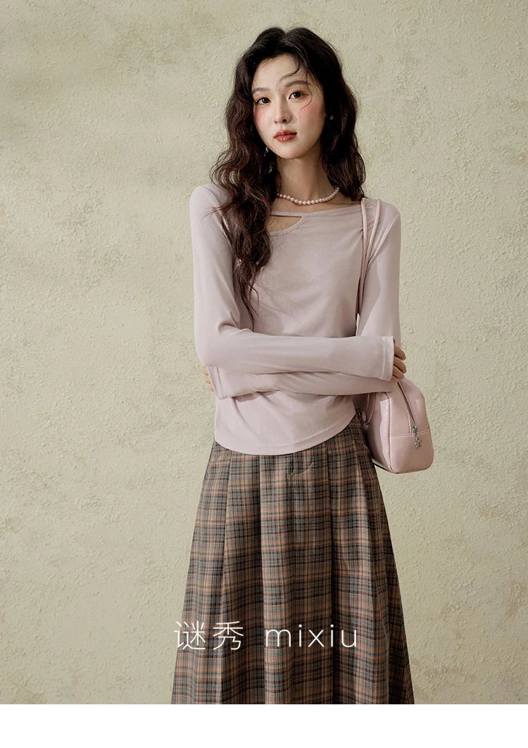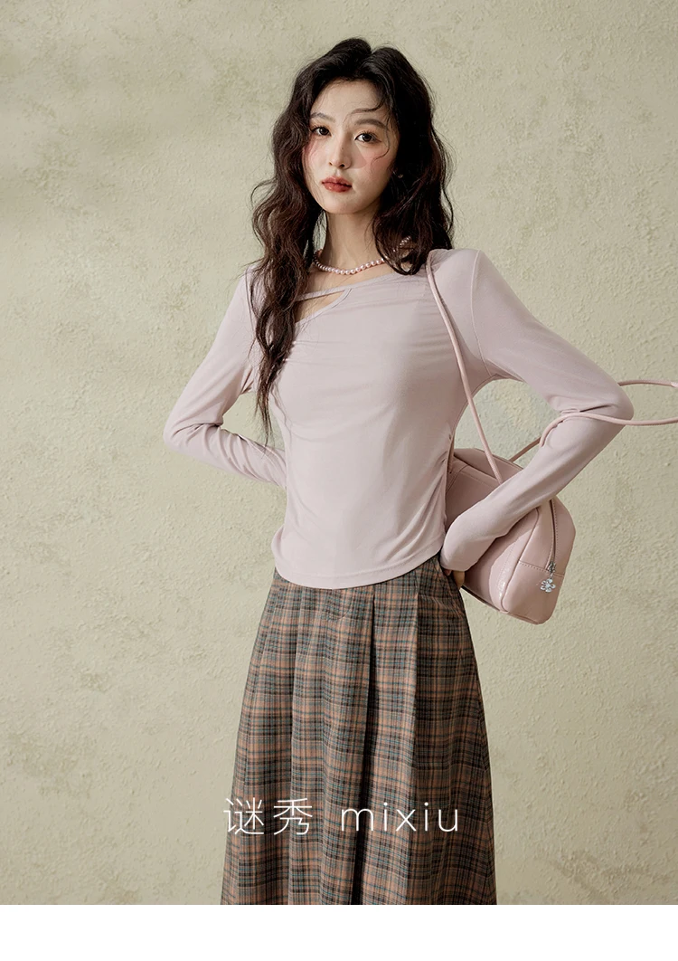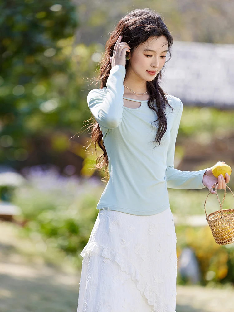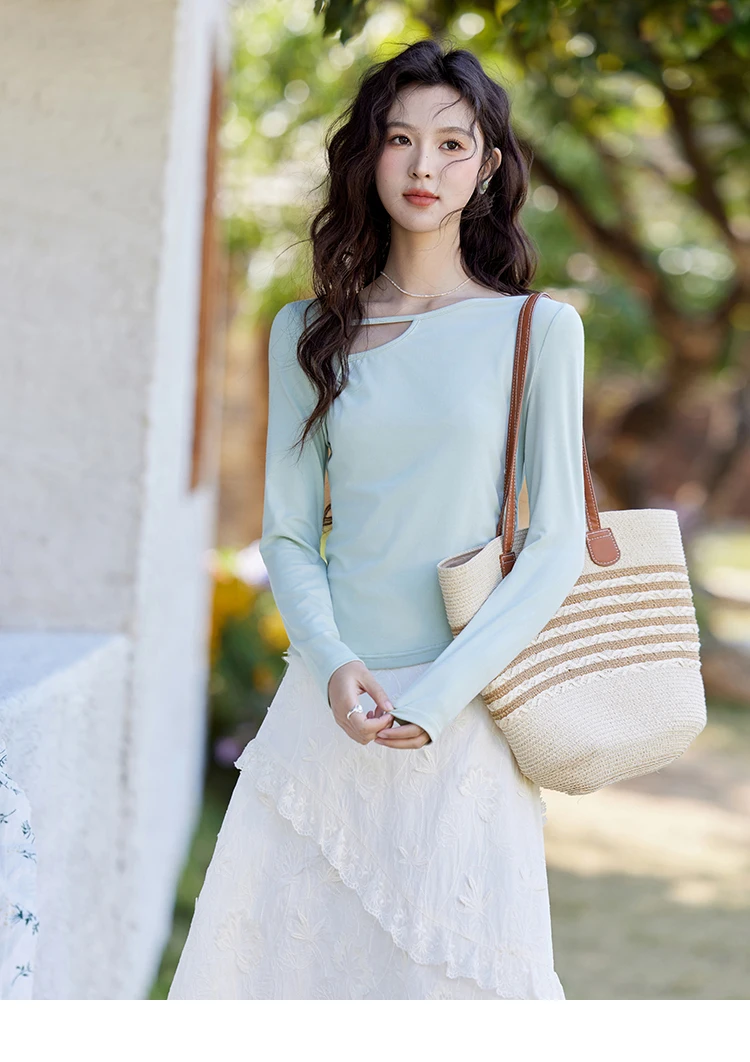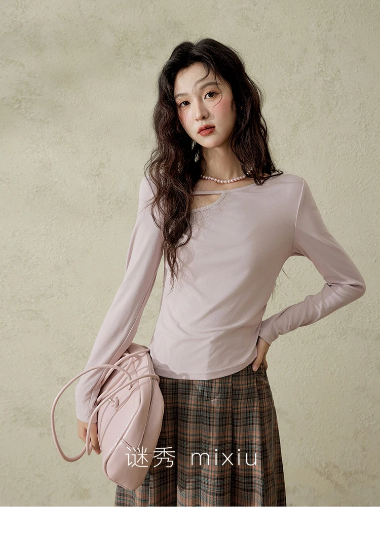 MISHOW Women's Knitted Long Sleeved T-shirt 2025 Spring Outfit Irregular Hollow Neck Tees Slim Solid Color Casual Top MXE13Z1116