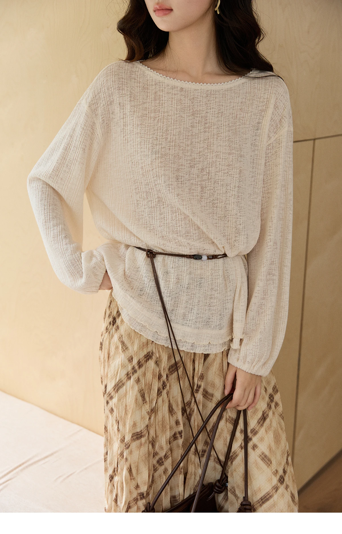 MISHOW Women's Lace Trim Boat Neck Knitted Tops with Belt 2026 Spring Micro Transparent Loose Casual Thin Sweater MXF13Z3002