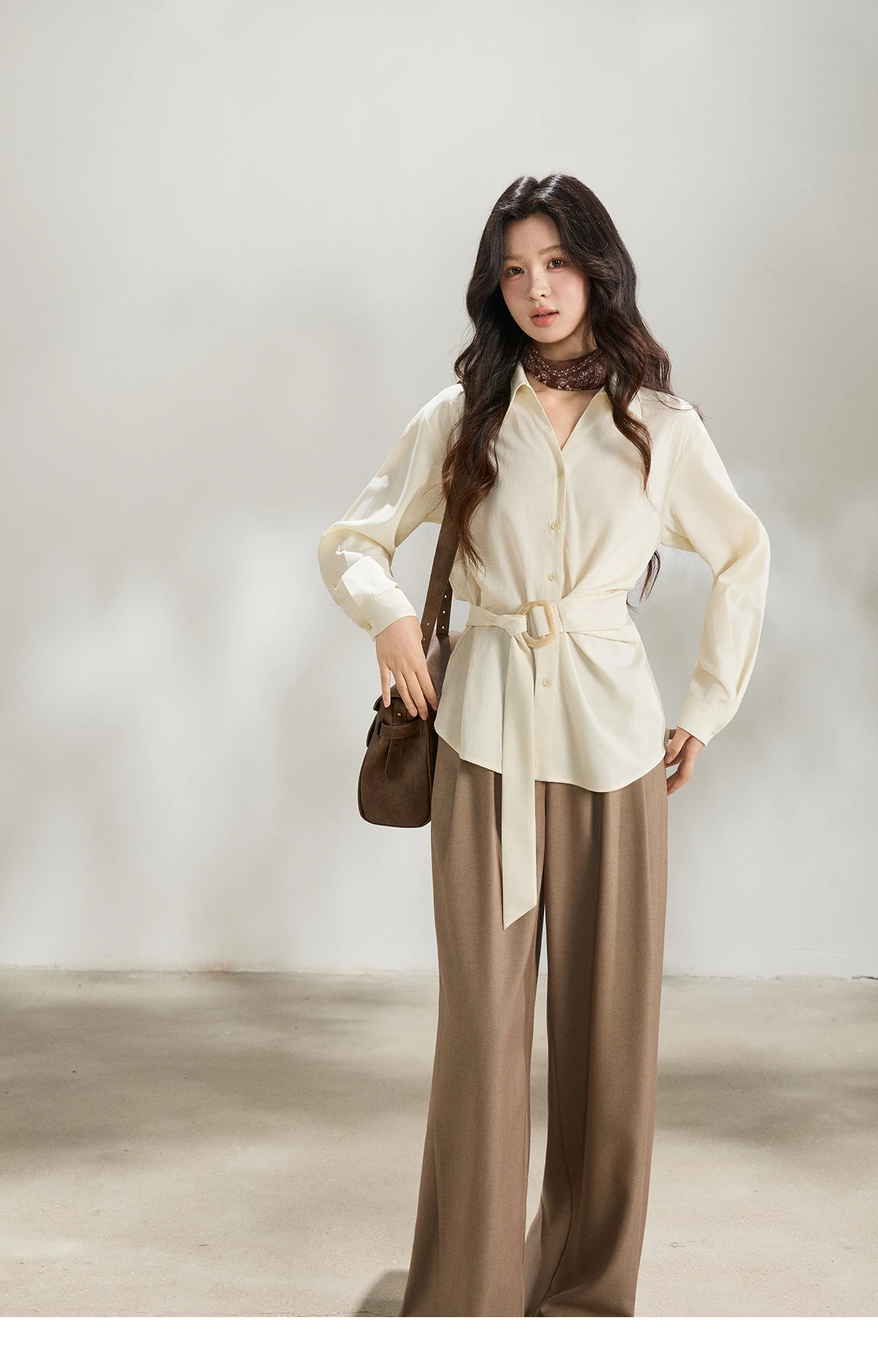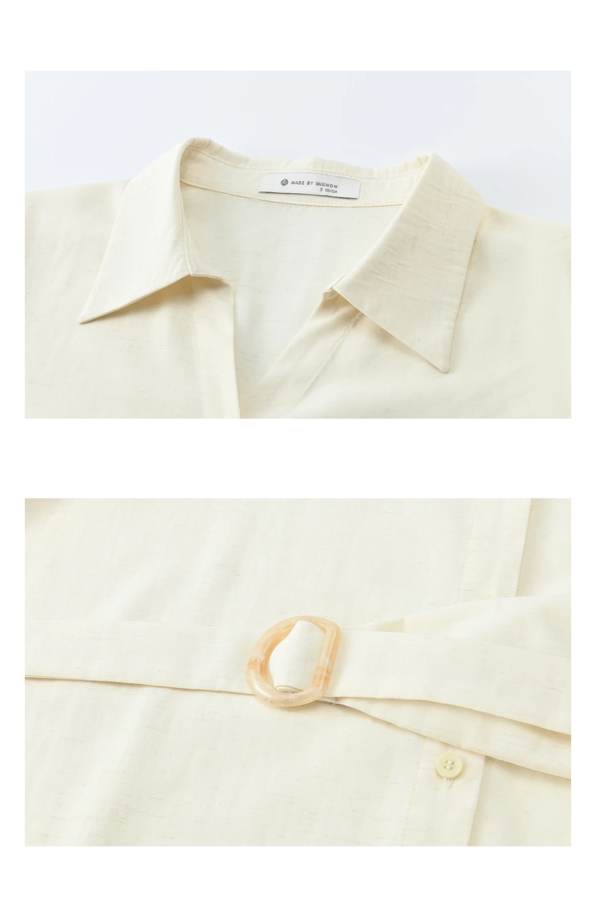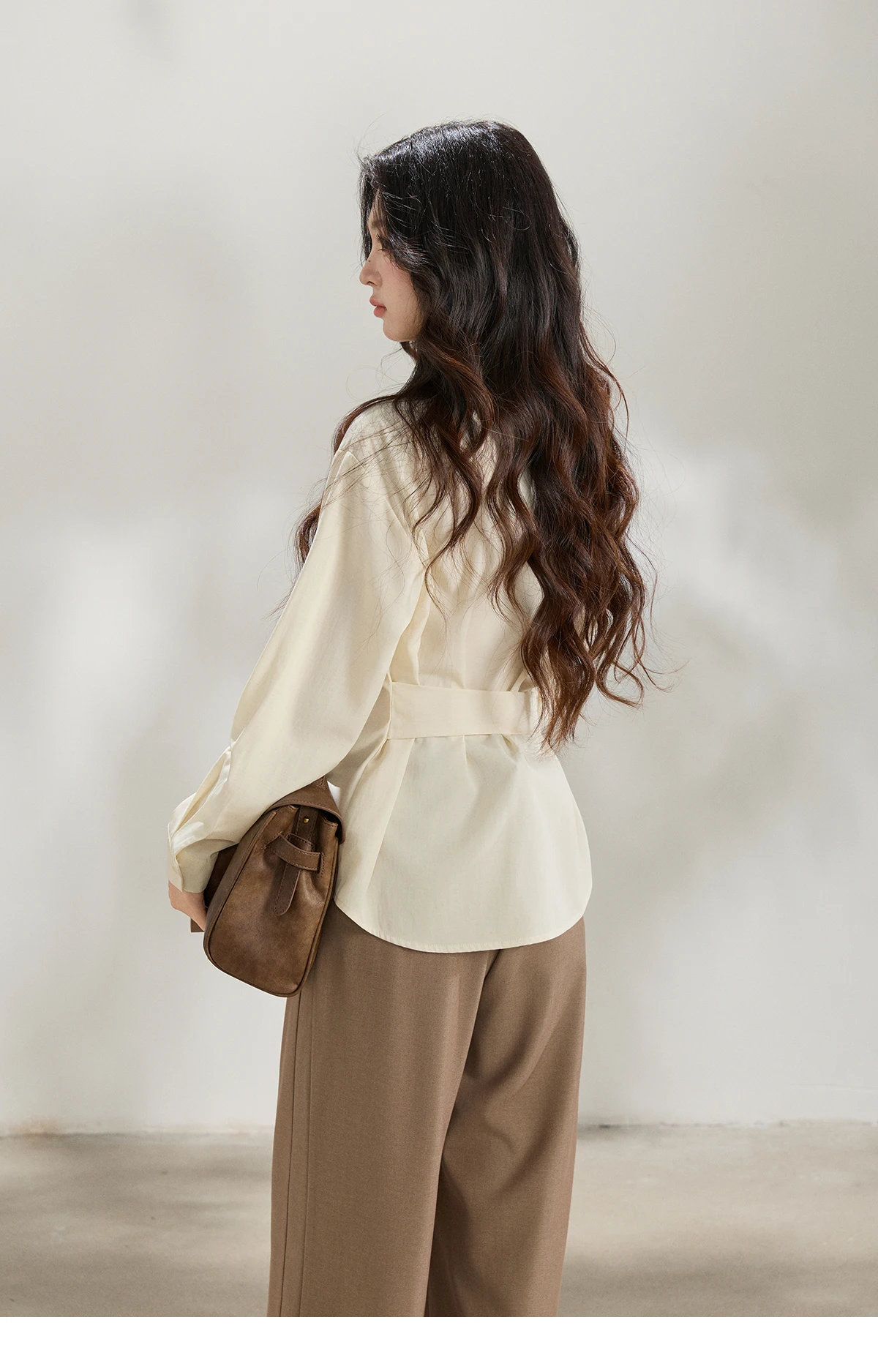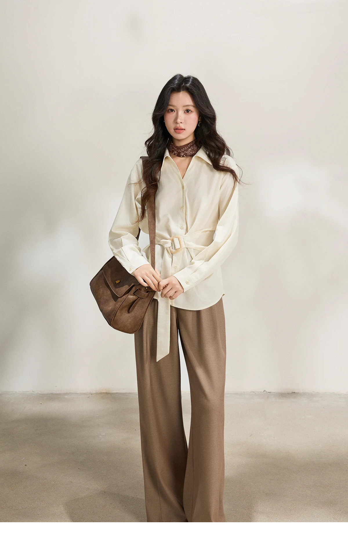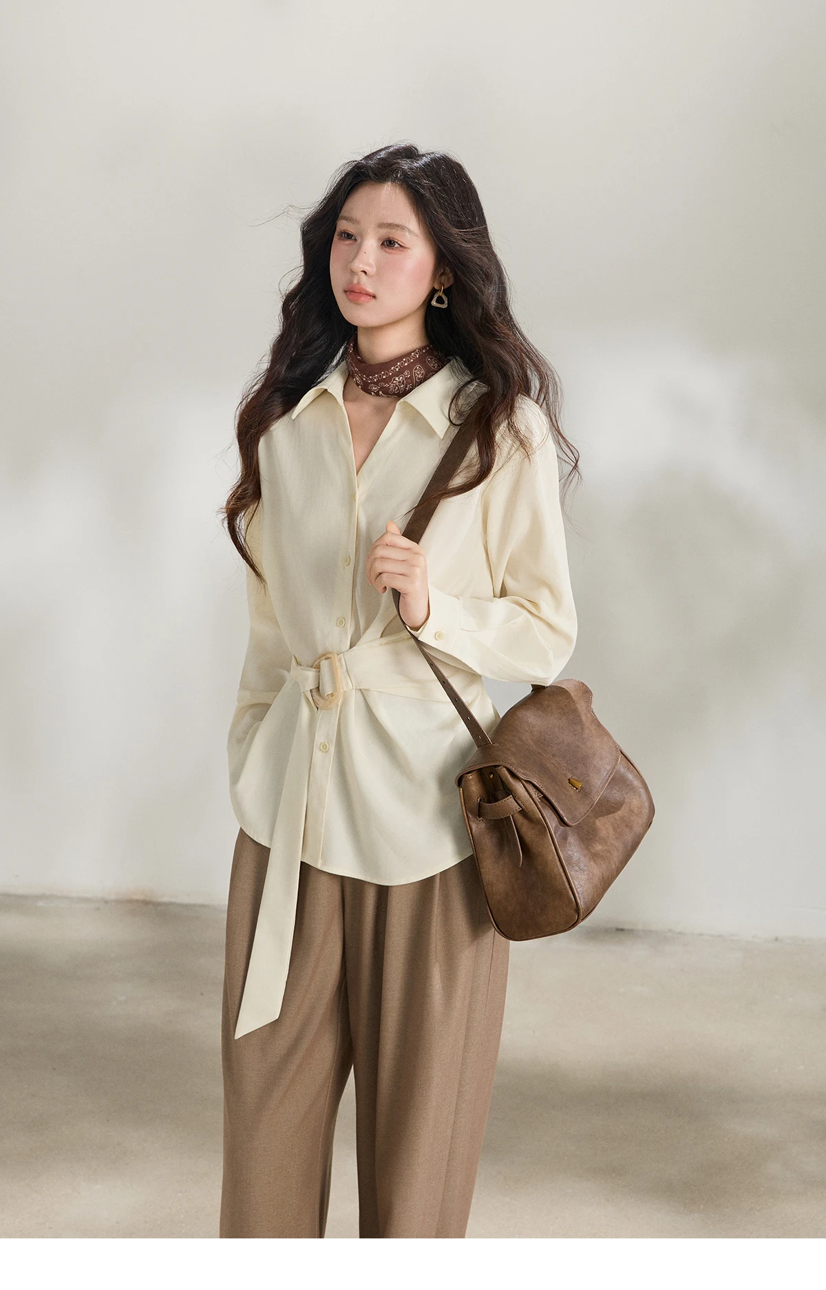 MISHOW Women's Lapel Collar Long Sleeve Shirt 2026 Spring with Belted Waist Casual Loose Soft Beige Shirt Office Lady MXF13C2452