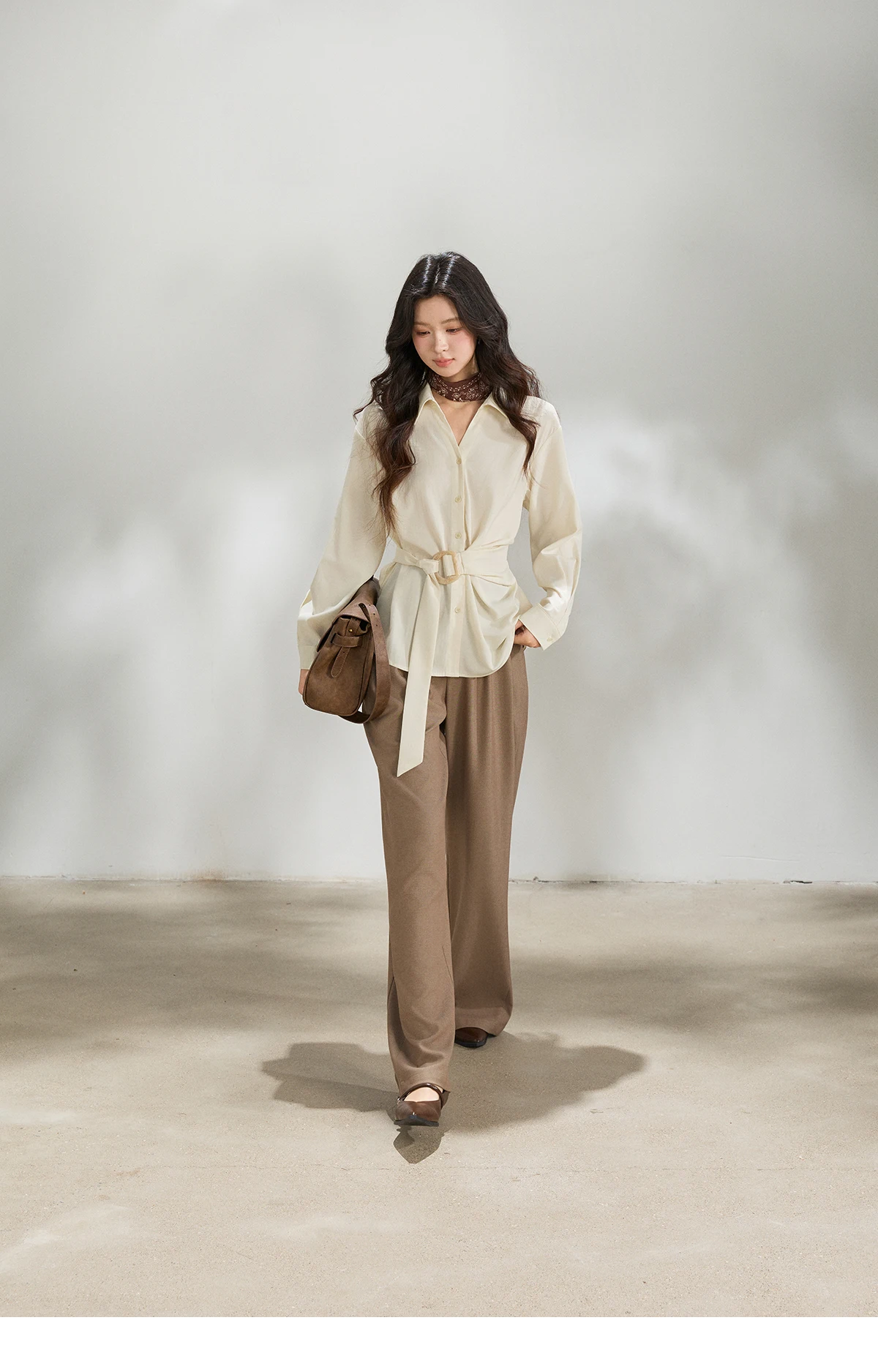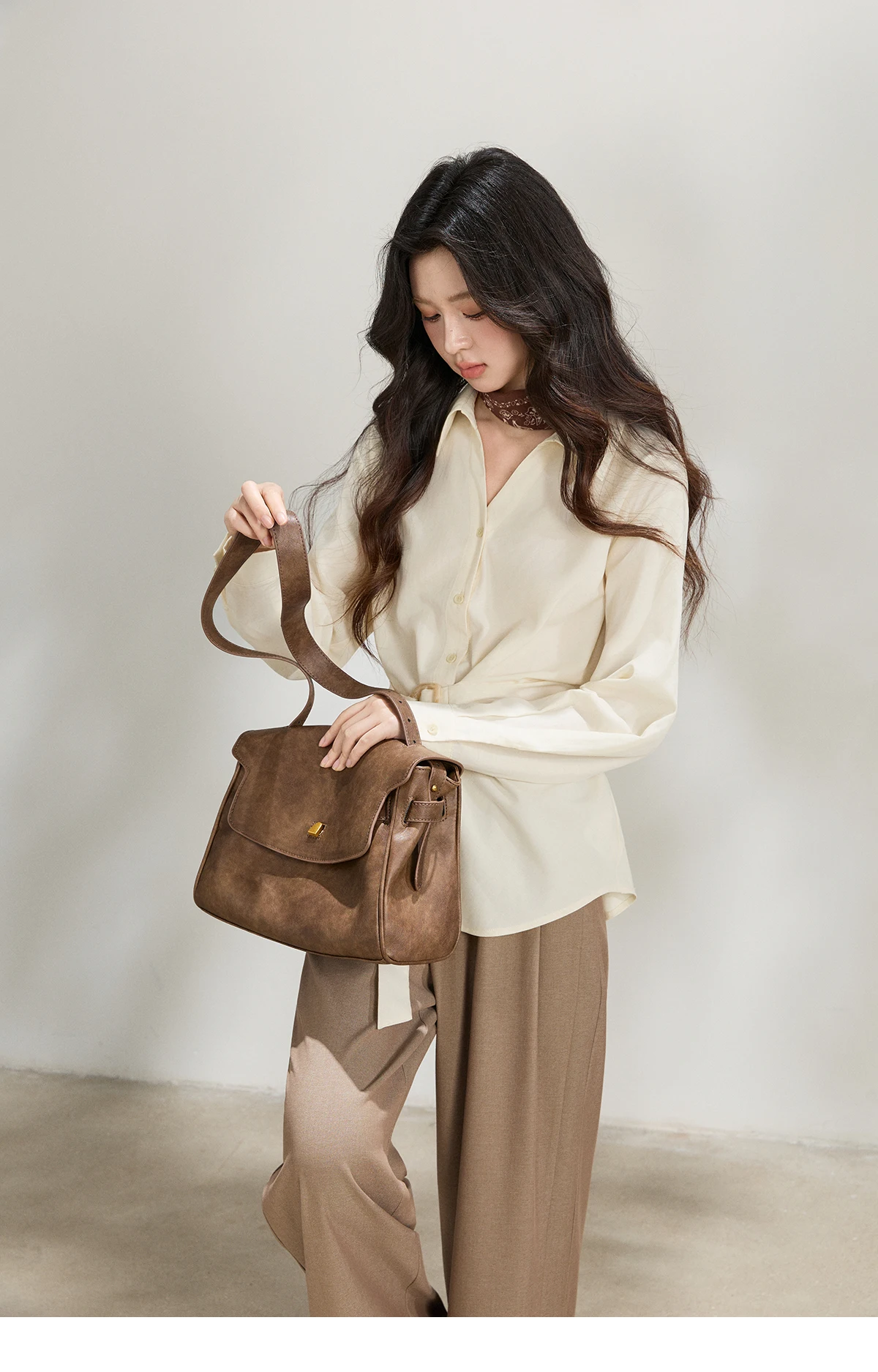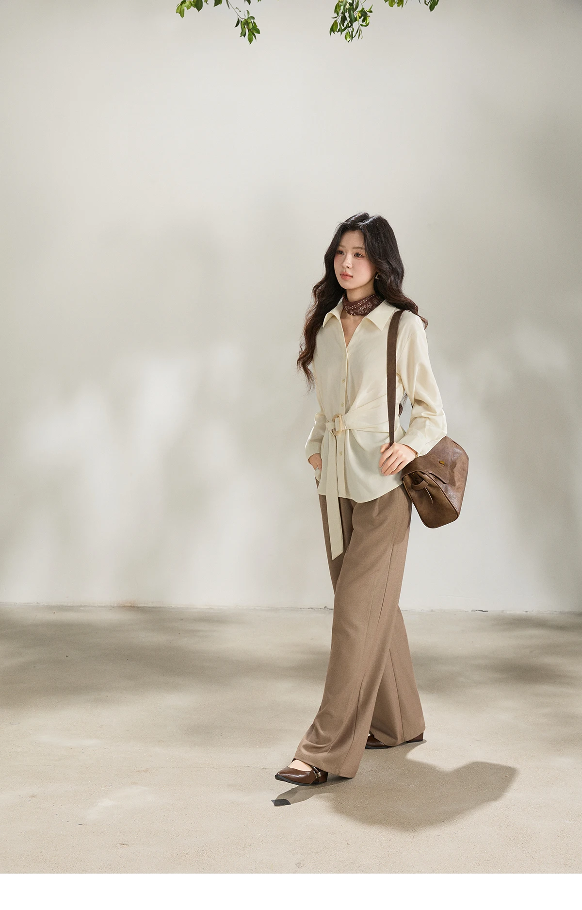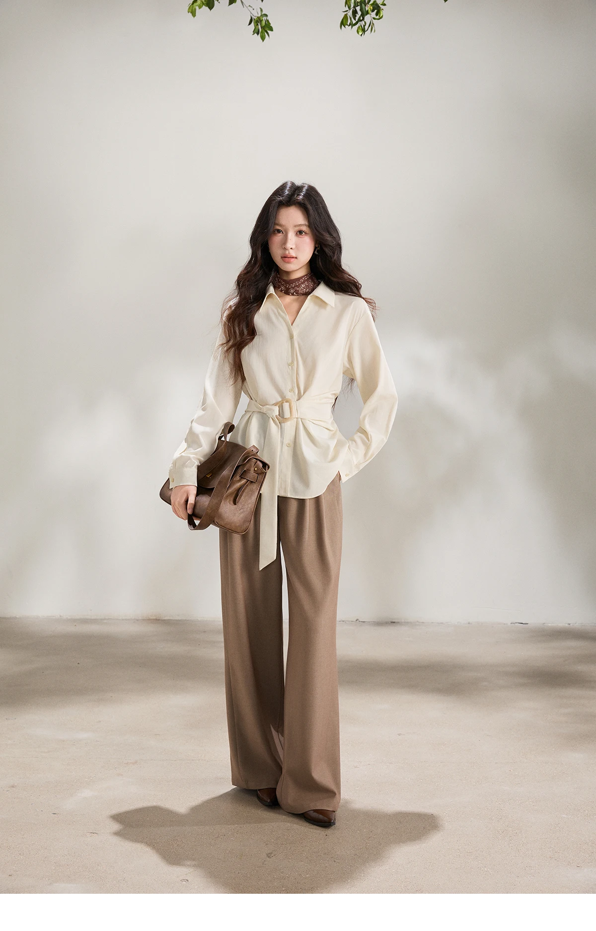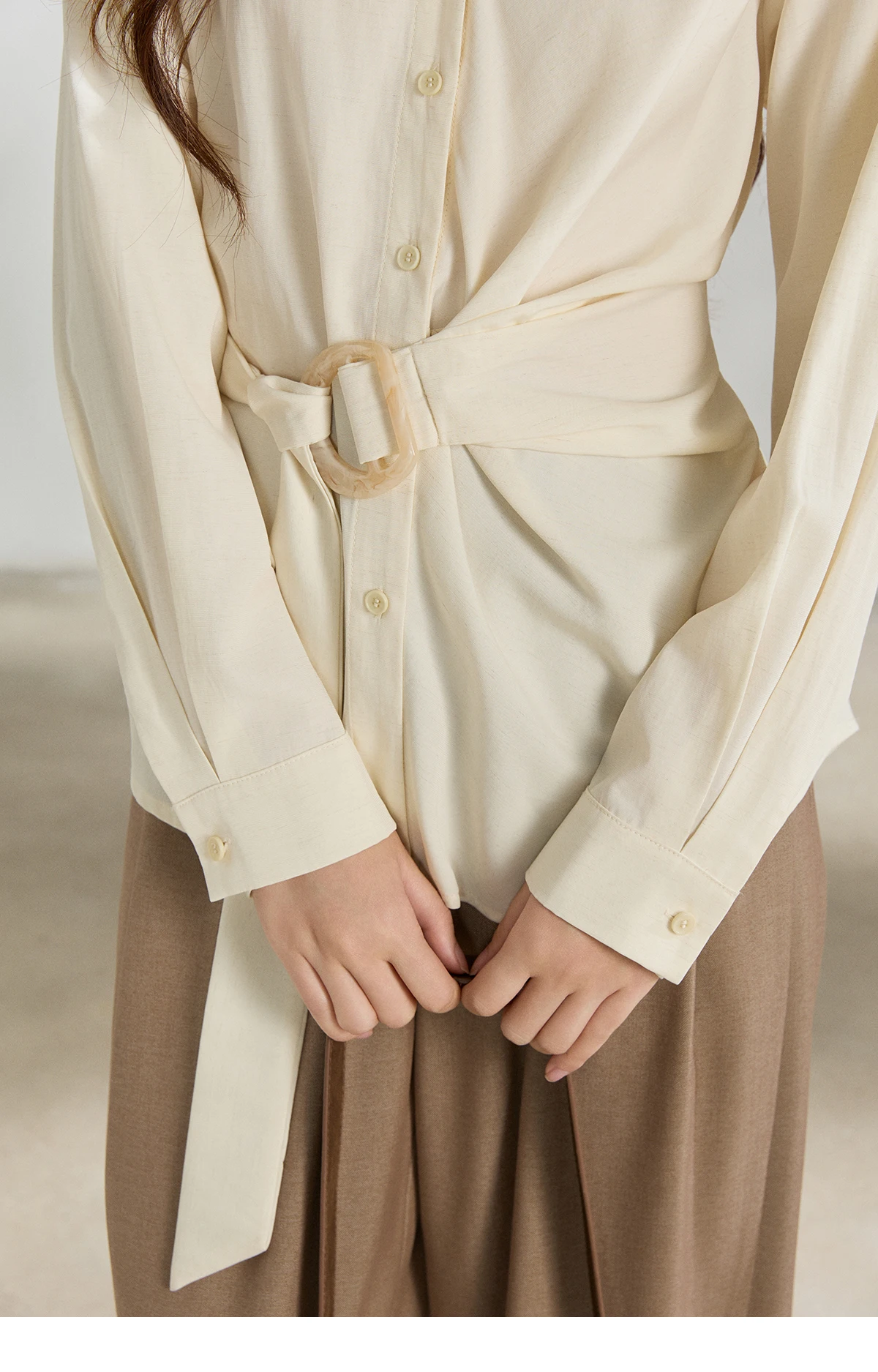 MISHOW Women's Lapel Collar Long Sleeve Shirt 2026 Spring with Belted Waist Casual Loose Soft Beige Shirt Office Lady MXF13C2452