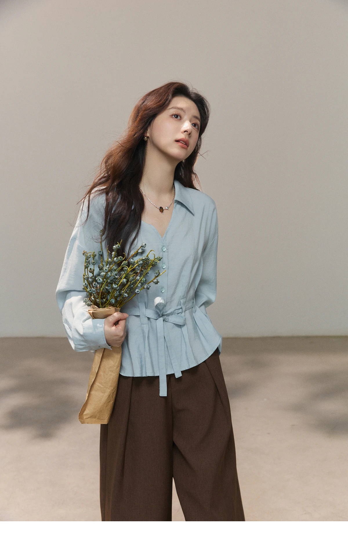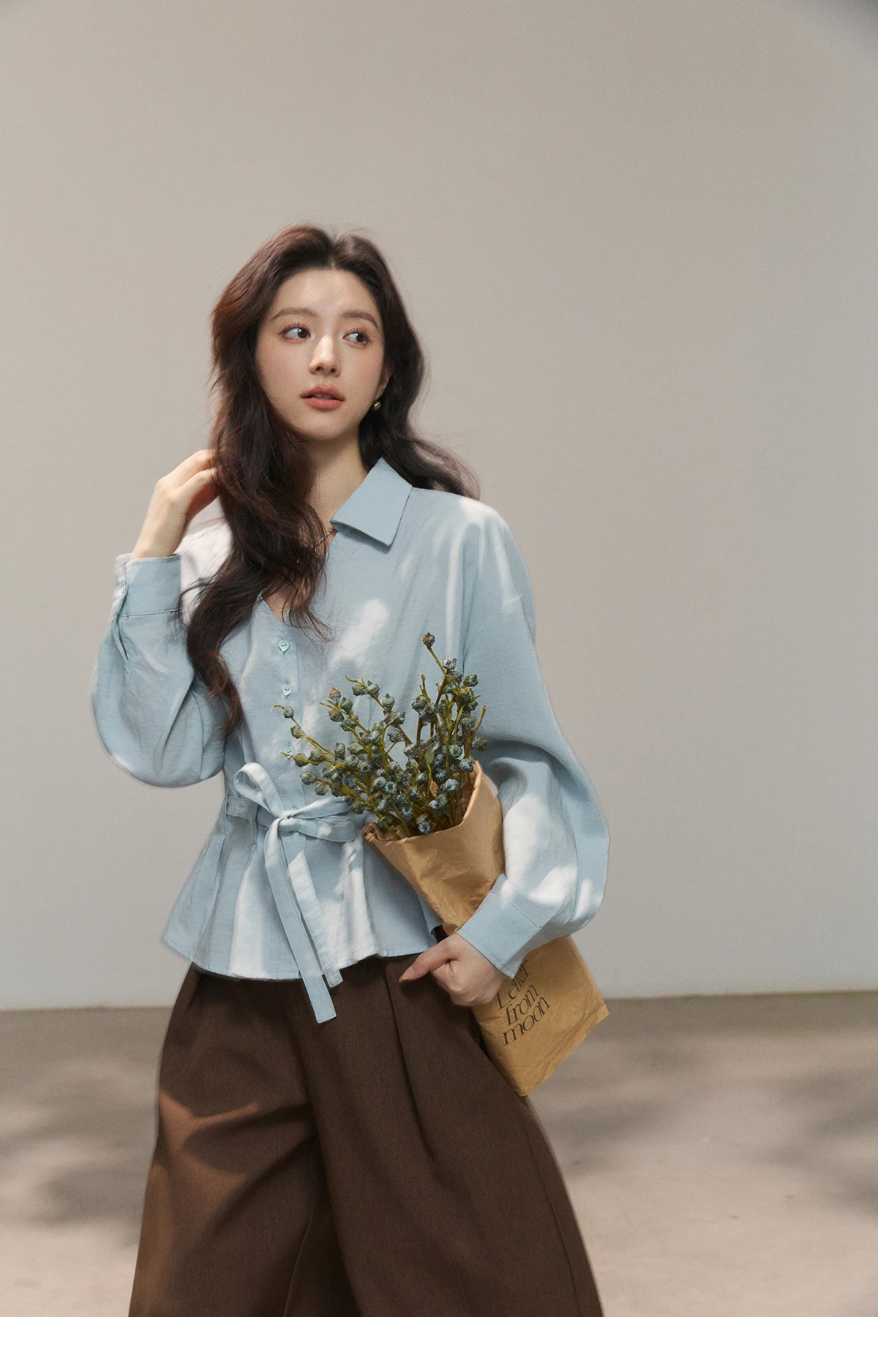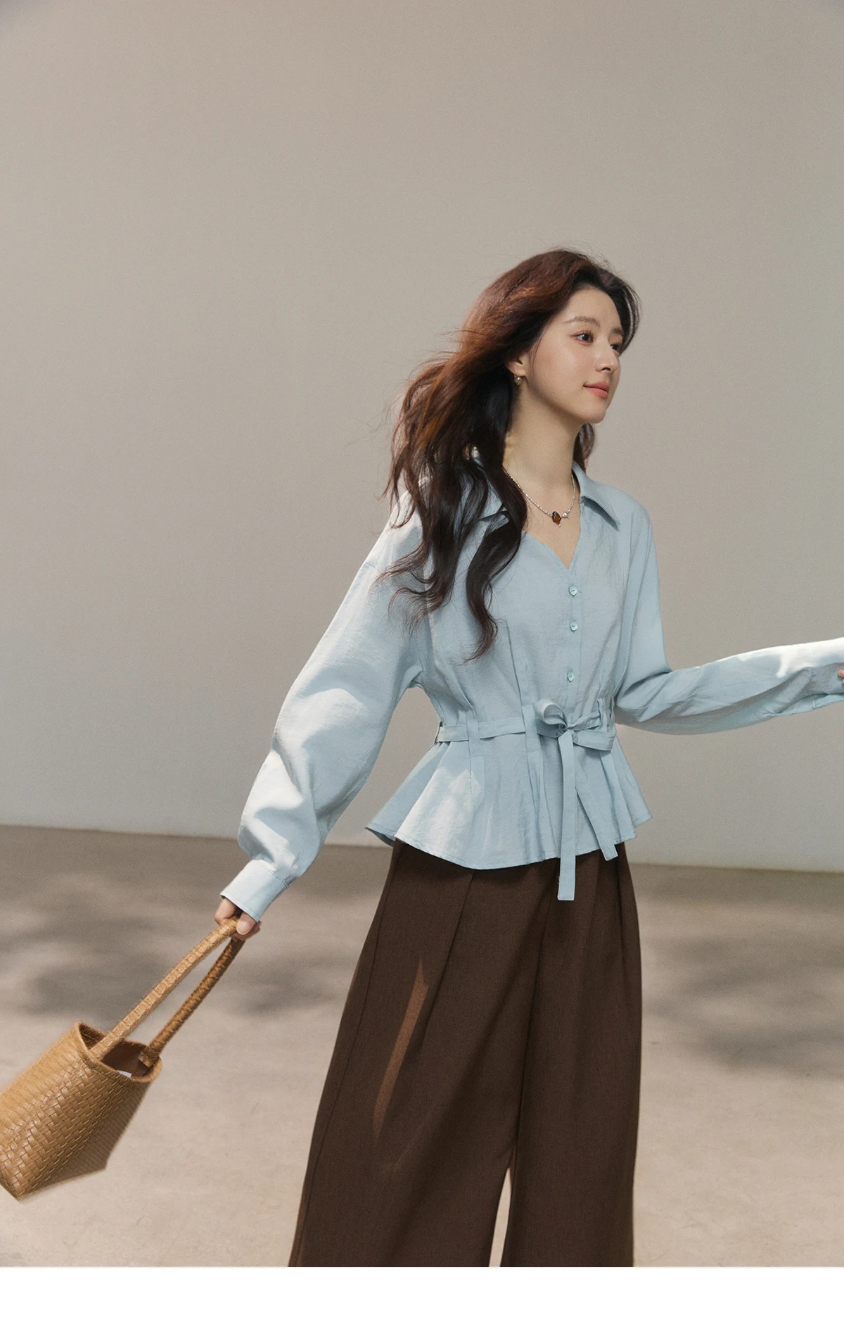 MISHOW Women's Light Blue Lyocell Shirt 2026 Spring Polo Neck V-neck Belted Waist Shirt Casual Peplum Long Sleeve Top MXF13C2437
