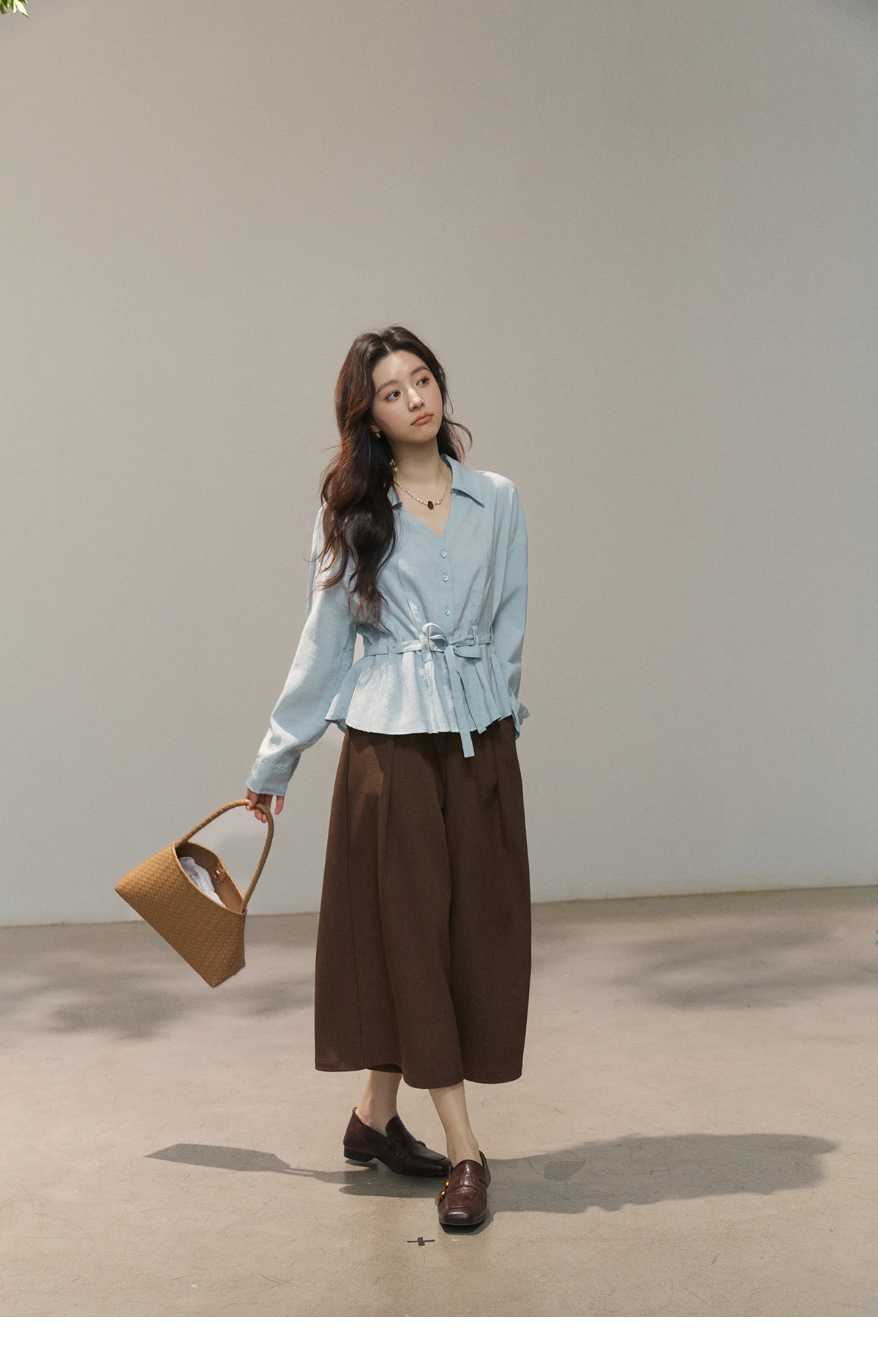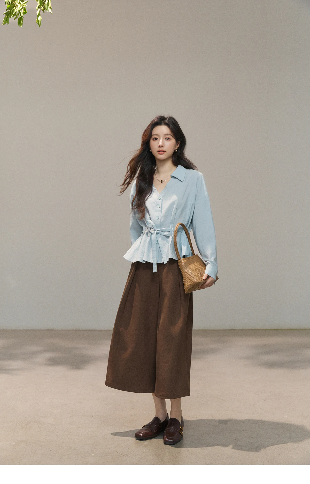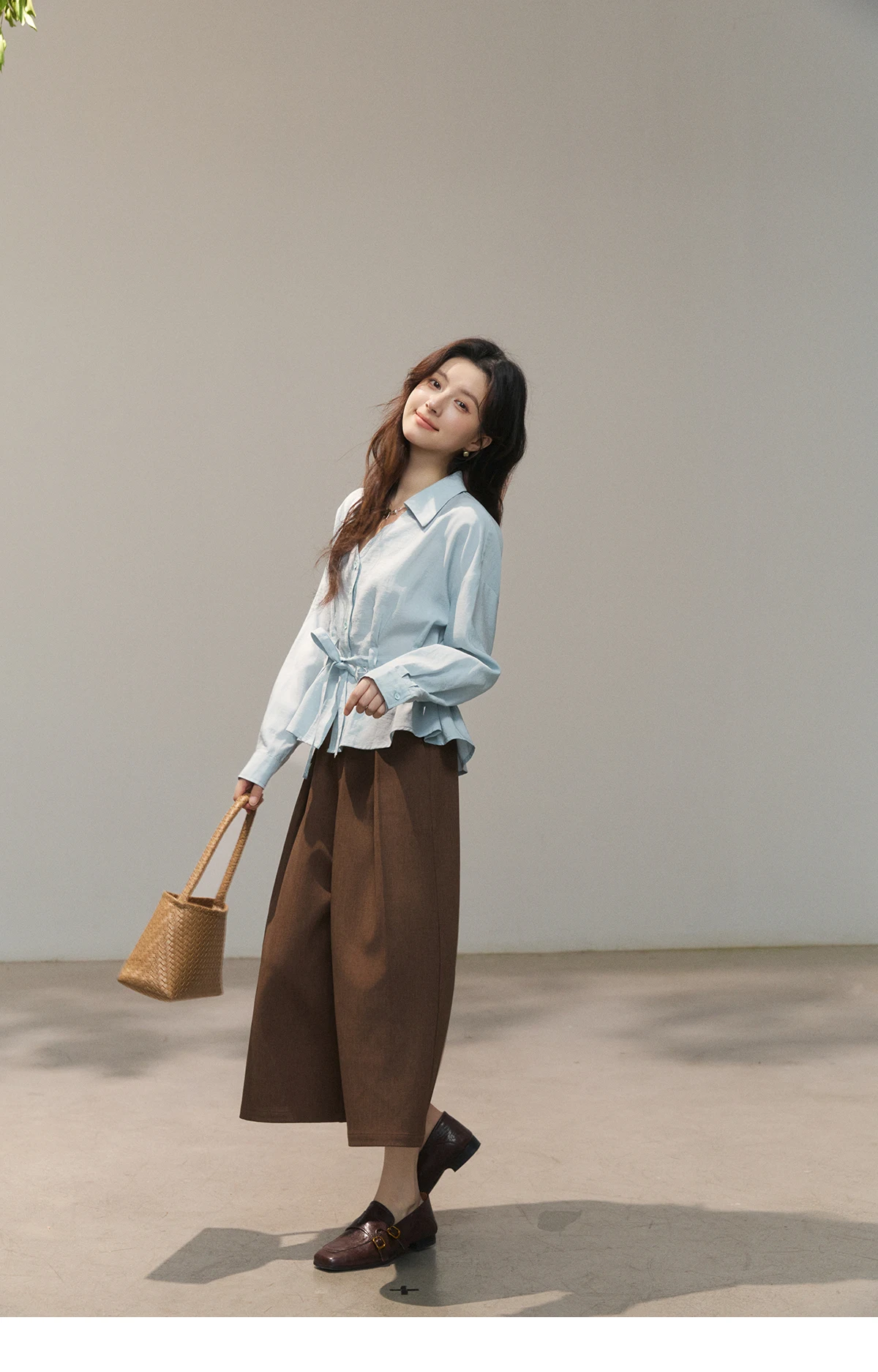 MISHOW Women's Light Blue Lyocell Shirt 2026 Spring Polo Neck V-neck Belted Waist Shirt Casual Peplum Long Sleeve Top MXF13C2437