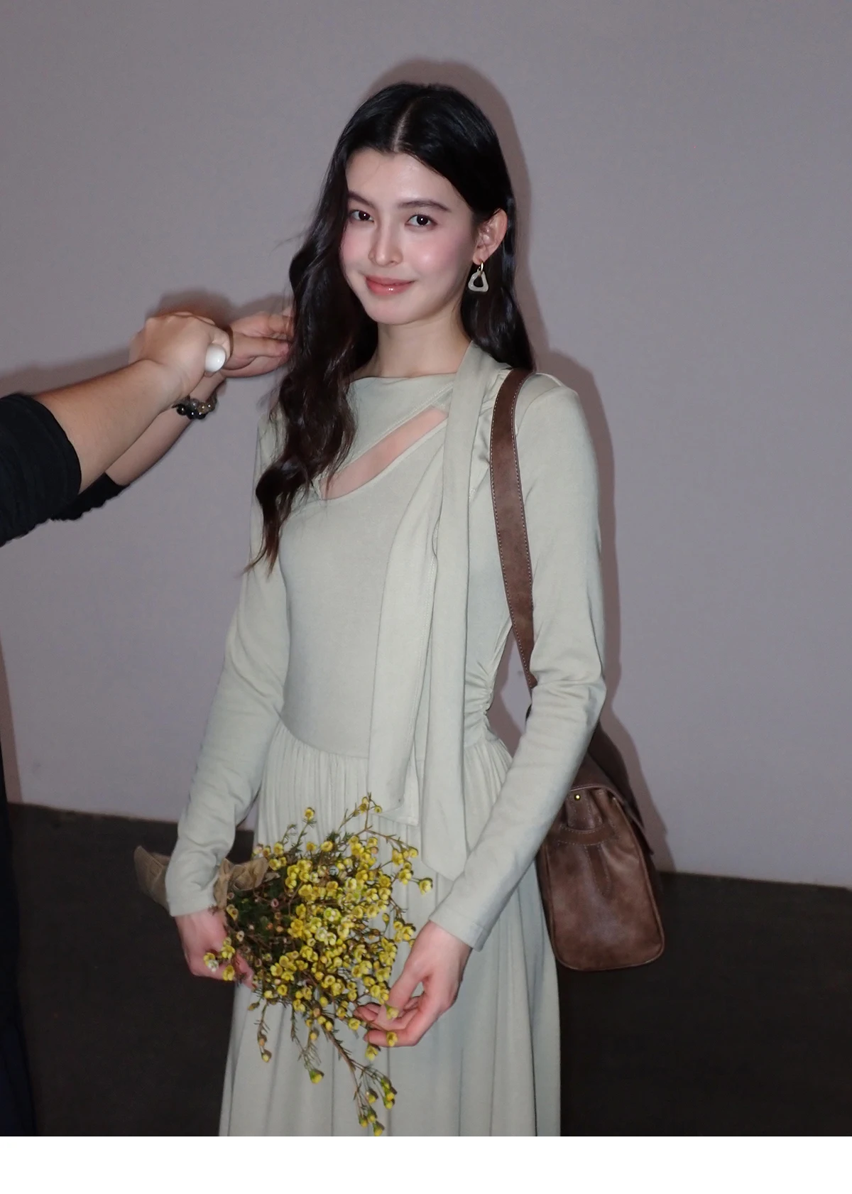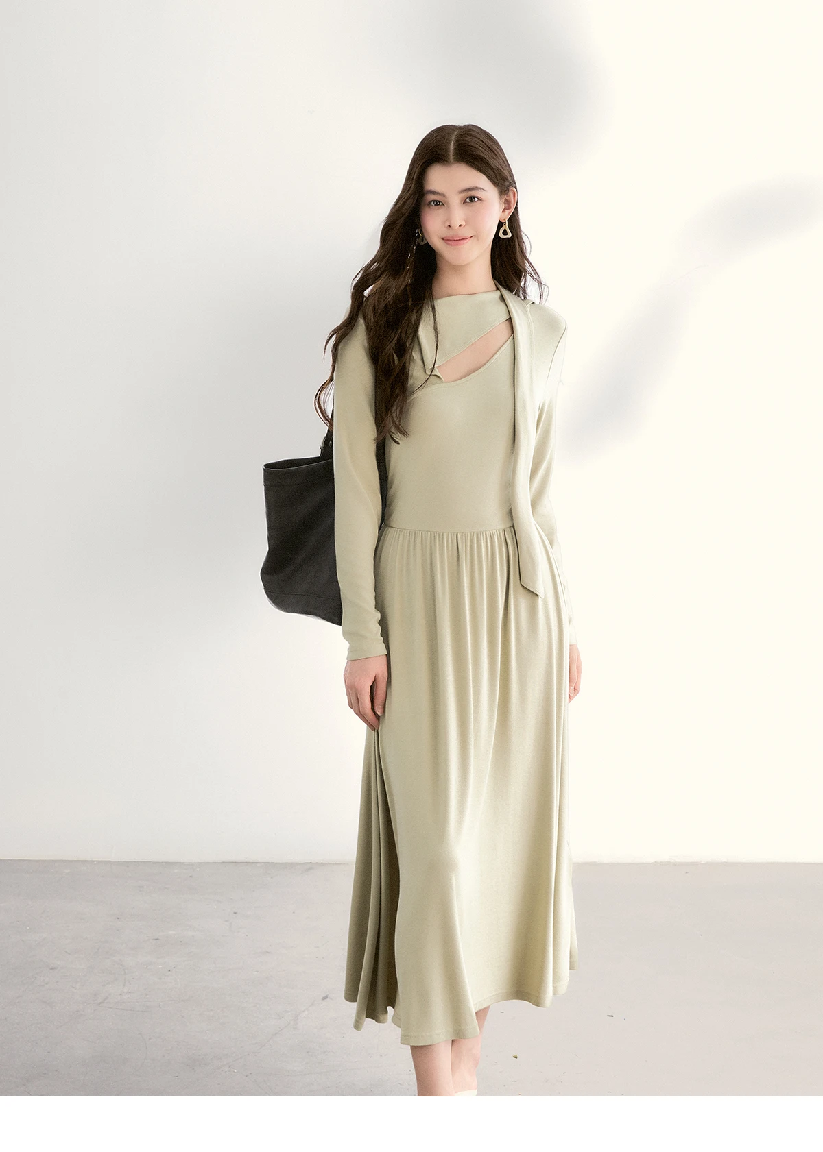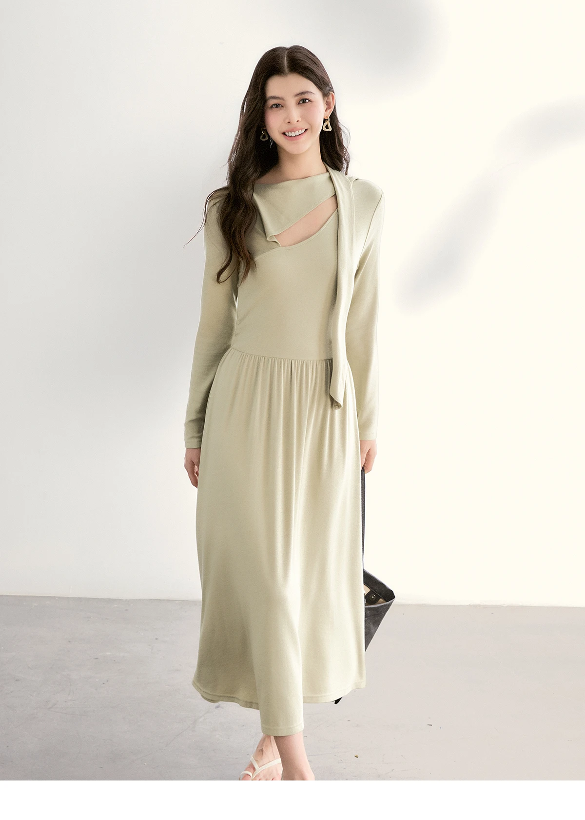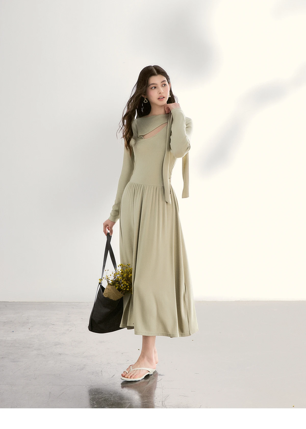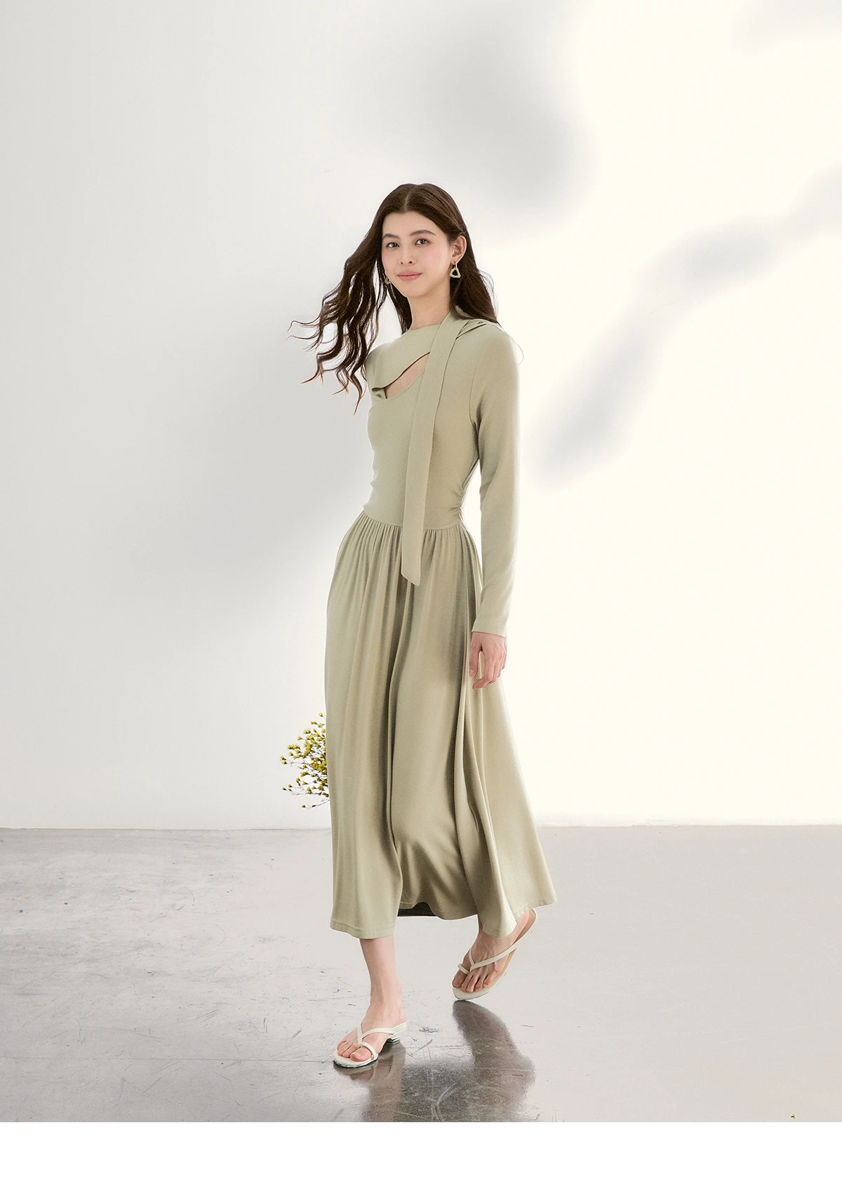 MISHOW Women's Light Green Midi Dress 2026 Spring Cutout Neck Hollow Out Ribbon Dresses Elegant Long Sleeve Dress MXF13L2556