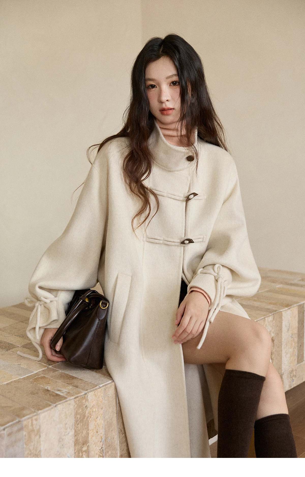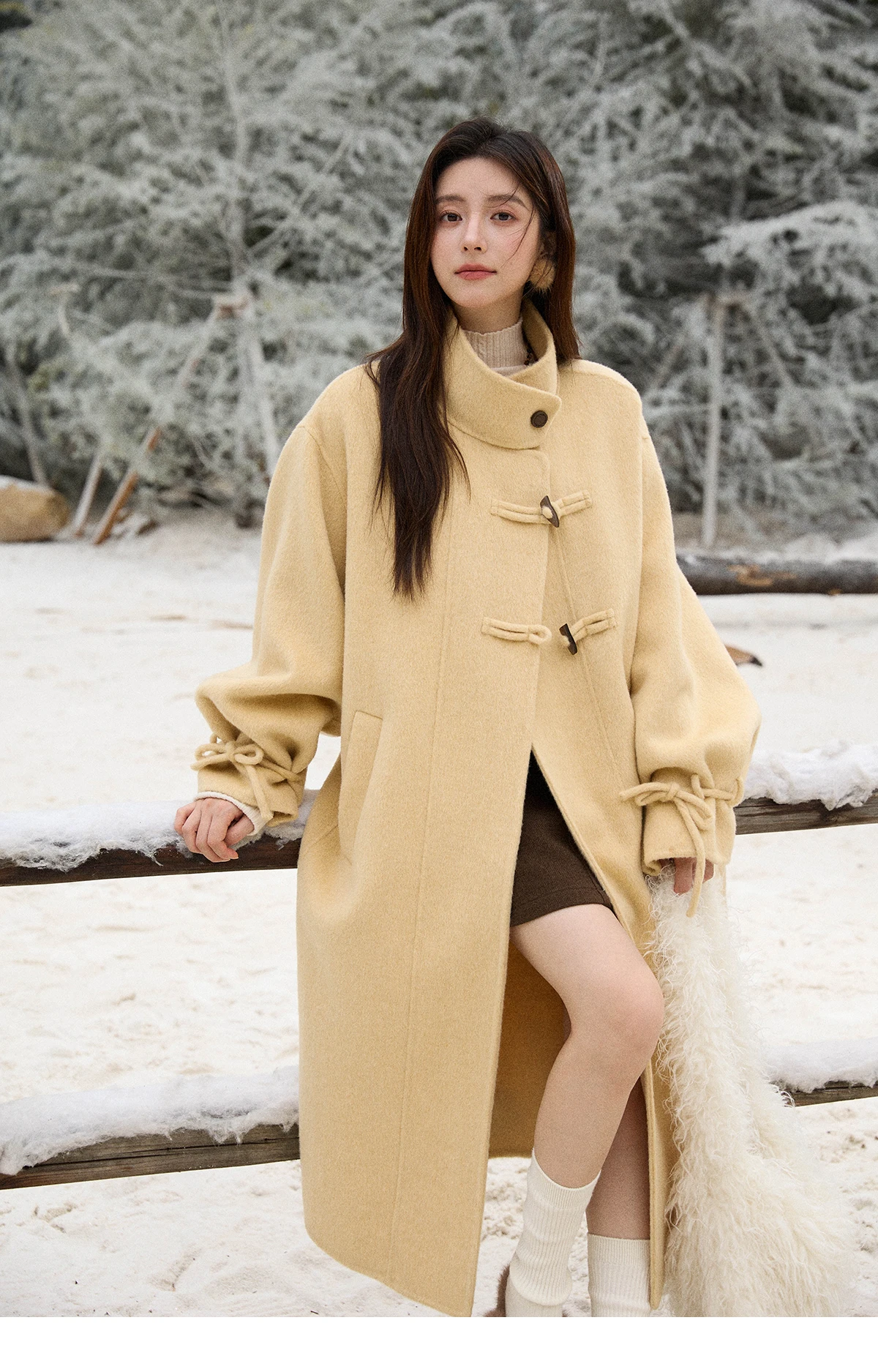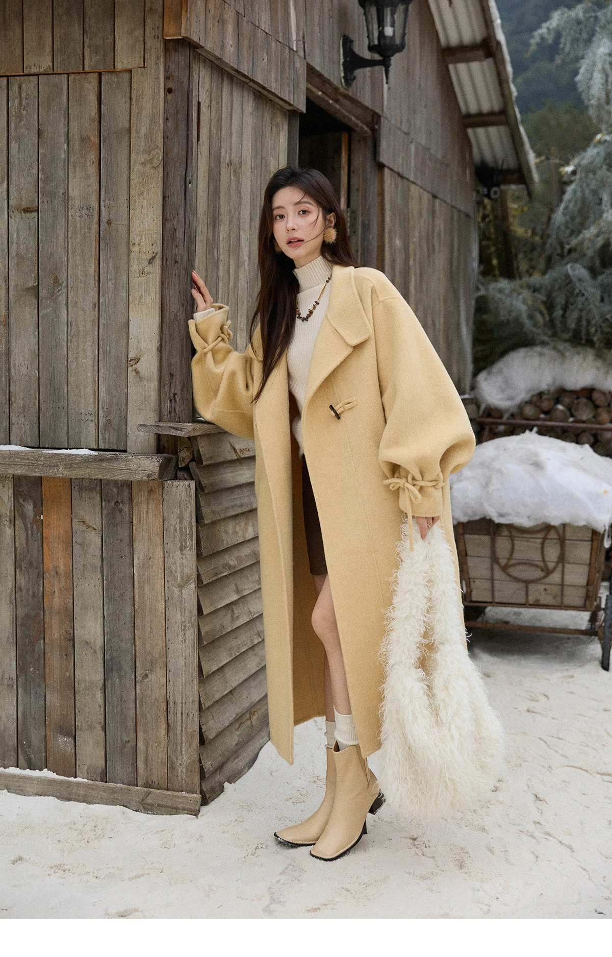 MISHOW Women's Long Coats 2025 Winter Yellow Double-faced 100% Wool Coat Windproof Lantern Sleeve Turtleneck Coat MXE51W0902