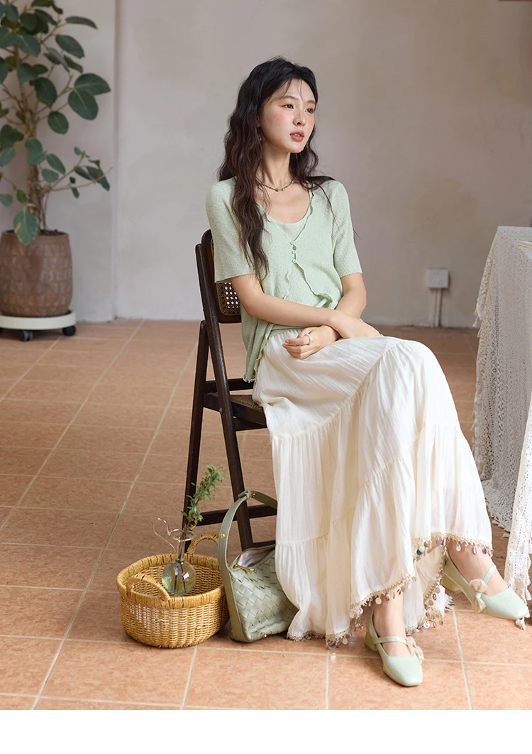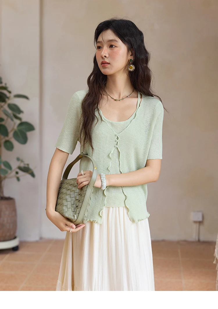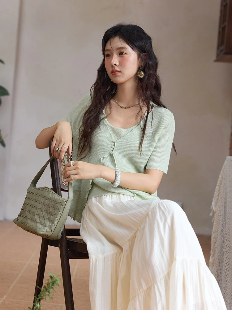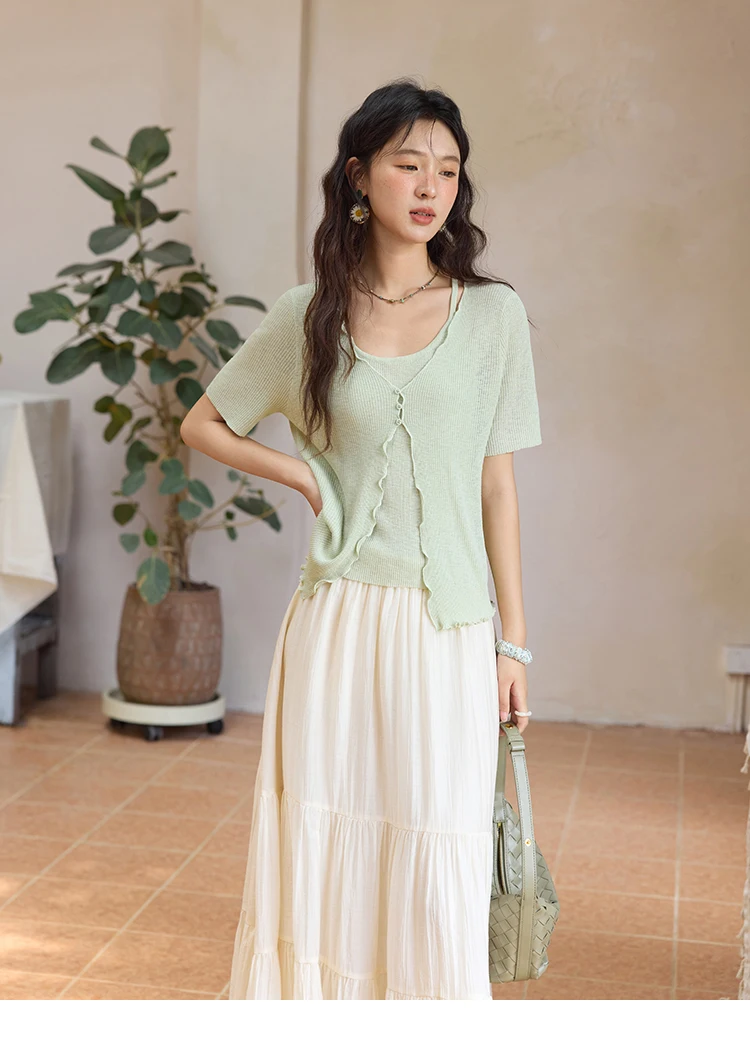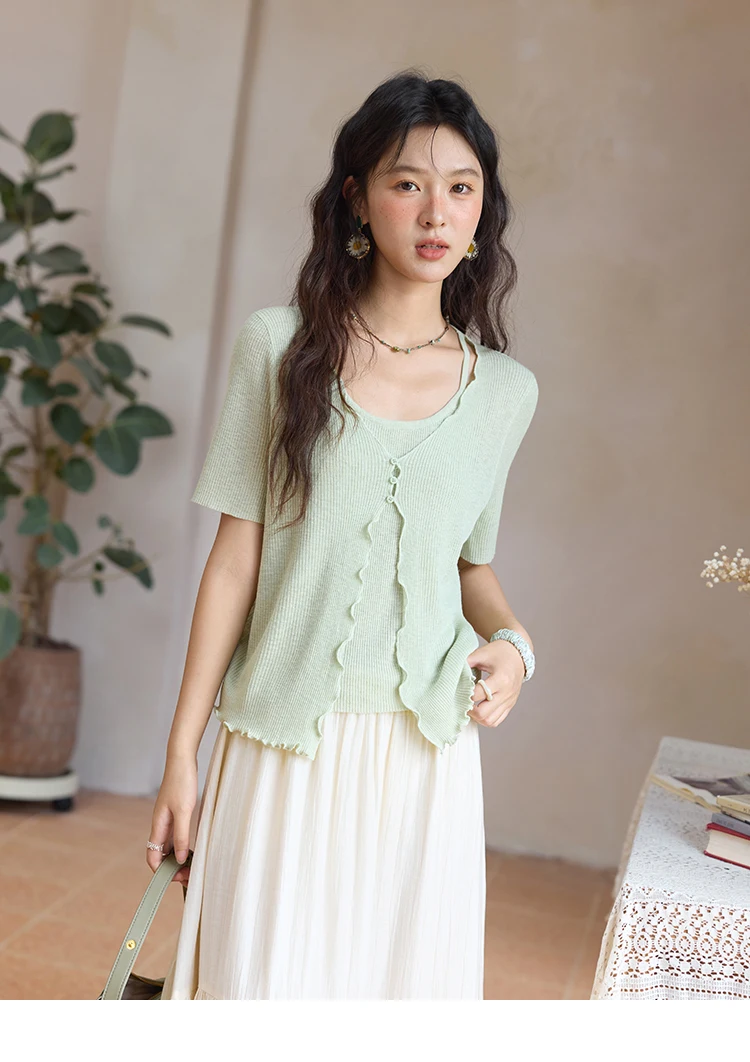 MISHOW Women's Mint Green Fake Two Piece Short Sleeved Knitted Cardigan 2025 Summer Solid Color Loose Comfortable Top MXE36Z1286