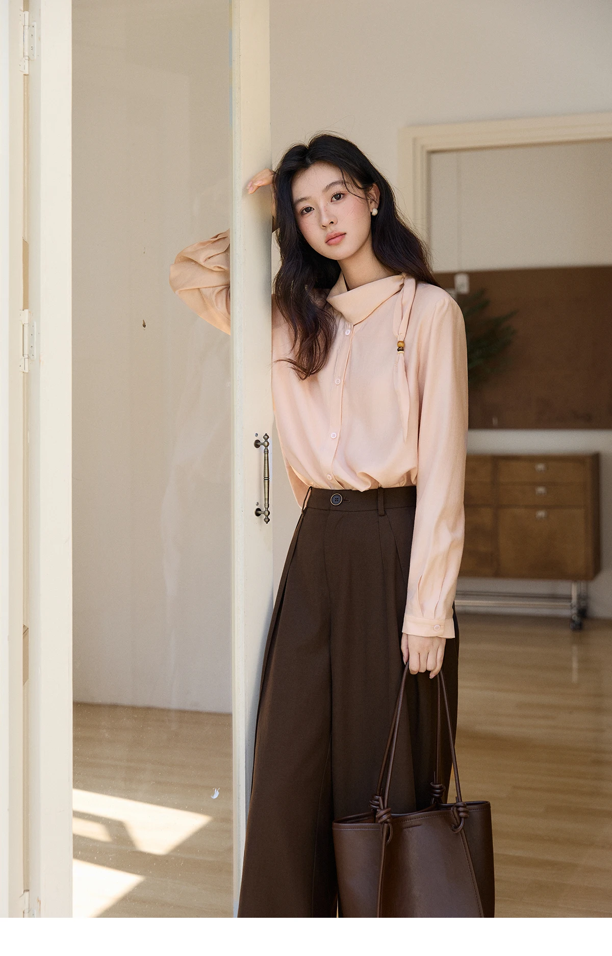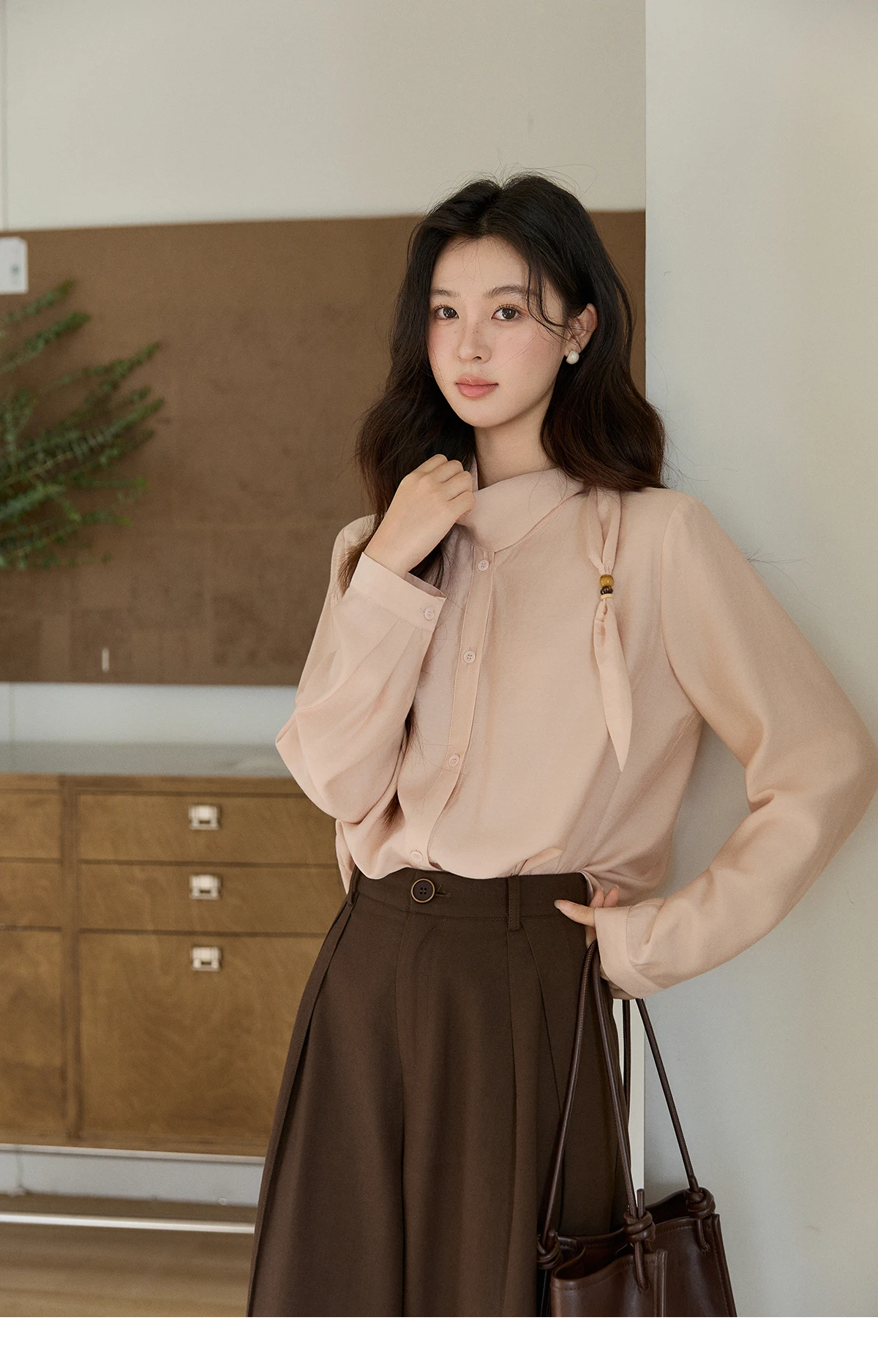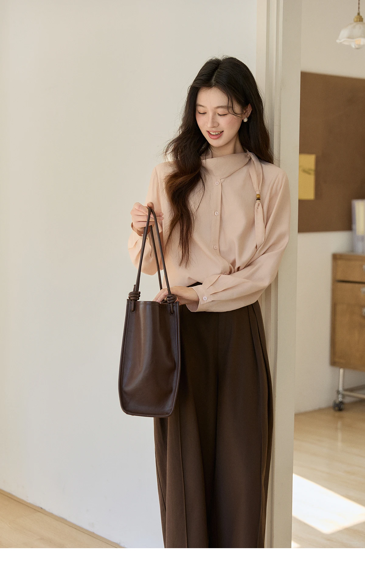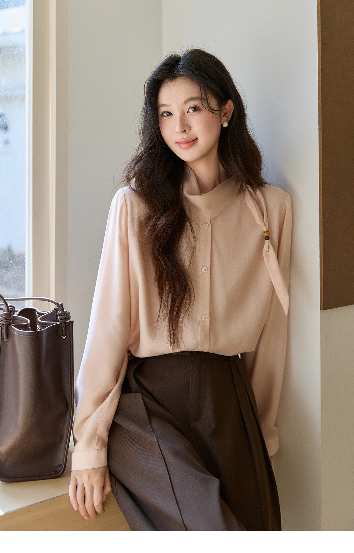 MISHOW Women's Nude Pink Shirt Spring Versatile Ribbon Stand Neck Shirts Button-Down Casual Commute Long Sleeve Top MXE11X2547