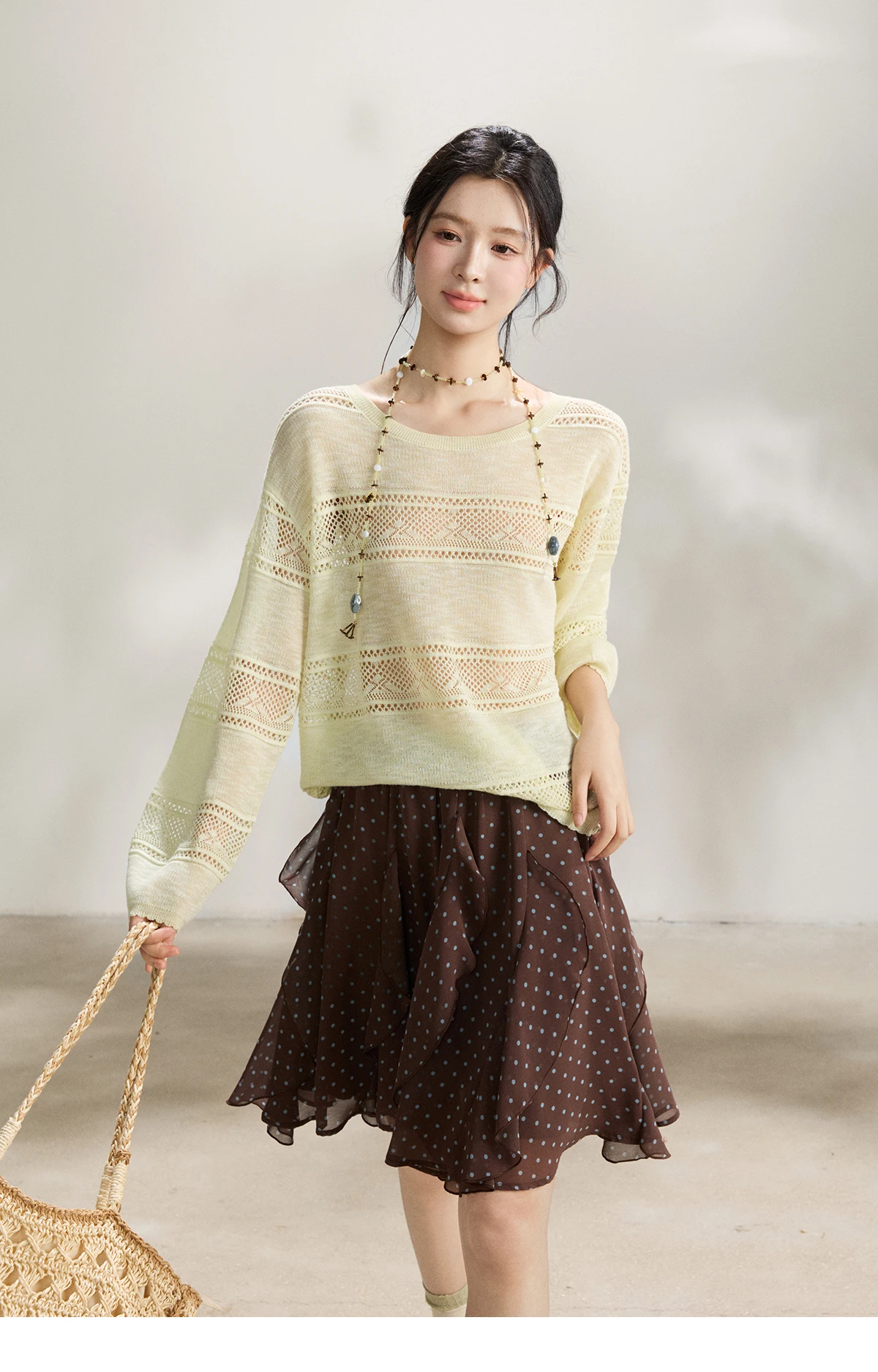MISHOW Women's Pale Yellow Knit Top 2026 Spring Crew Neck Hollow Out Striped thin tops Casual Loose Sheer Sweater MXF13Z3020