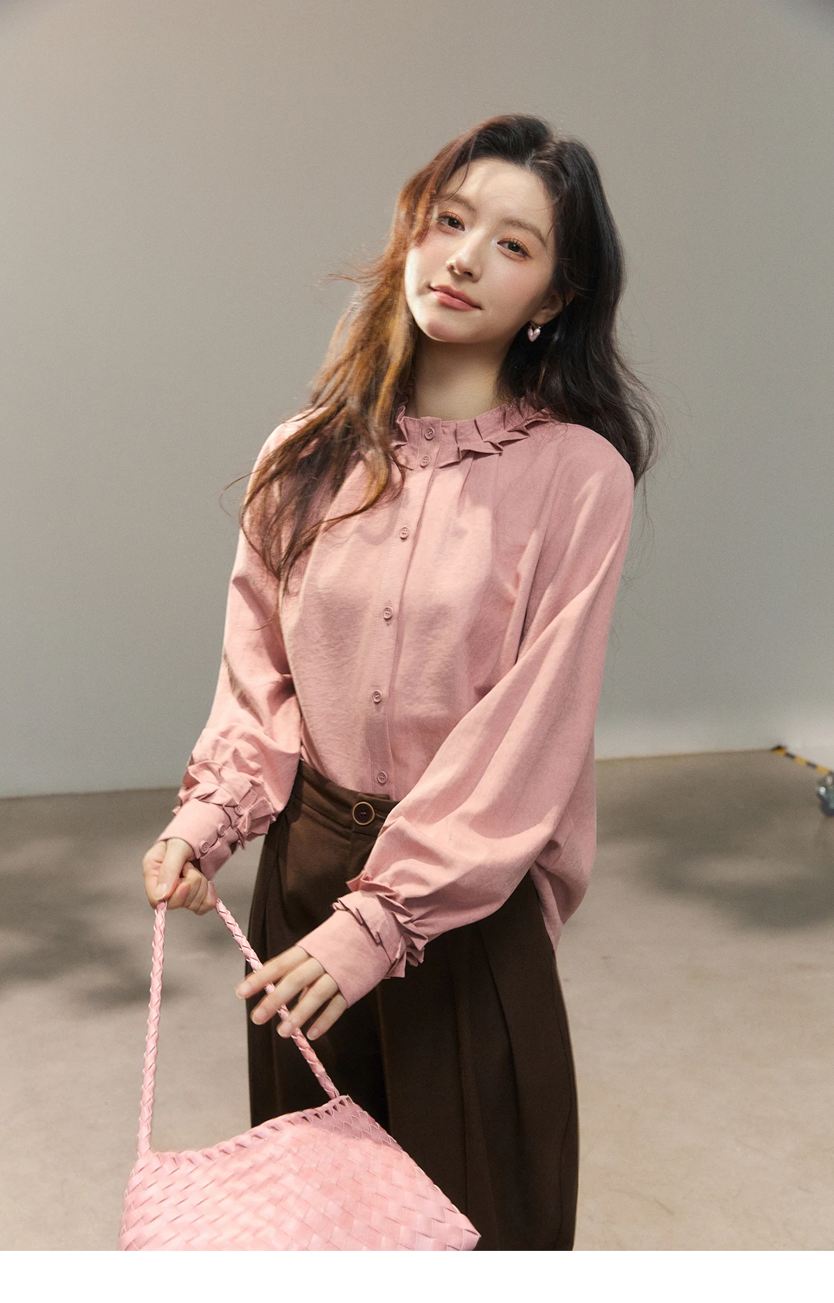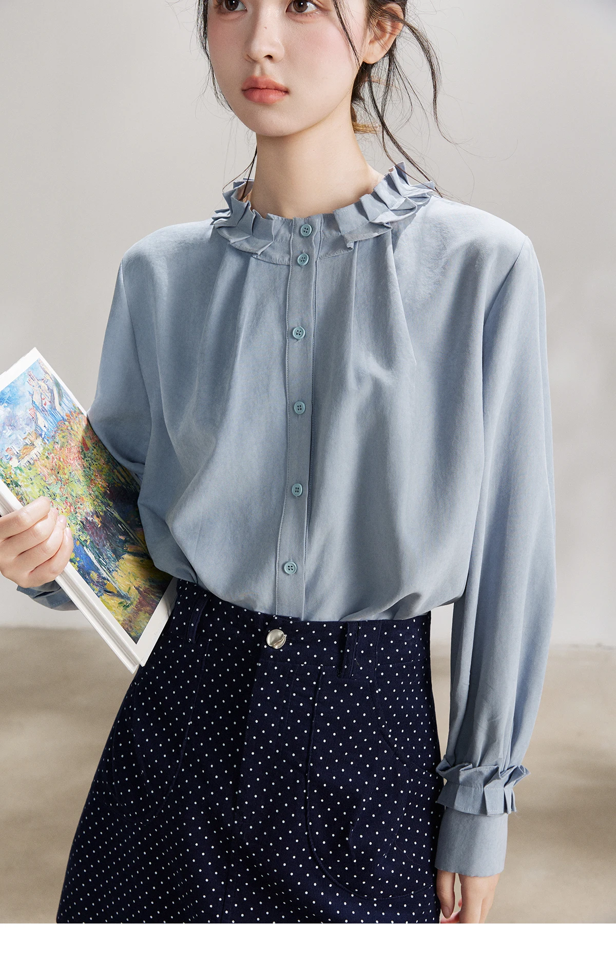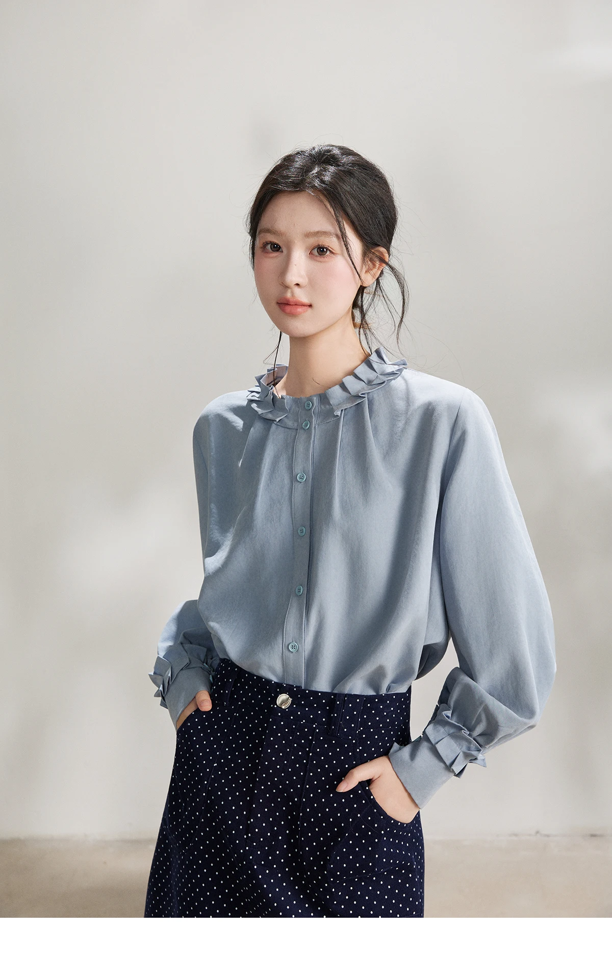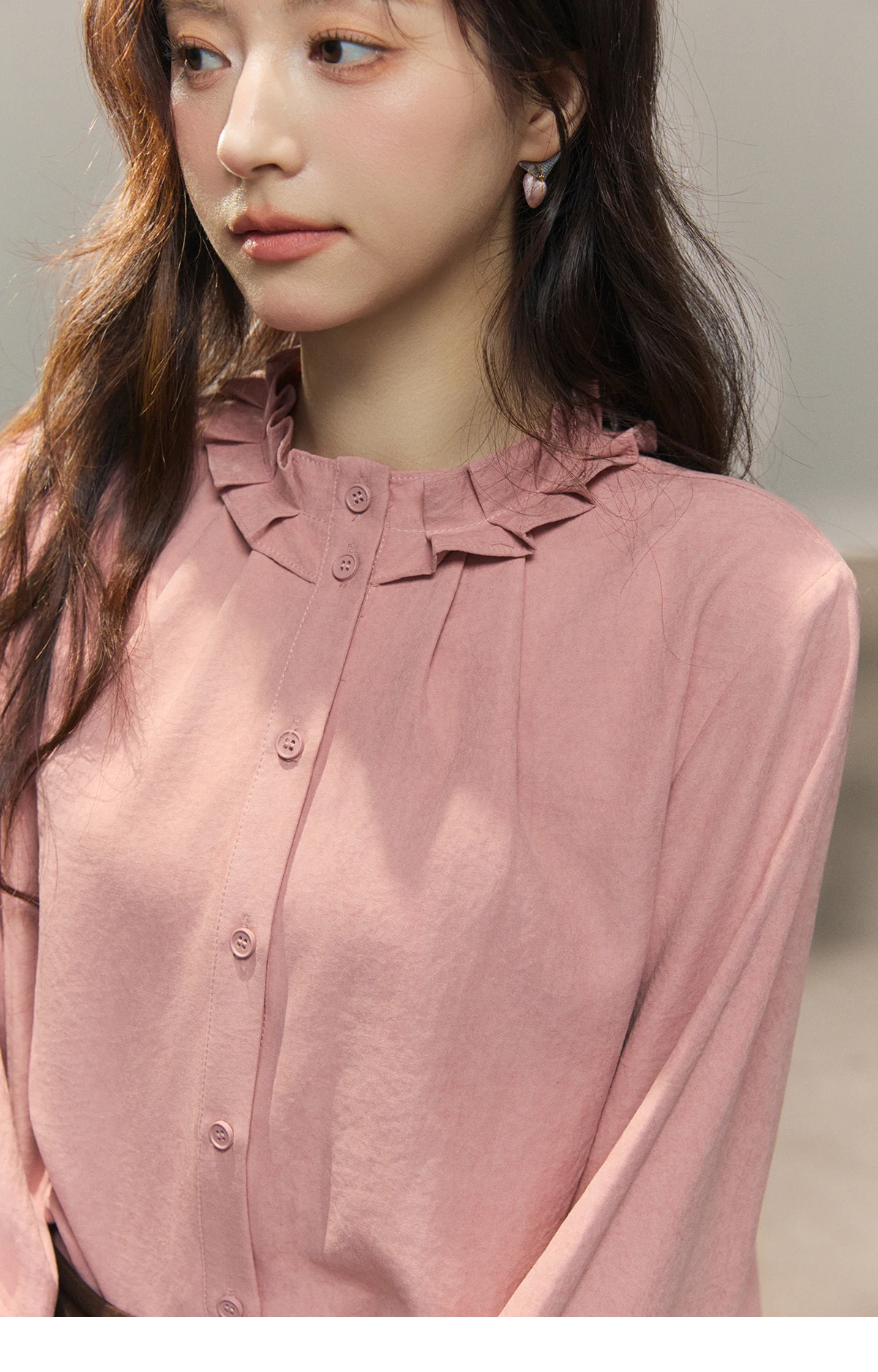 MISHOW Women's Peach Skin Solid Shirt 2026 Spring Ruffled Crew Neck Single-breasted Tops Casual Long Sleeve Shirts MXF11C2431