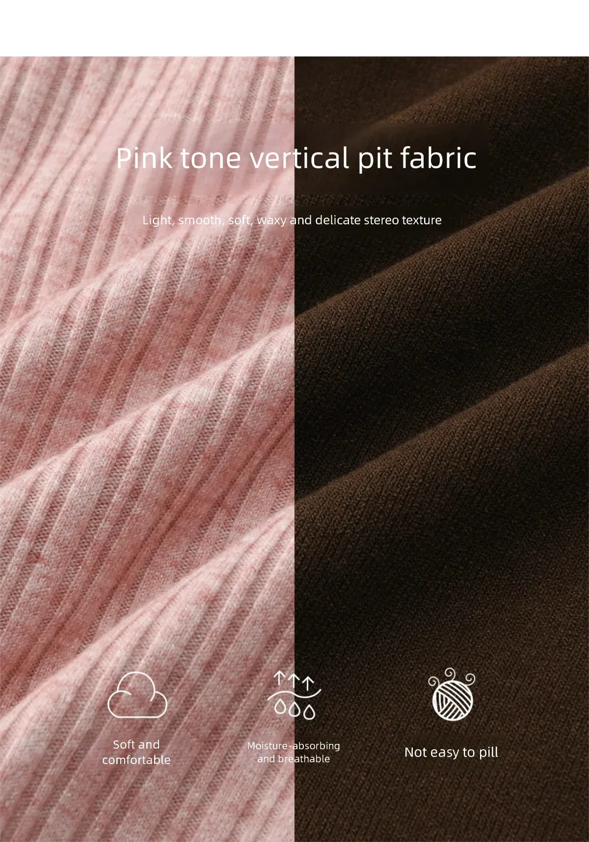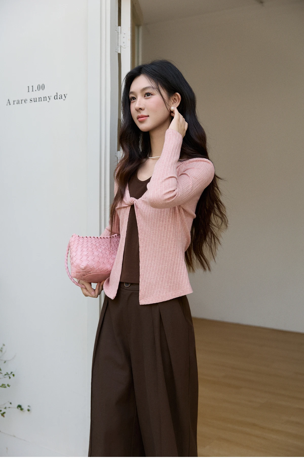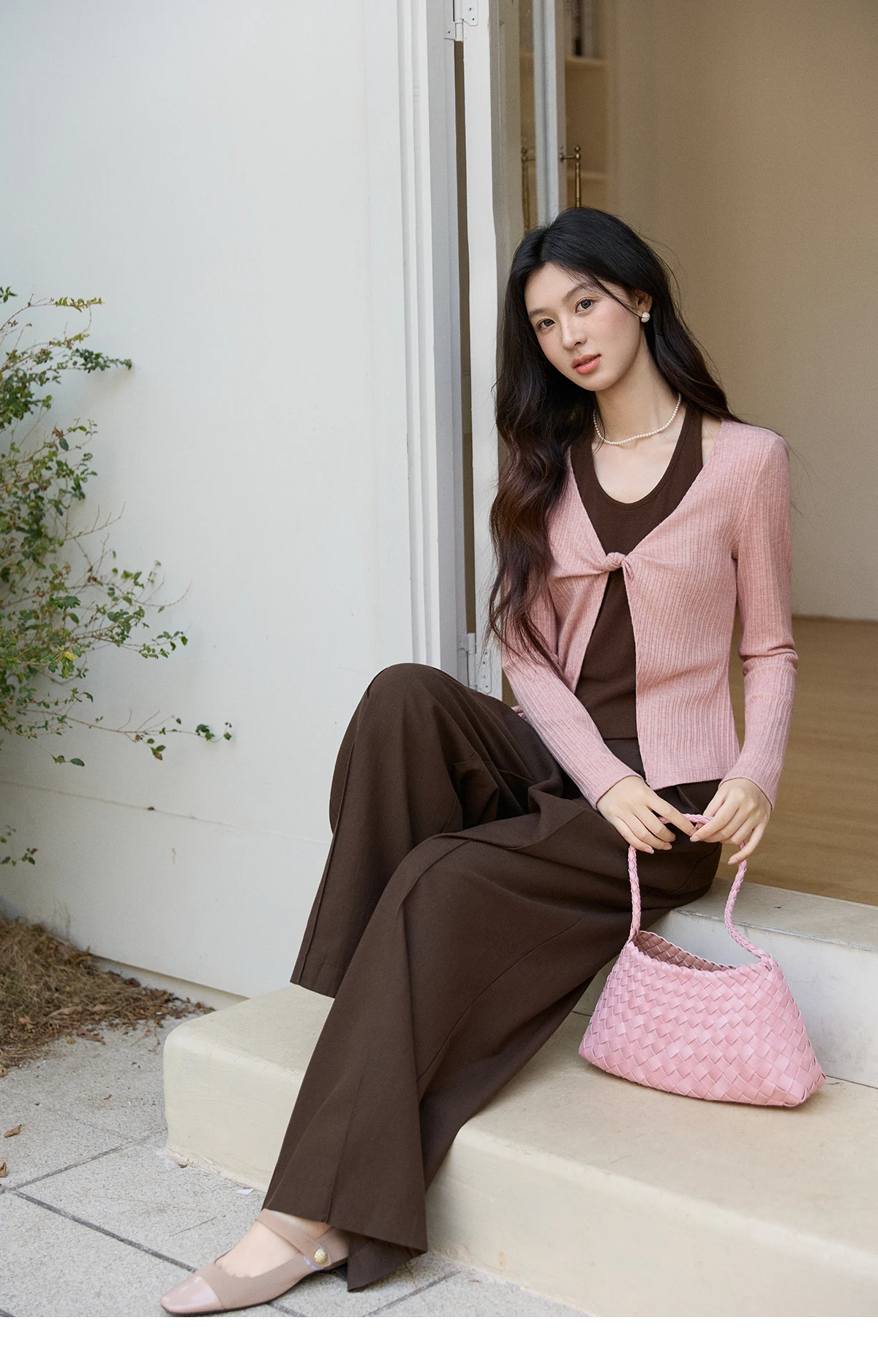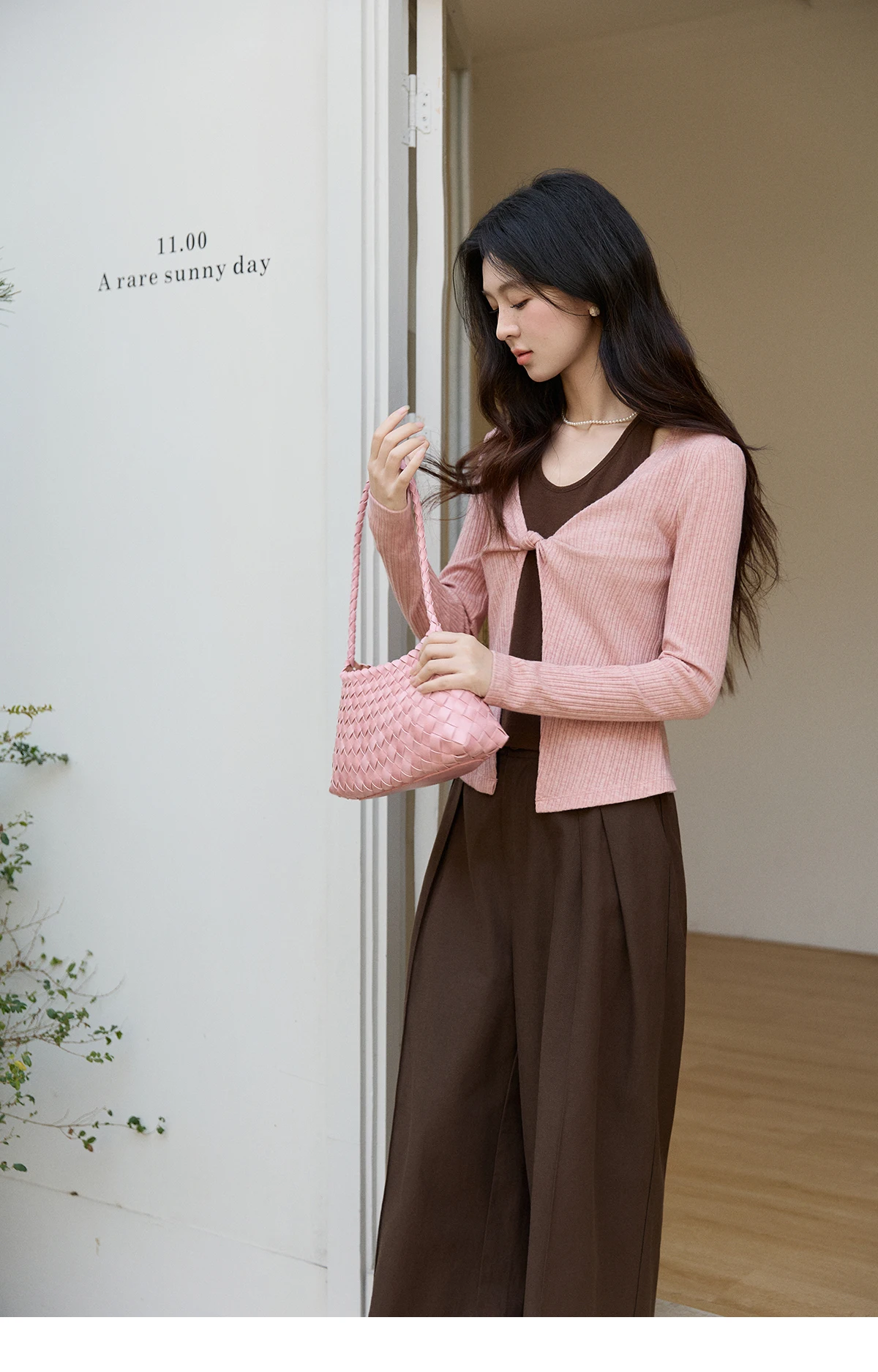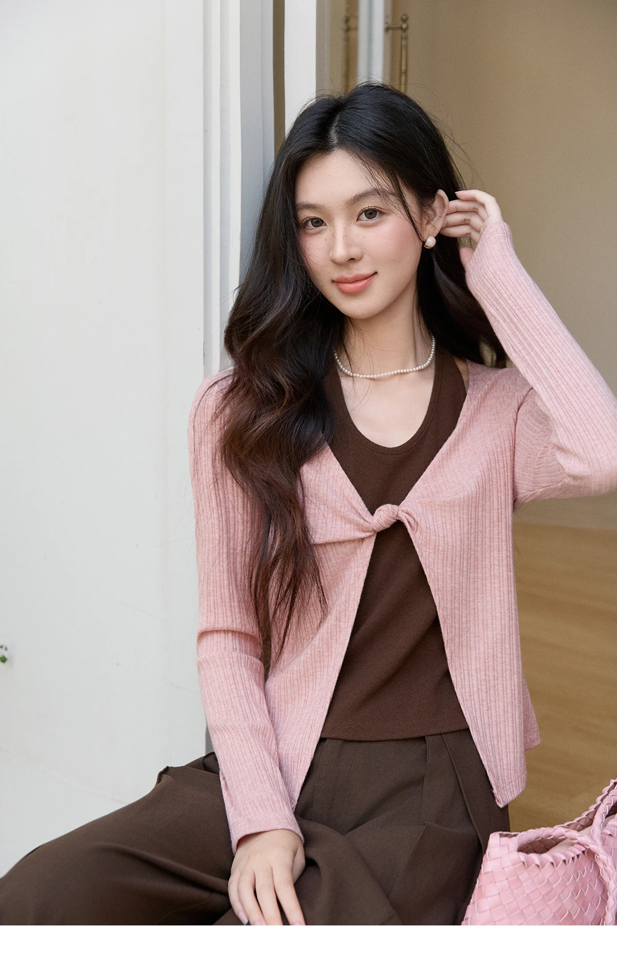 MISHOW Women's Pink Brown Fake Two-Piece Top 2026 Spring Ribbed Knit Knot Front Thin Top U-Neck Long Sleeve Slim Tops MXF11Z2912