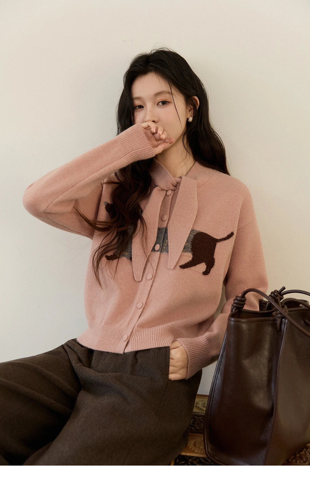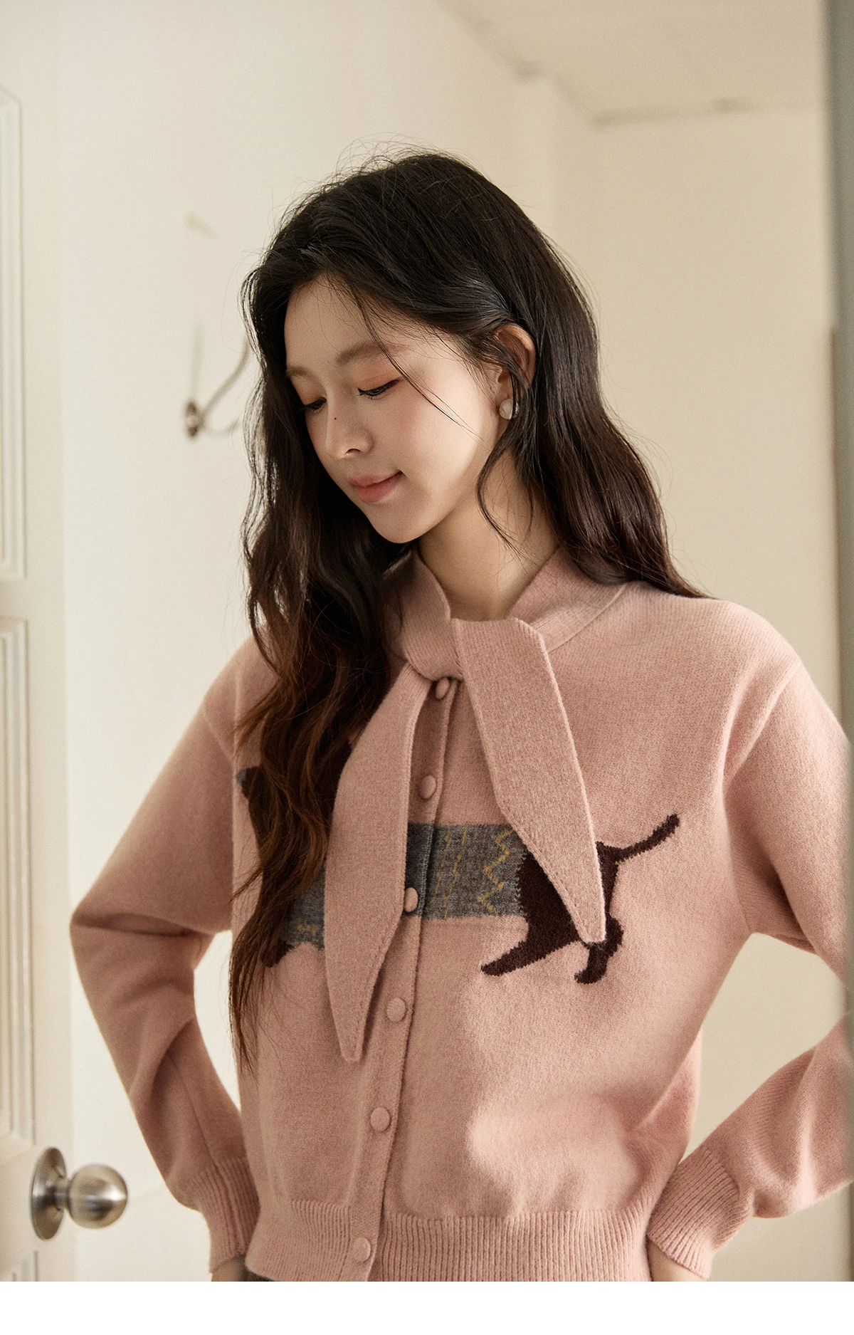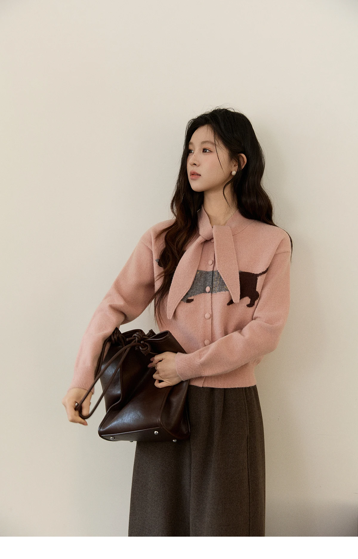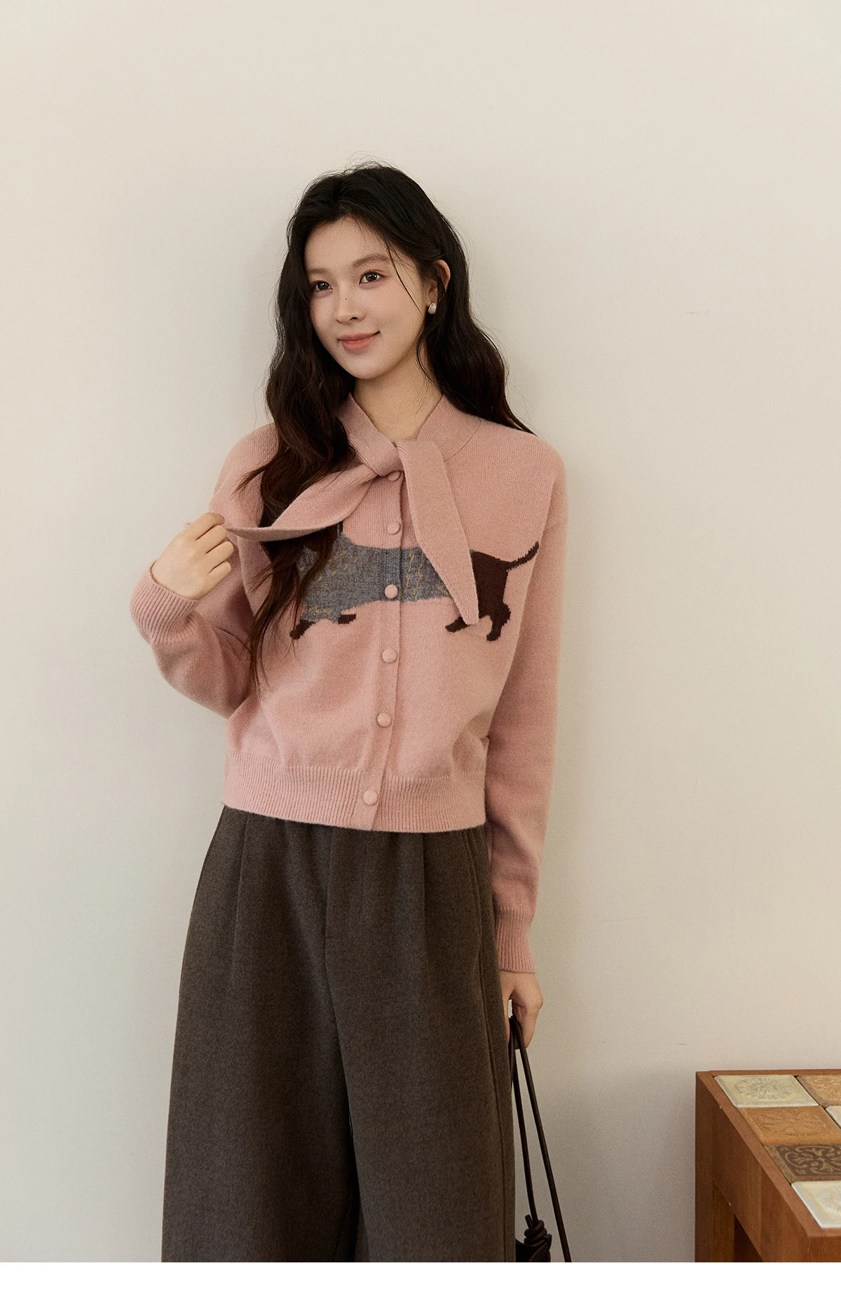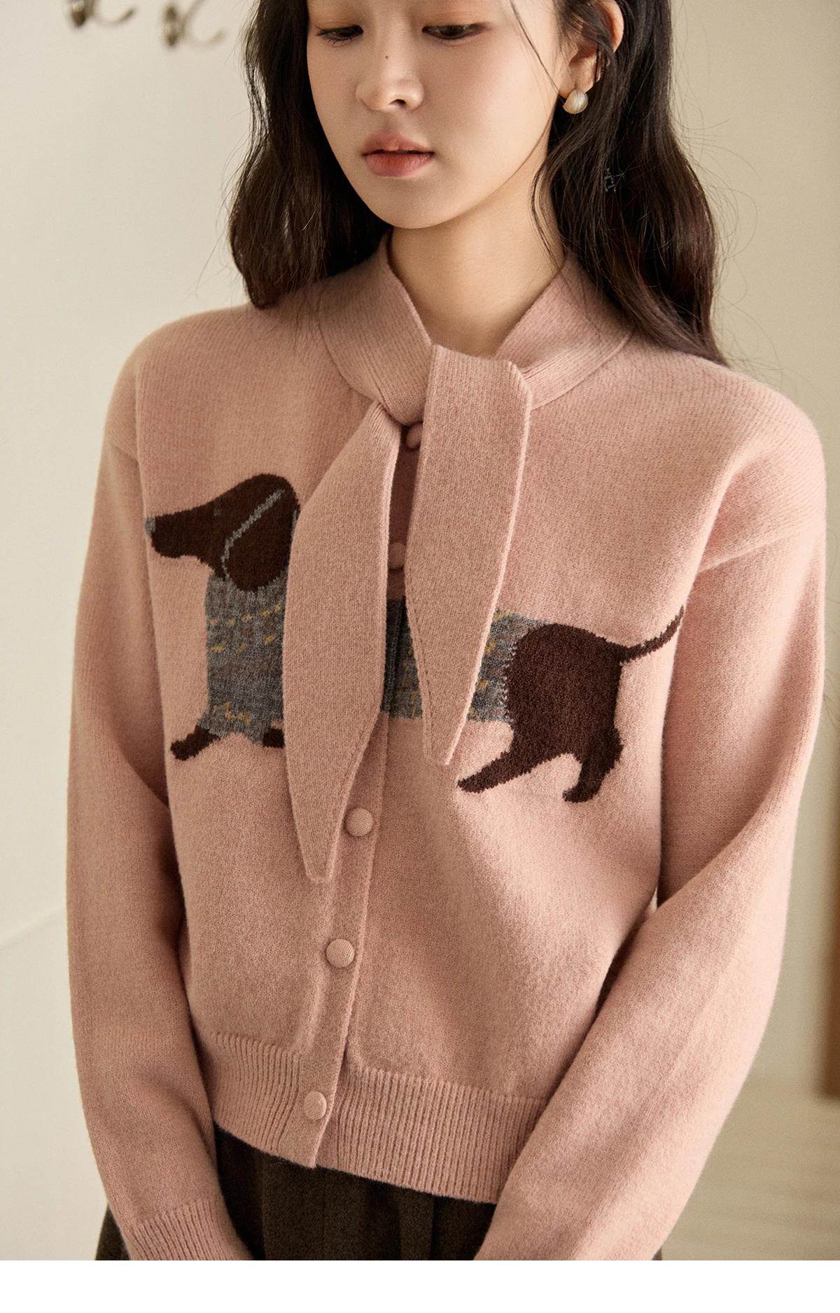 MISHOW Women's Pink Knit Cardigan 2025 Autumn Winter Dachshund Pattern Bow Collar Sweaters Single-breasted Loose Tops MXE94Z2997