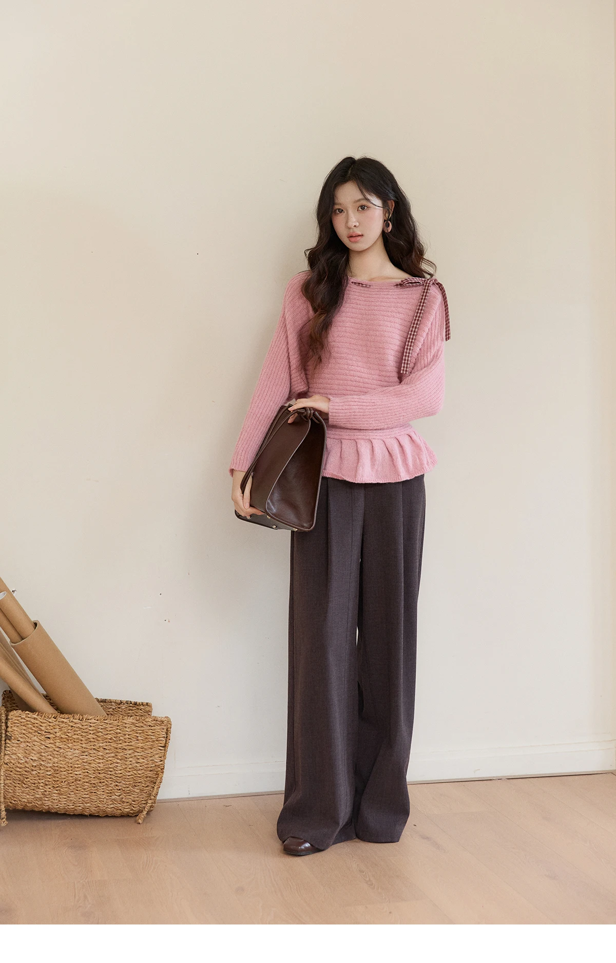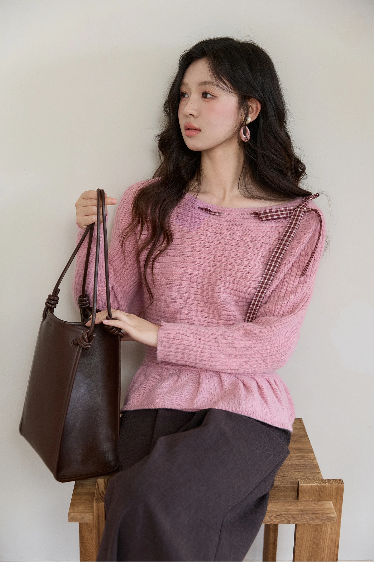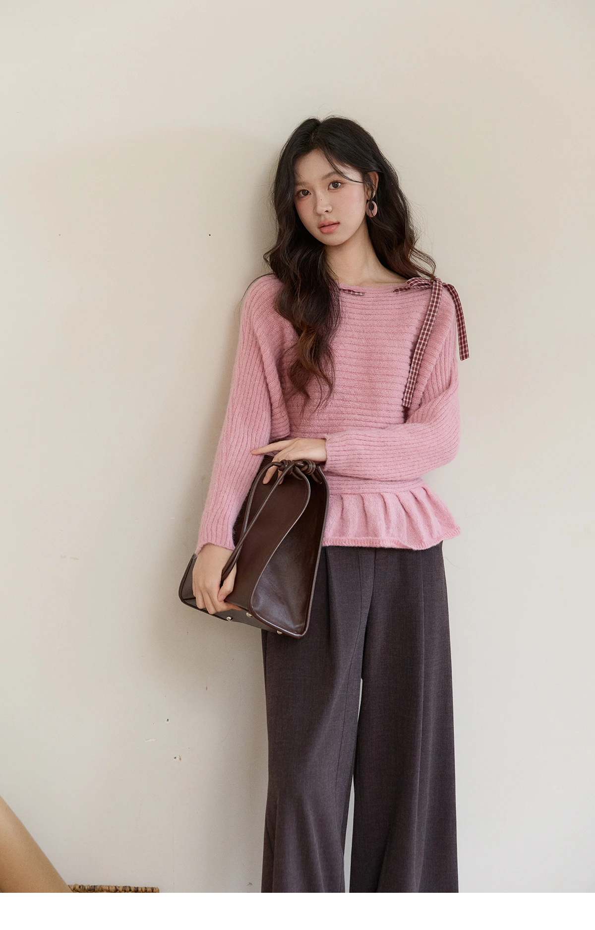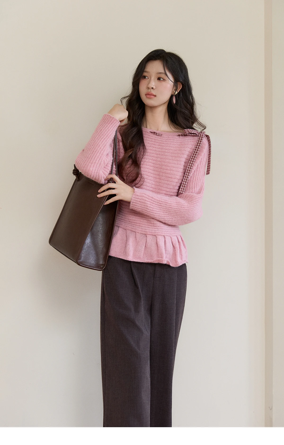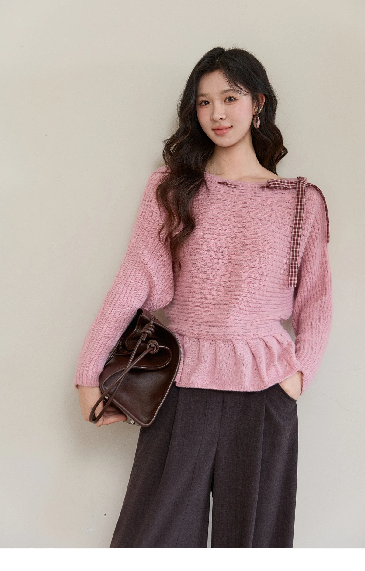 MISHOW Women's Pink Ribbed Knit Sweater 2026 Spring Plaid Bow Decor Peplum Hem Long Sleeve Casual Slim Pullover Tops MXF11Z3016