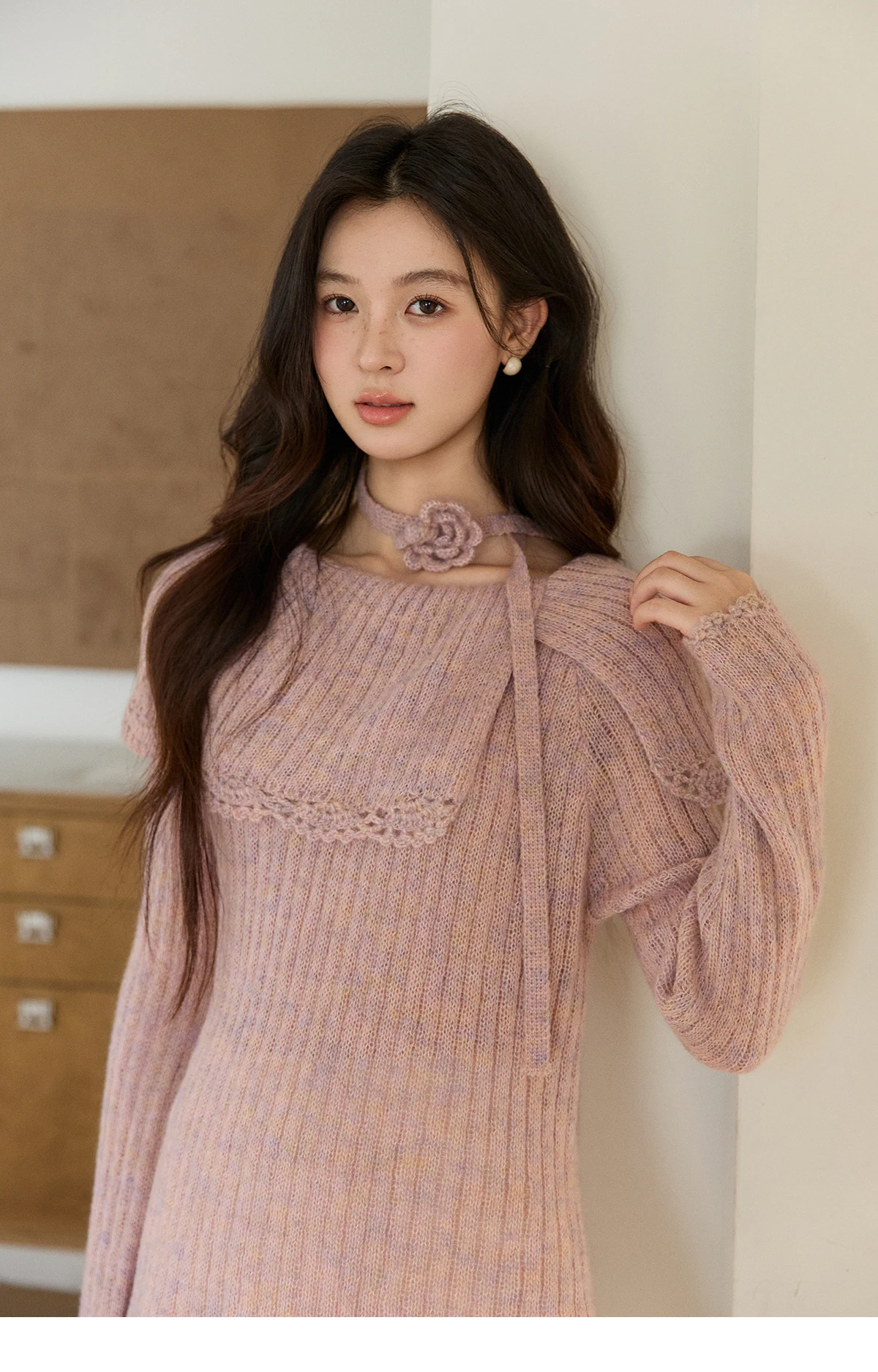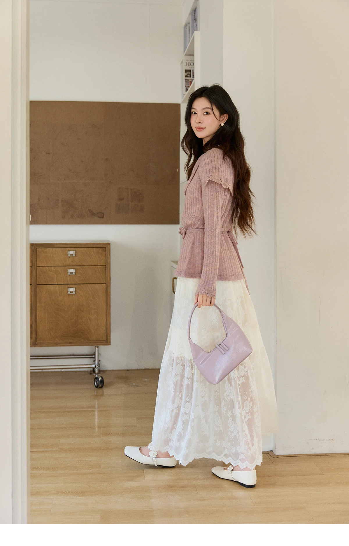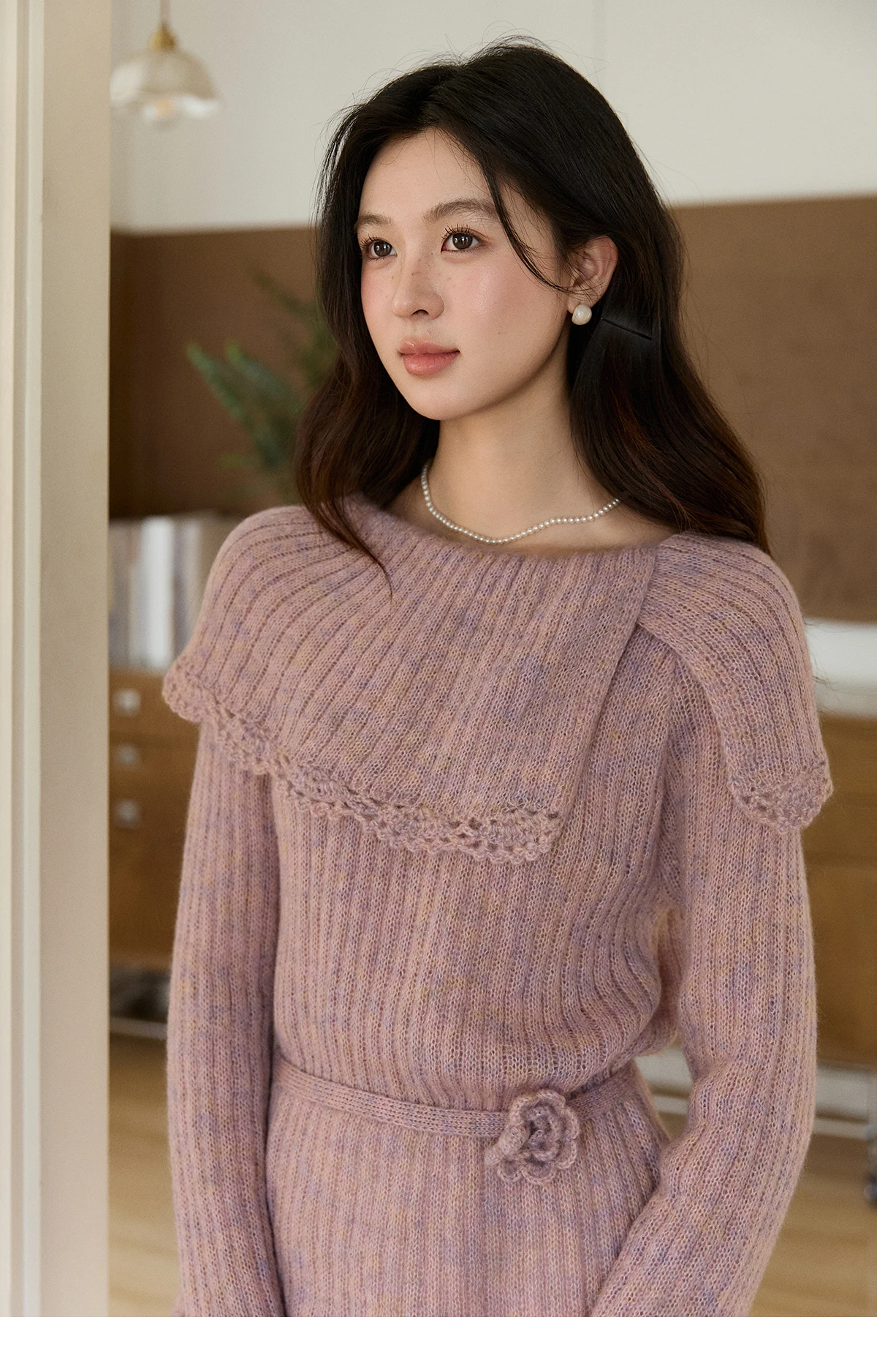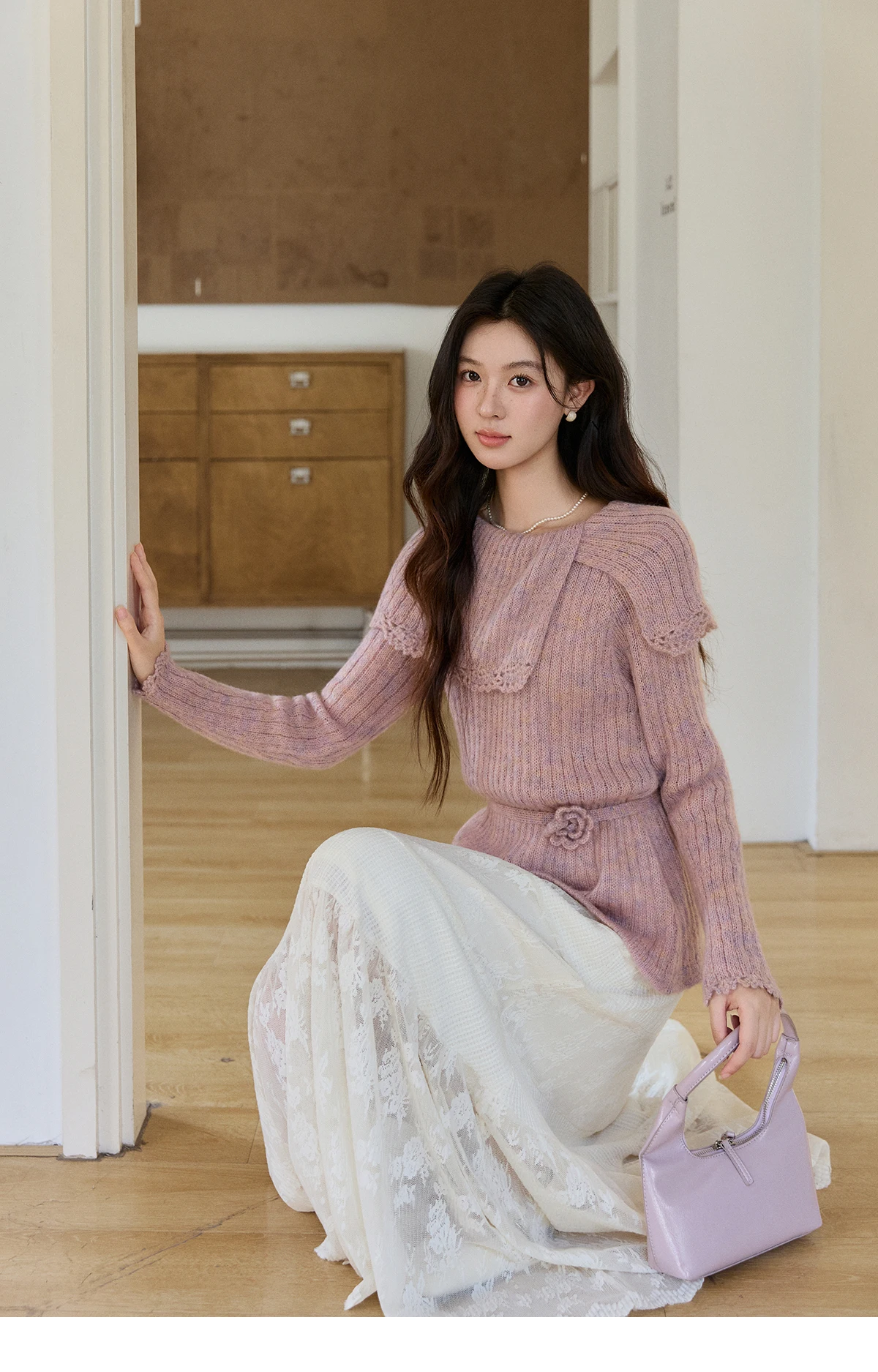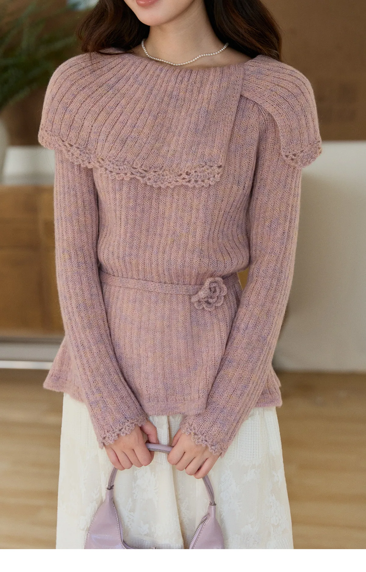 MISHOW Women's Pink Ribbed Knitted Sweater 2026 Spring Large Collar Lace Trim Belted Waist Long Sleeve Pullover Tops MXF11Z2901
