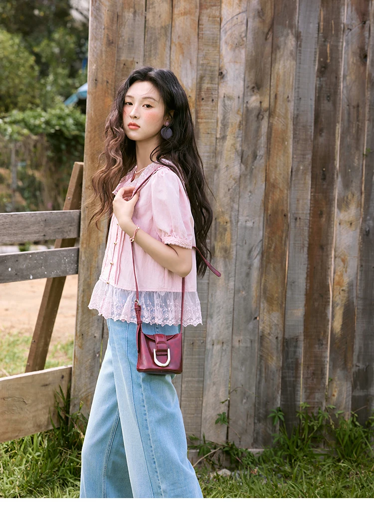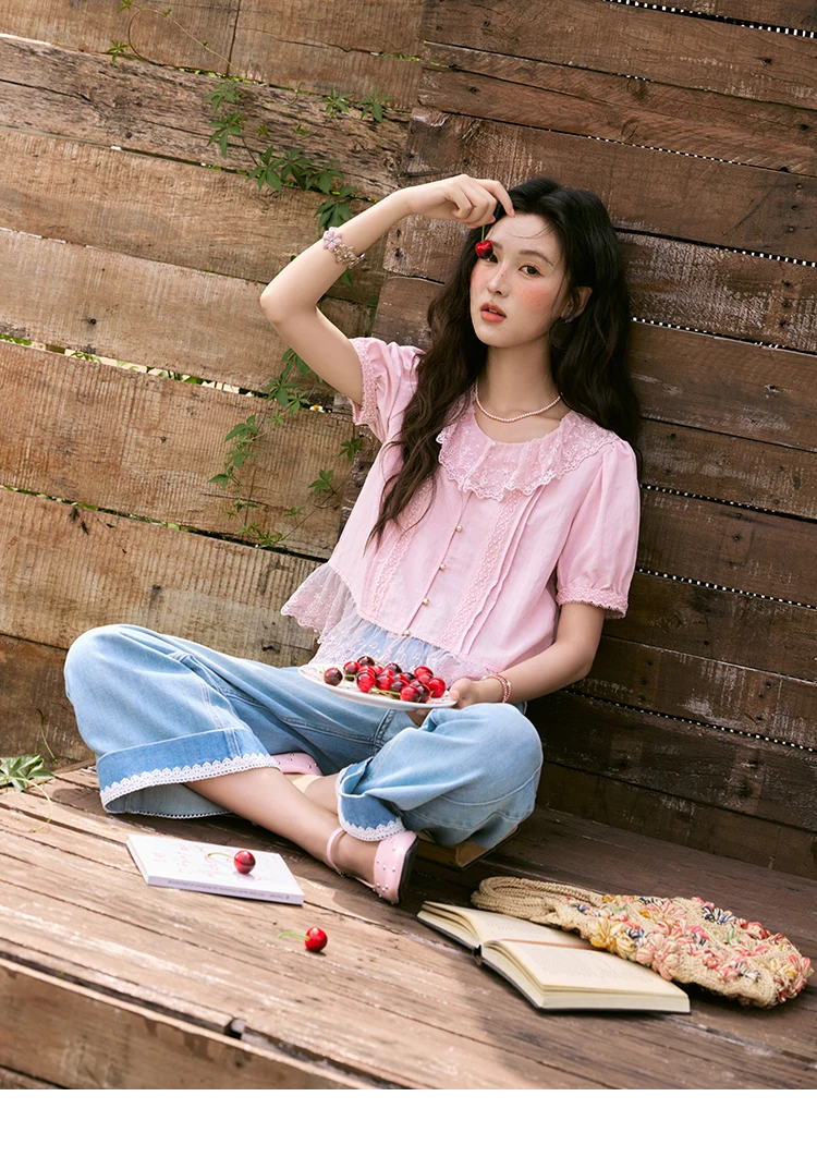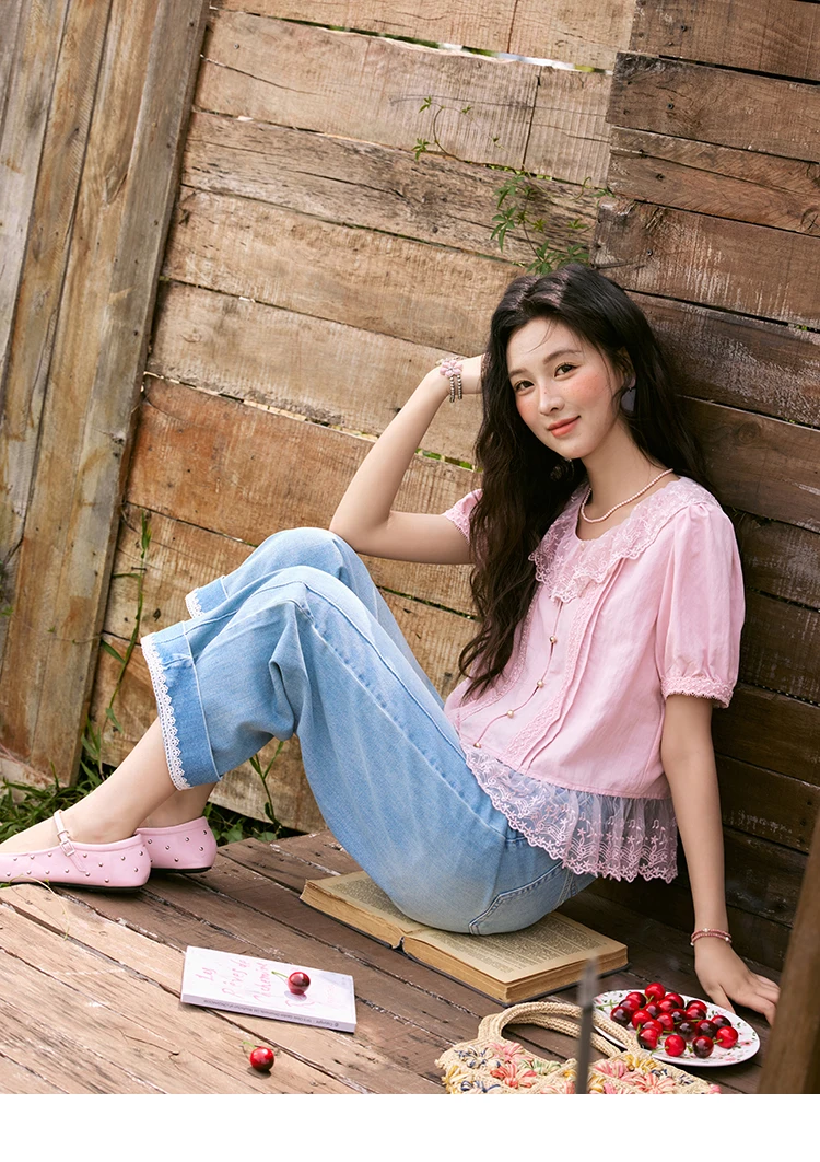 MISHOW Women's Pink Spliced Lace Round Neck Blouses 2025 Summer Lace Hem Sweet Blouse Single Row Metal Buttons Top MXE32X1768