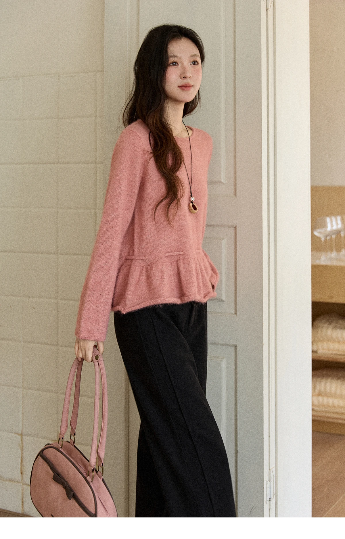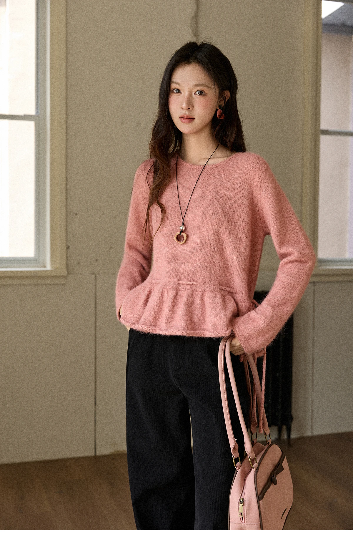 MISHOW Women's Pink Sweater 2025 Winter French Style Round Neck Knit Top Ruffled Hem with Drawstring Belt Pullover MXE90Z2824