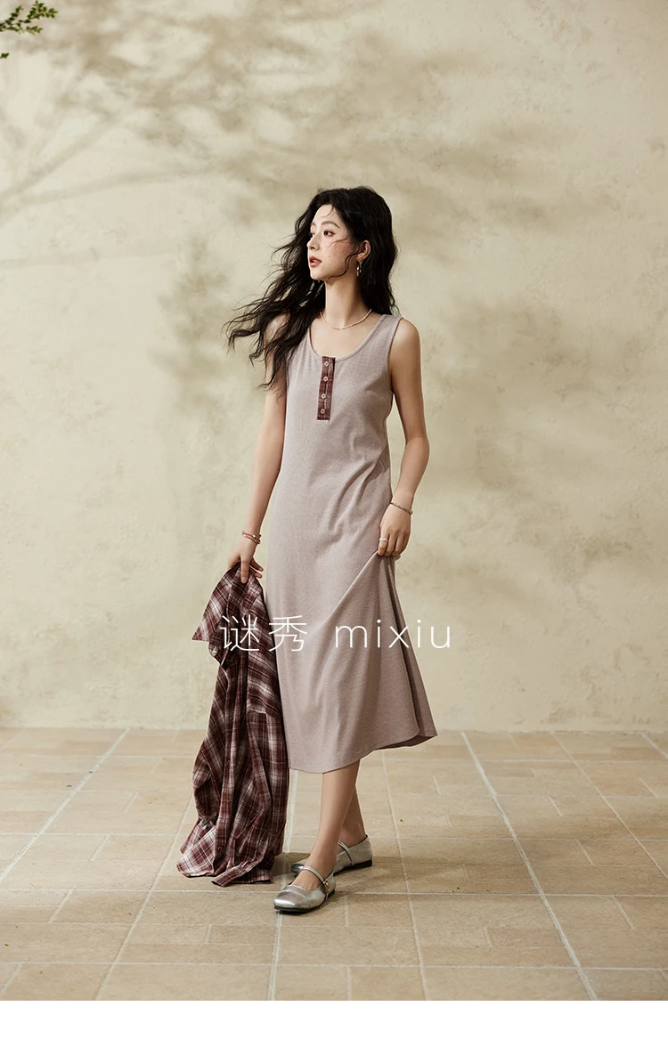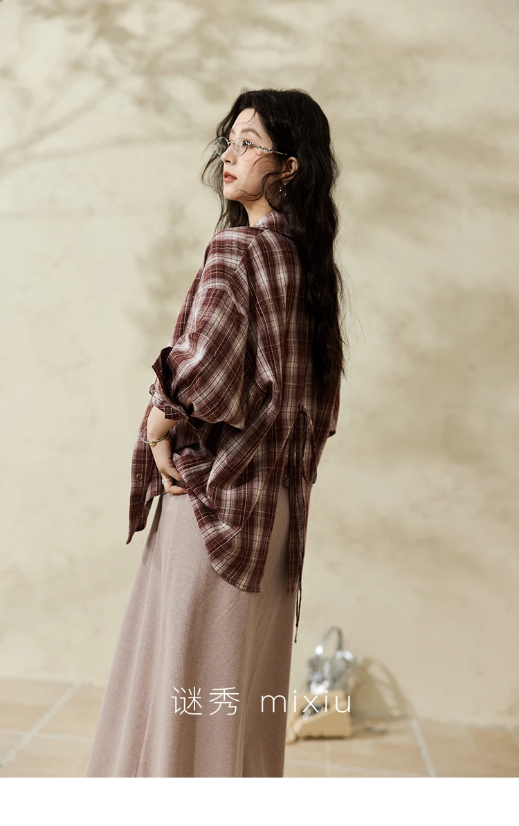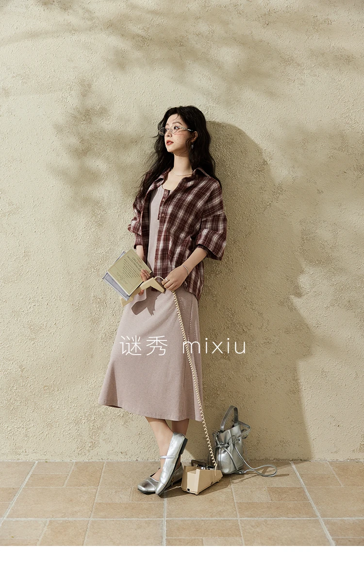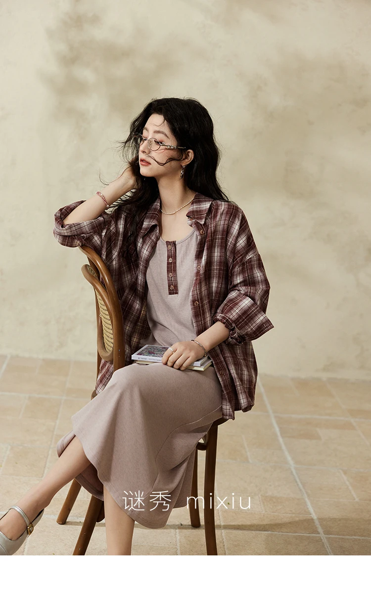 MISHOW Women's Plaid Shirt Grey Vest Dress Separately Spring Lapel Collar Shirt U-neck Sleeveless Dresses (Not A Set) MXE13L2093