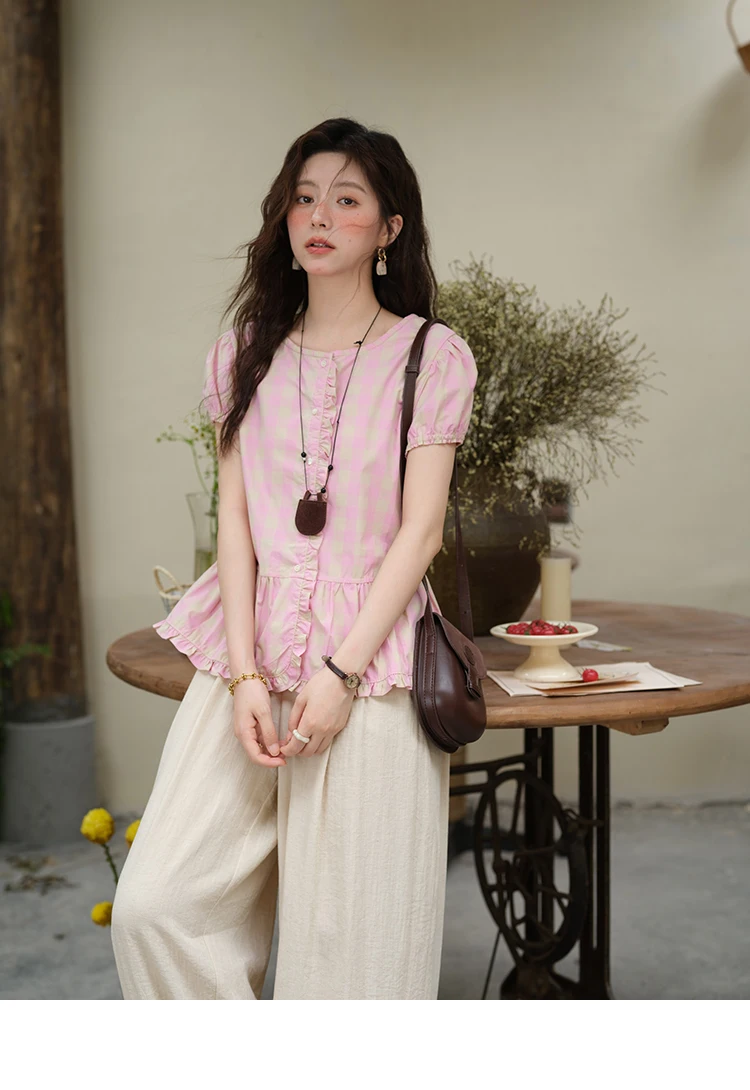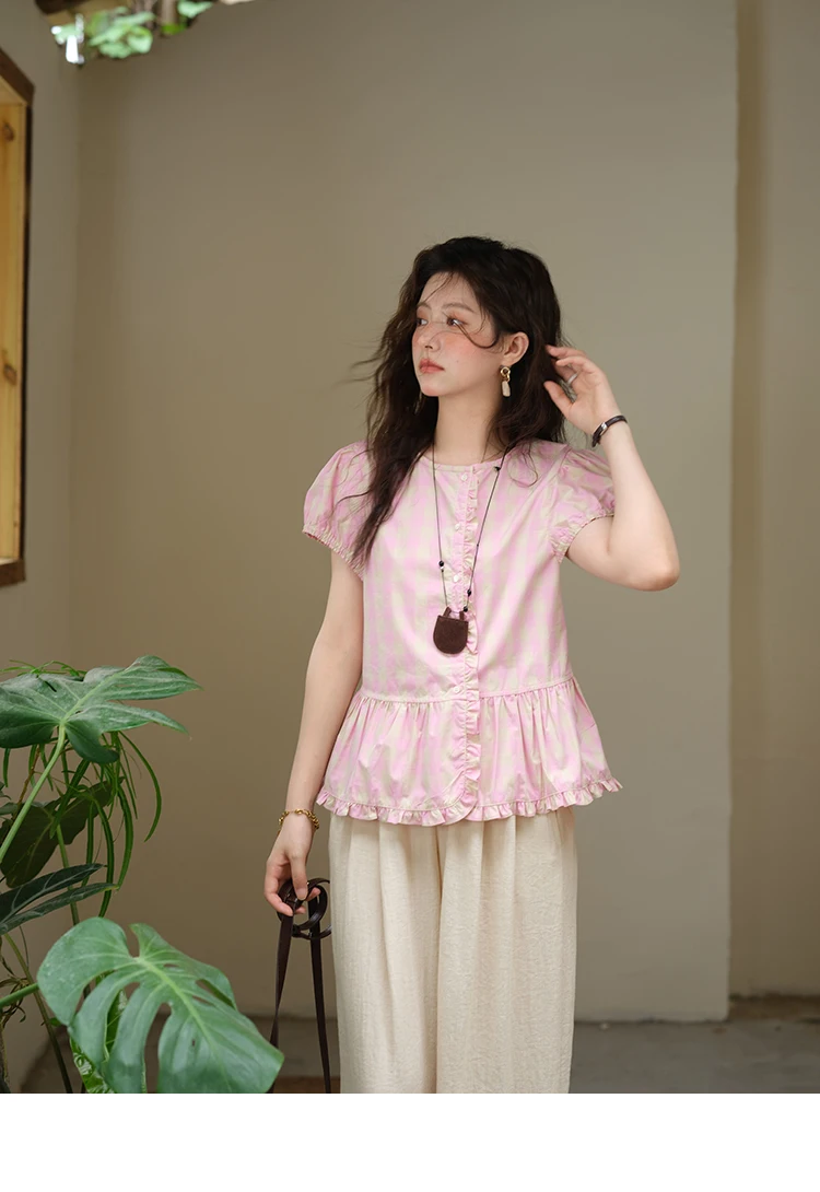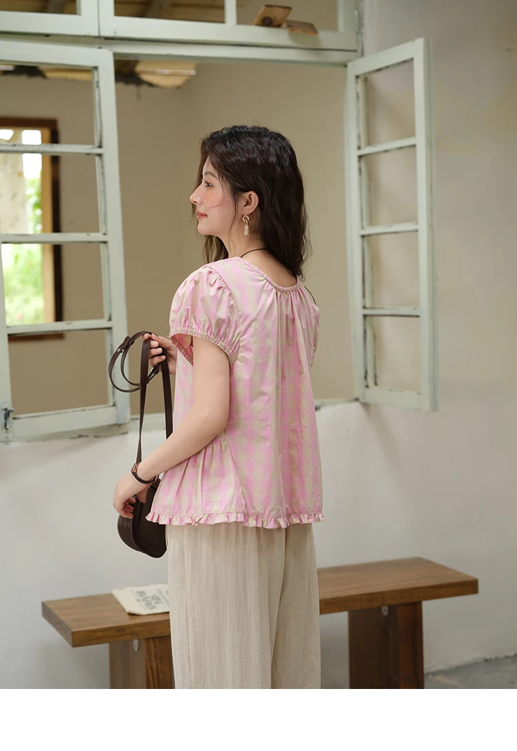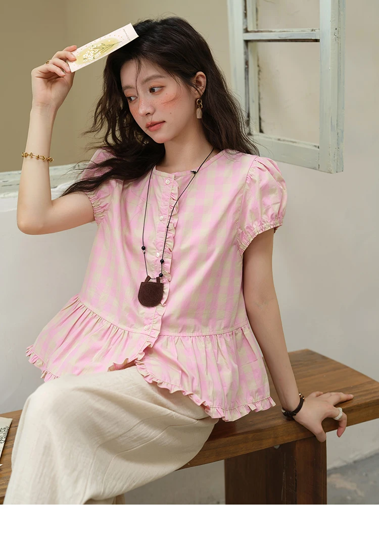 MISHOW Women's Puff Sleeve Plaid Button Shirt 2025 Summer New Fashion O-Neck Wood Ear Casual Shirt Cotton Pink Top MXE39X1932