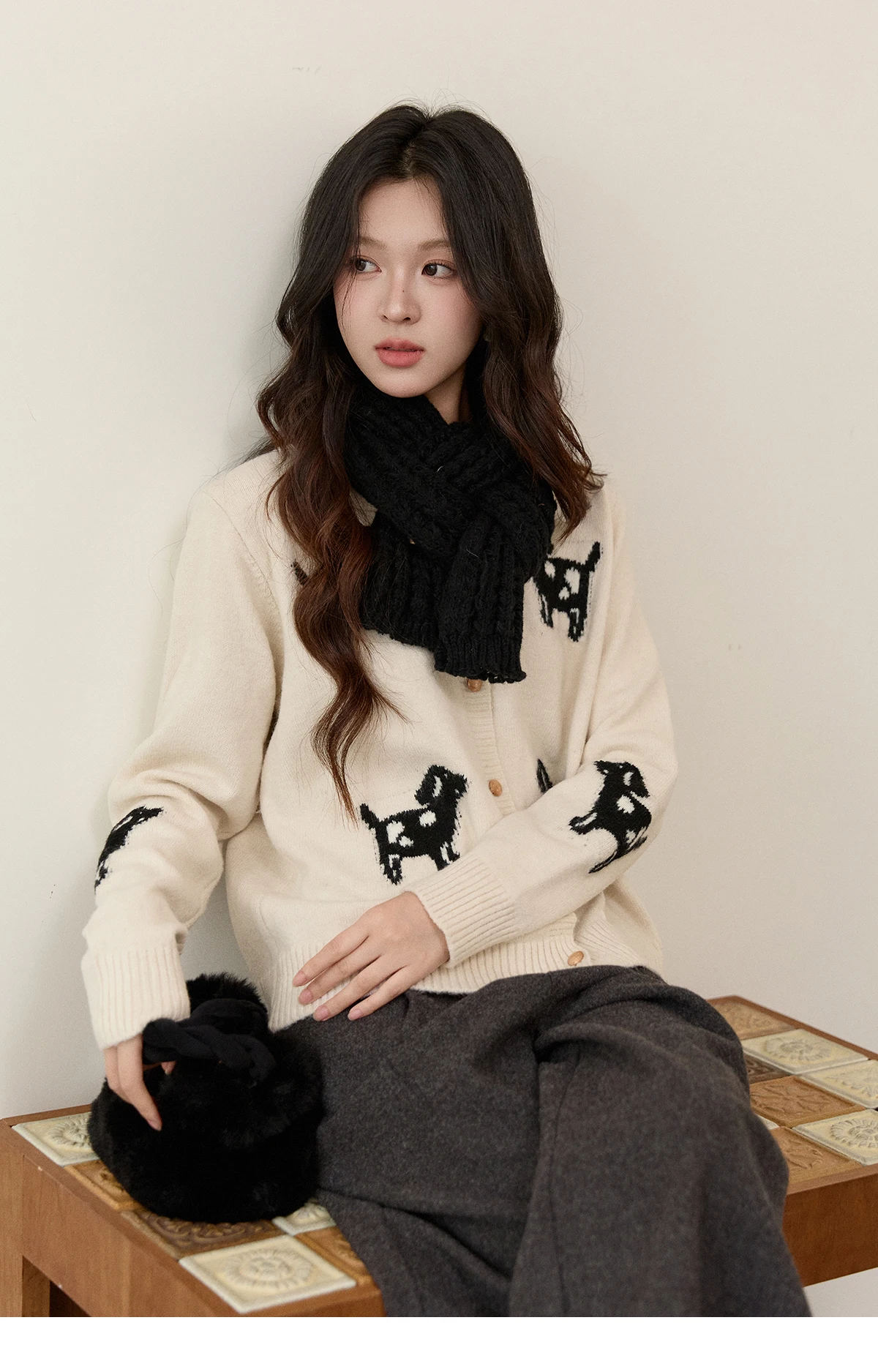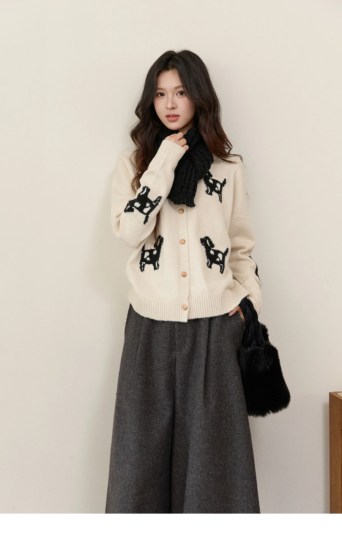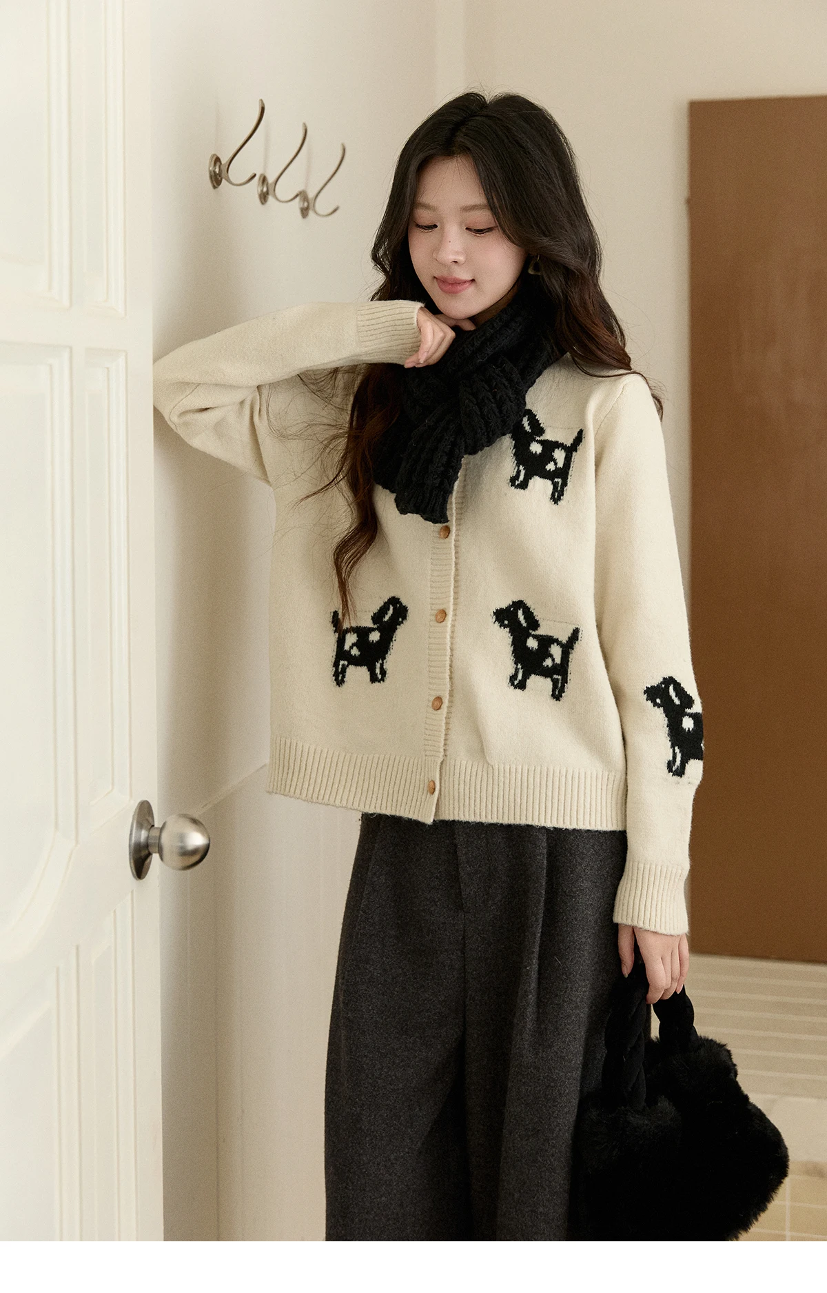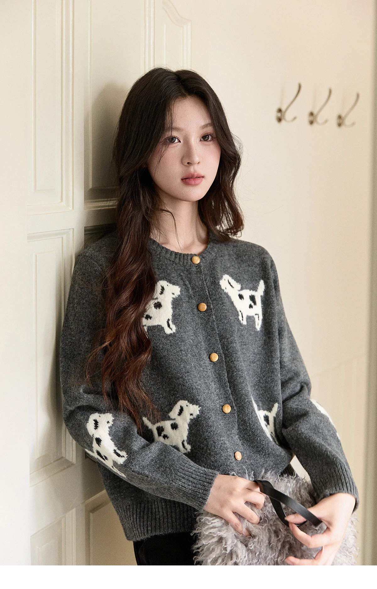 MISHOW Women's Puppy Jacquard Knit Cardigan 2025 Winter Single-breasted Crew Neck Top Warm Loose Sweaters Office Lady MXE93Z2950