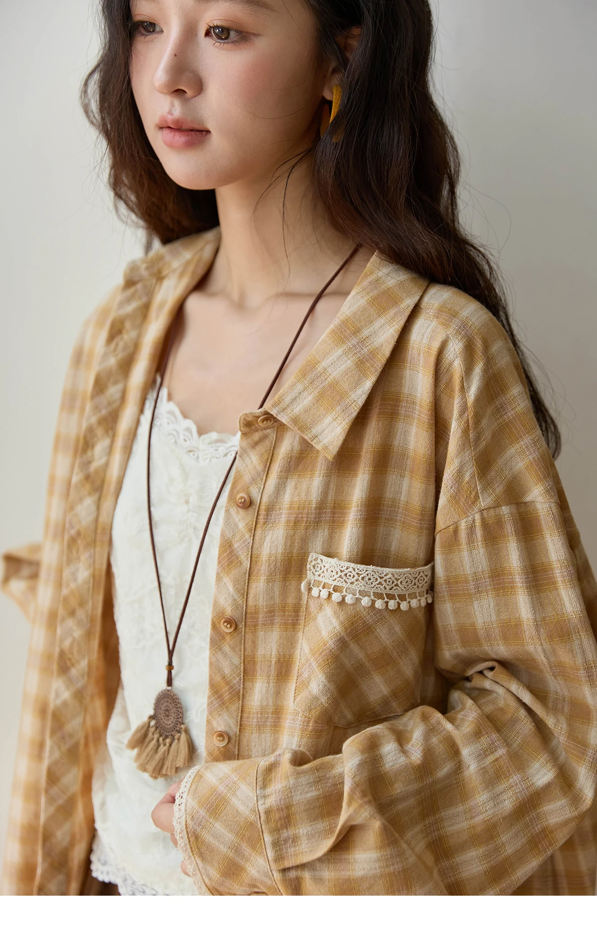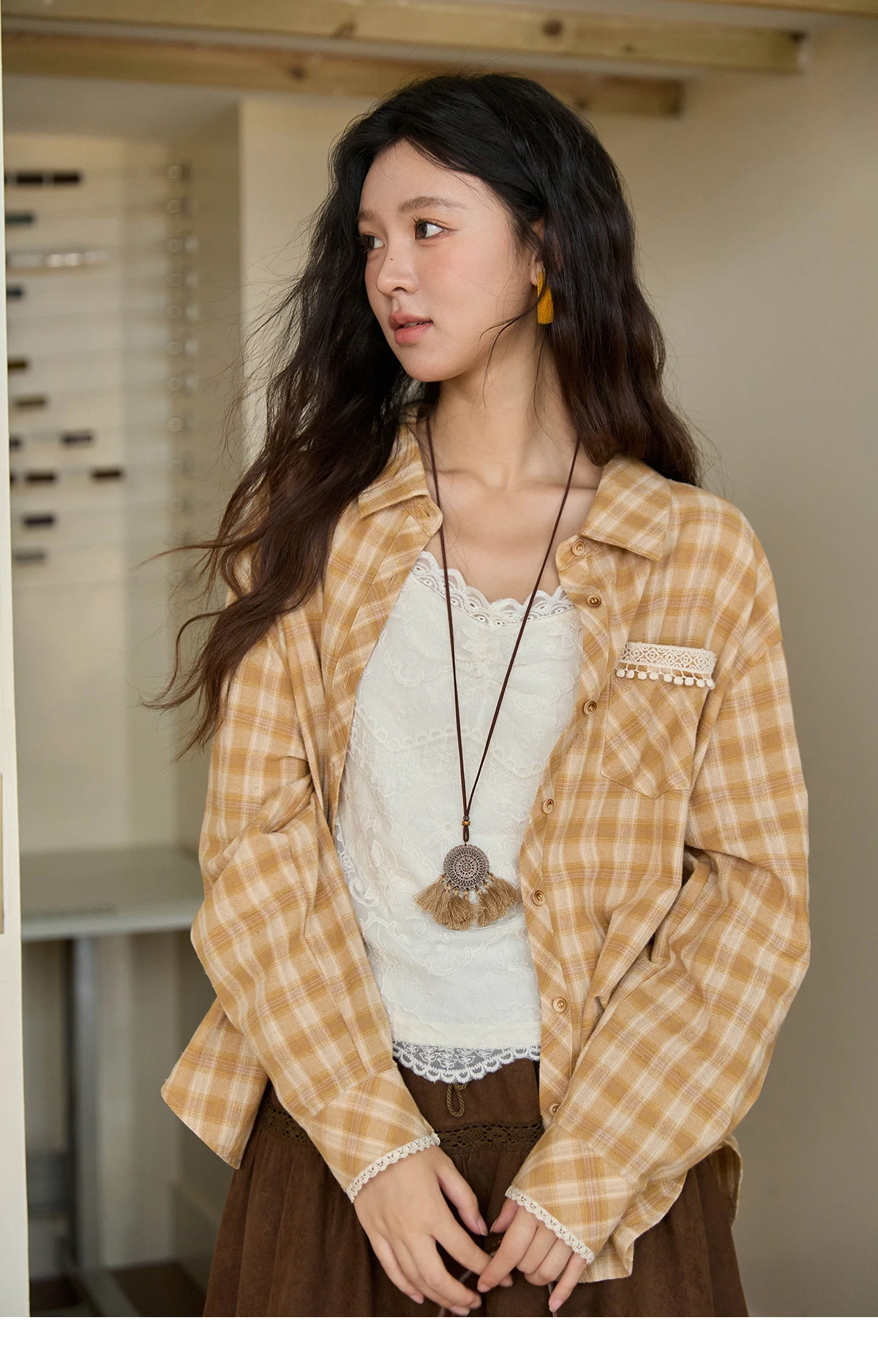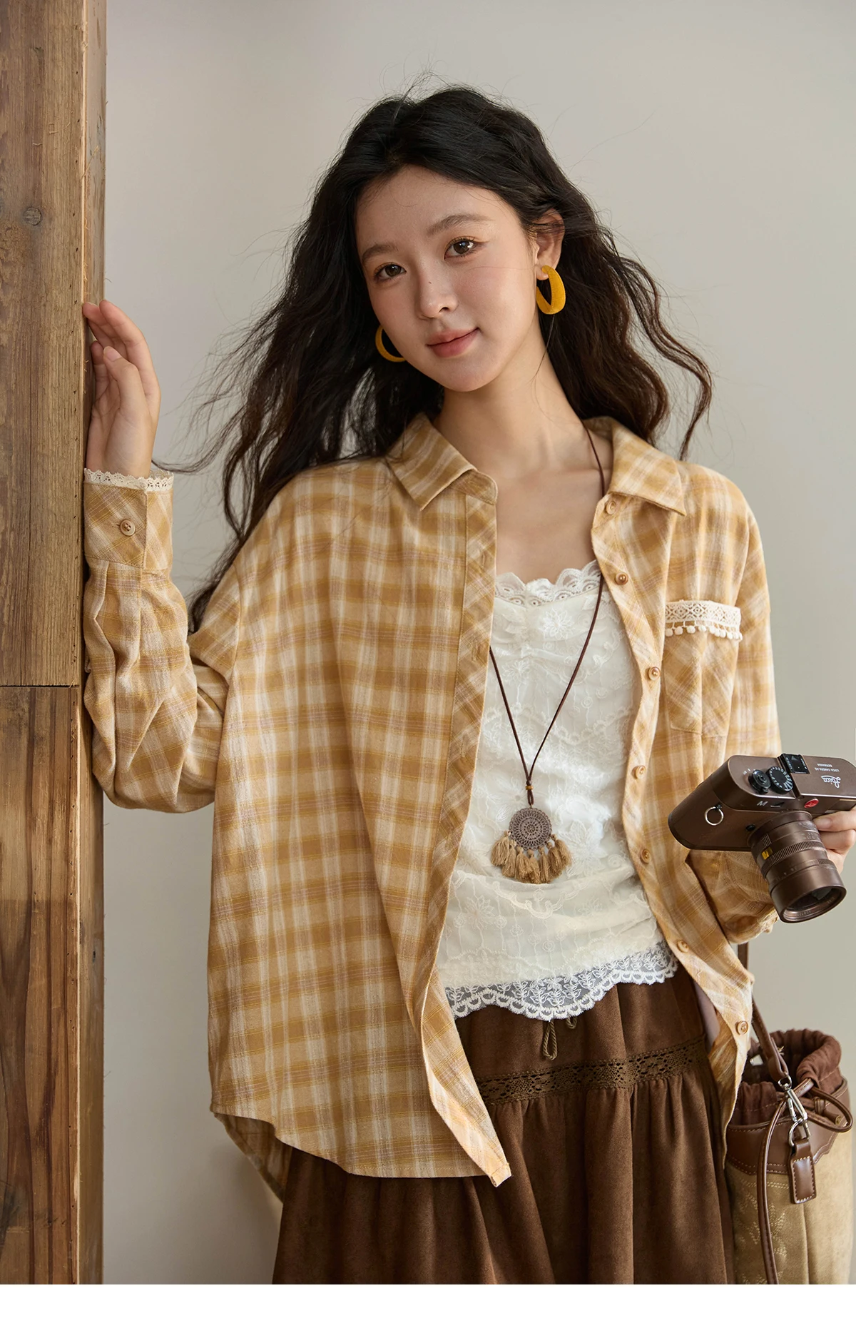 MISHOW Women's Retro Plaid Long Sleeved Shirt 2025 Autumn Korean Loose Casual Plaid Top with Lace Pocket Lapel Shirts MXE43C2378