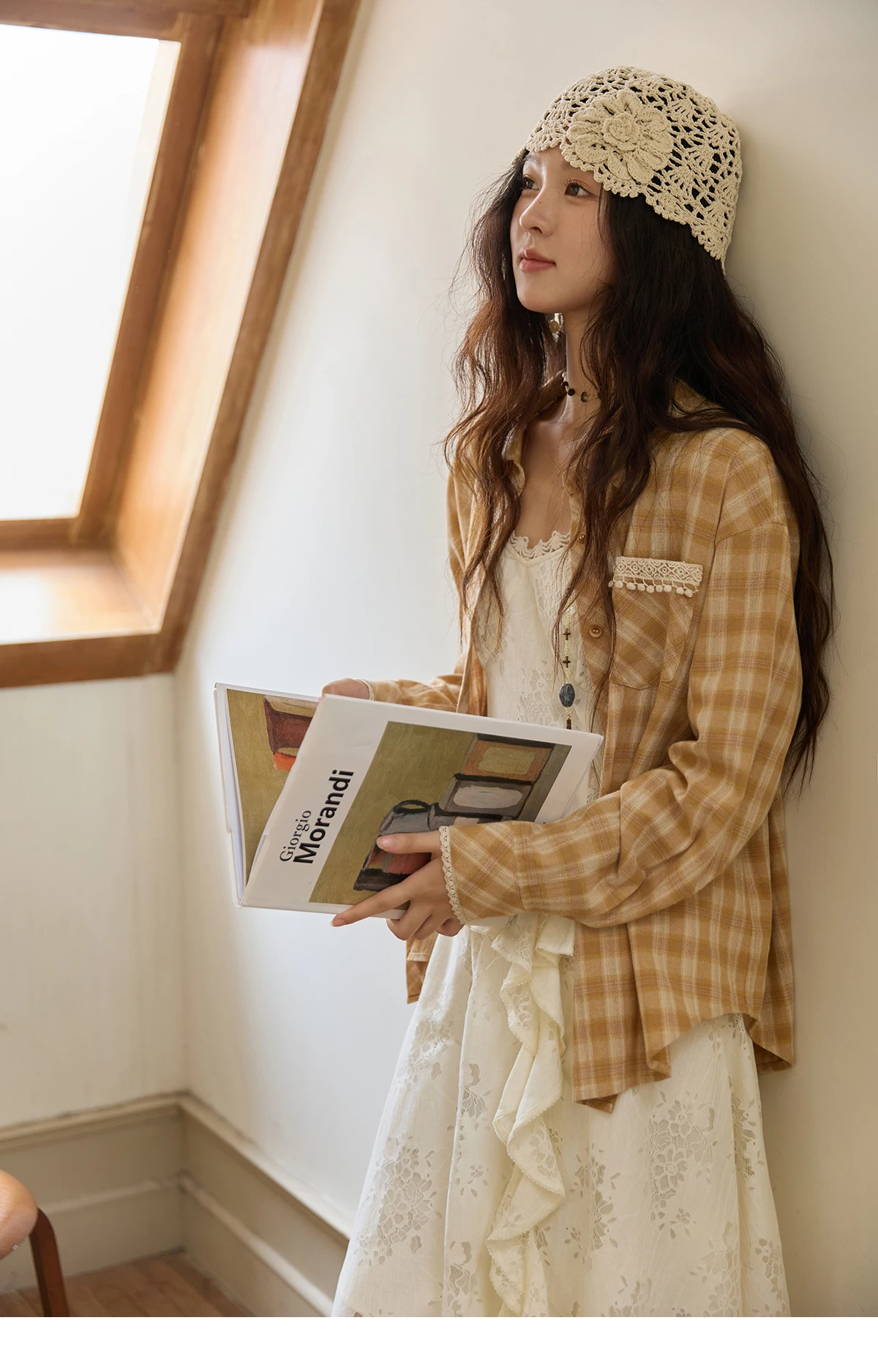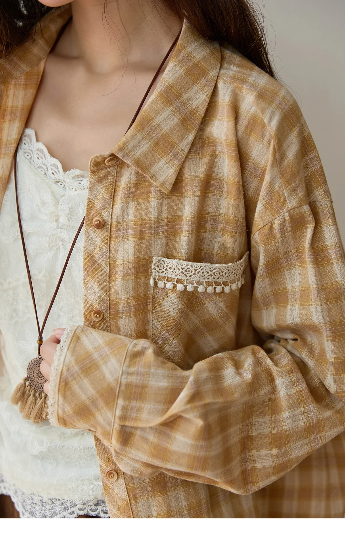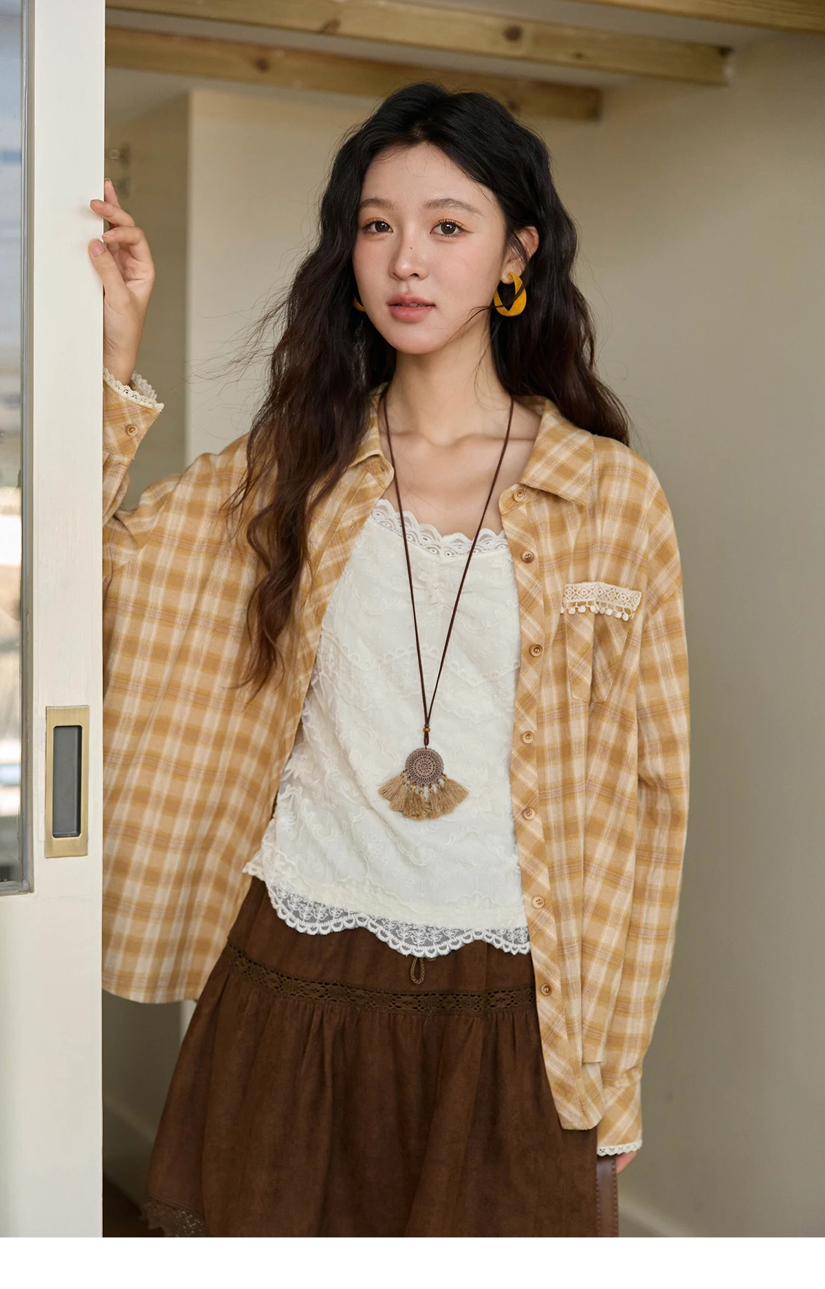 MISHOW Women's Retro Plaid Long Sleeved Shirt 2025 Autumn Korean Loose Casual Plaid Top with Lace Pocket Lapel Shirts MXE43C2378