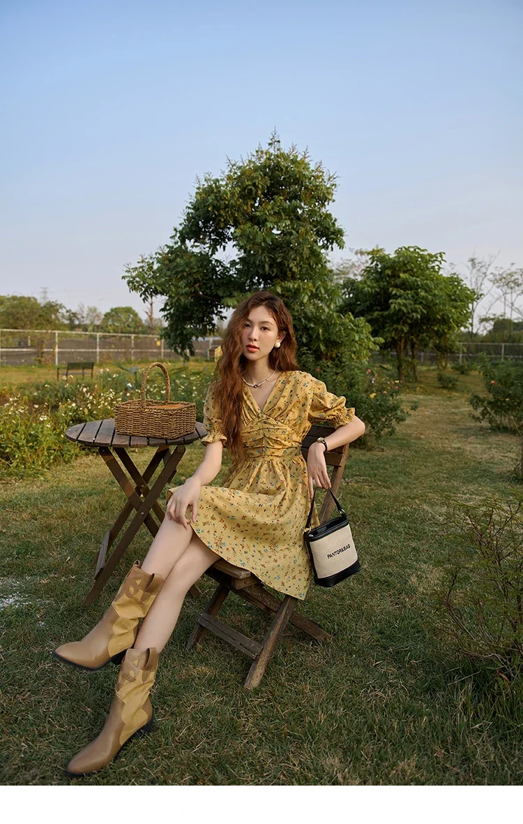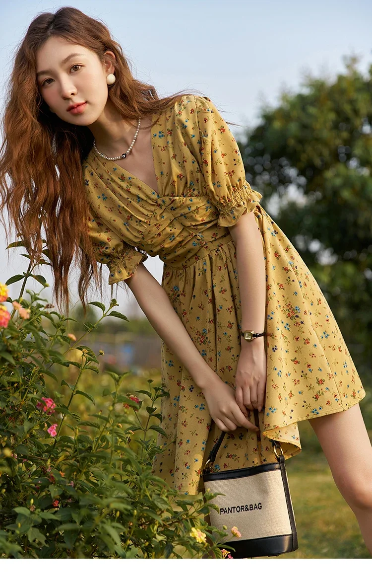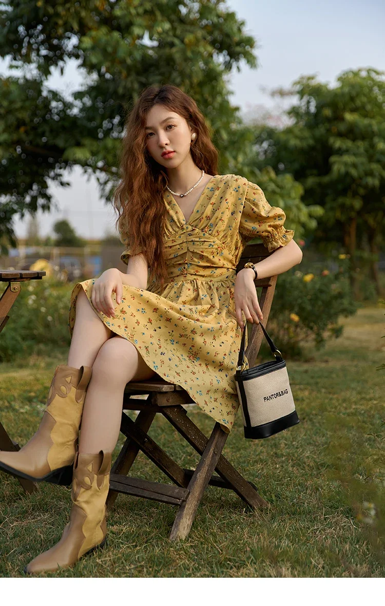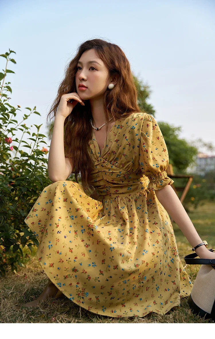 MISHOW Women's Retro Puff Sleeve Flower Dress 2025 Summer Waist Slim A-LINE V-Neck Shirring Female Ankle-Length Dress MXC33L1374