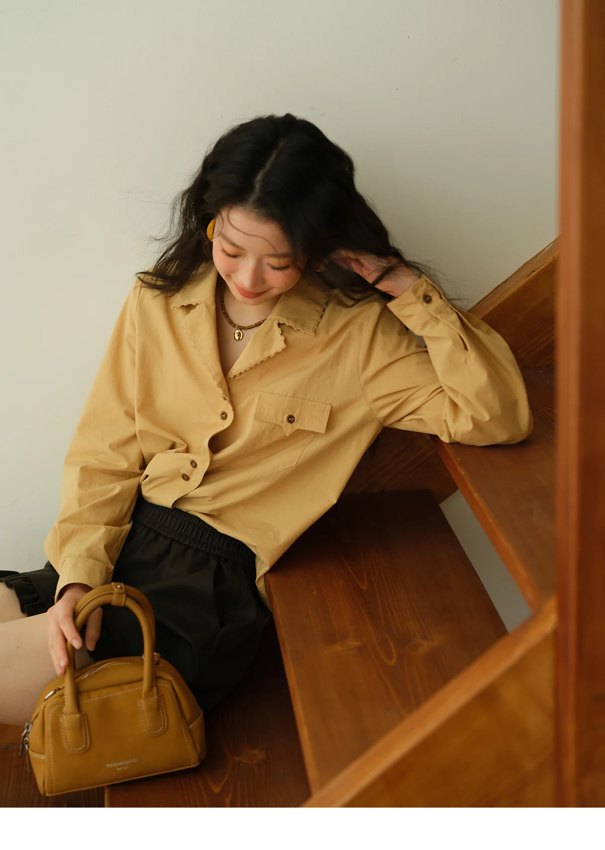 MISHOW Women's Retro Yellow Lapel Cotton Shirt 2025 Autumn Loose Casual Top Contrasting Button with Pocket Shirts MXE41C2356