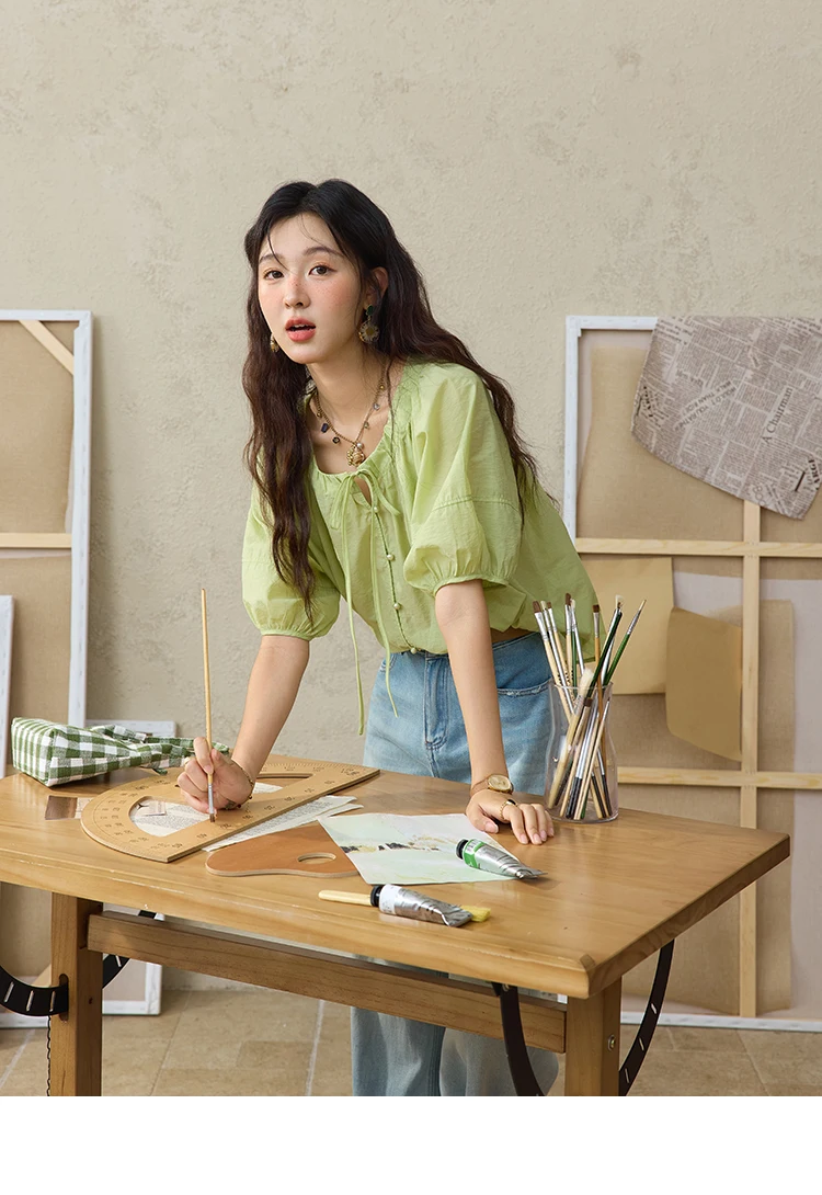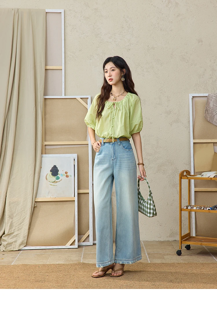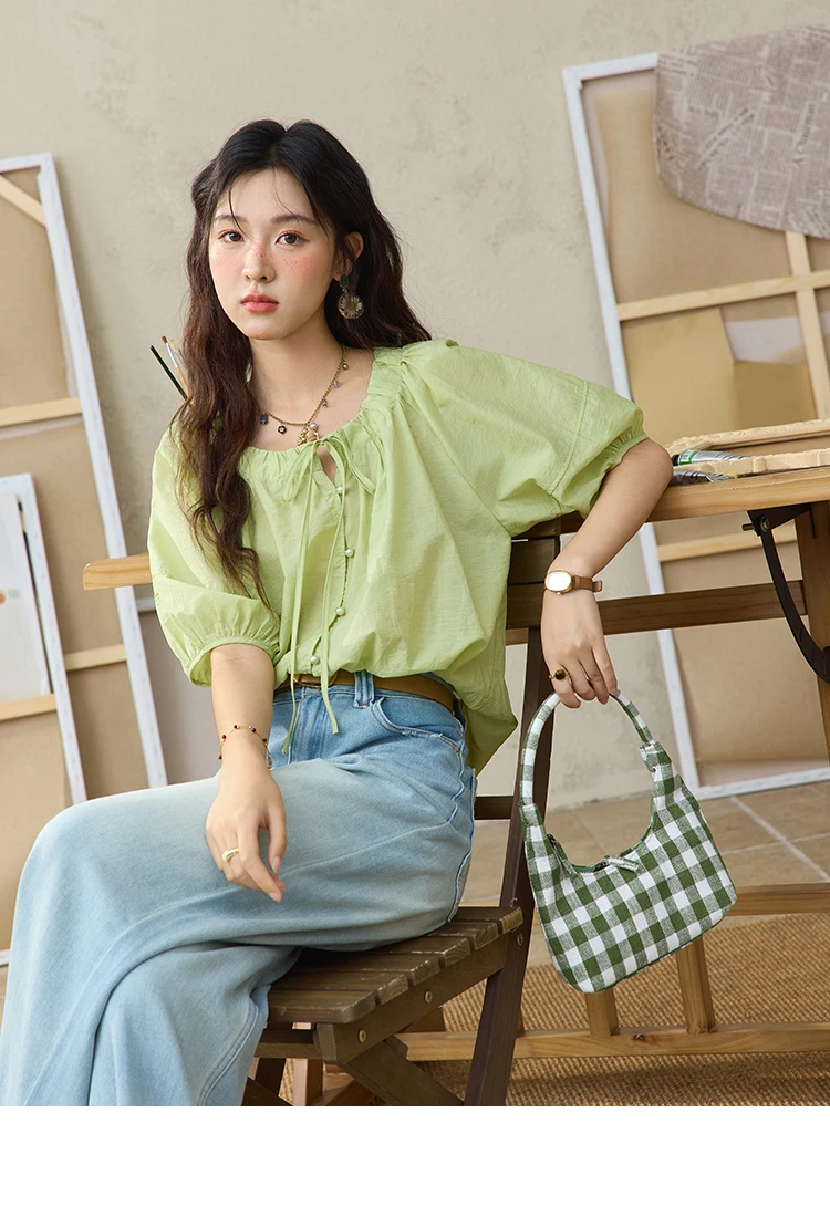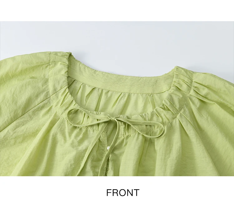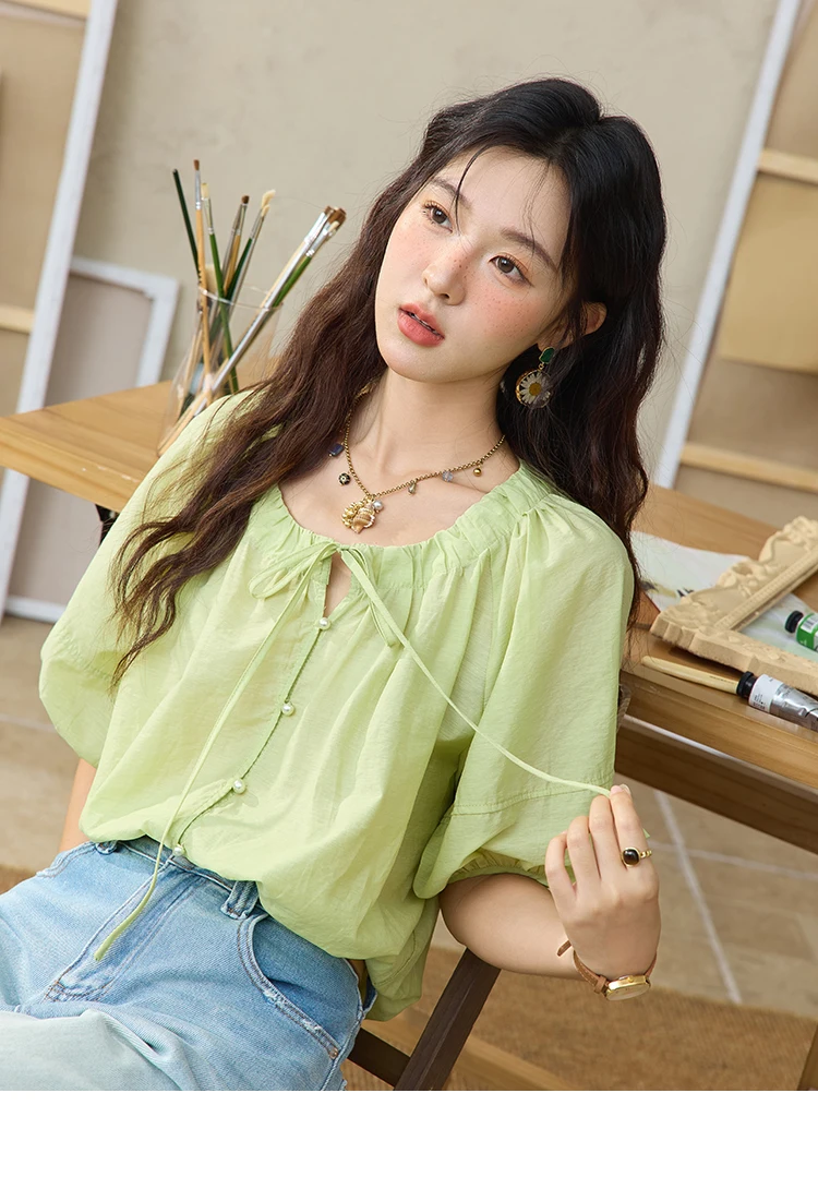 MISHOW Women's Round Neck Blouse 2025 Summer New Fashion Lace Up Puff Sleeve Casual Chiffon Top Ladies Clothing MXE36X1875