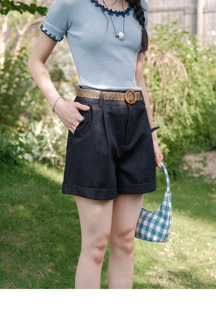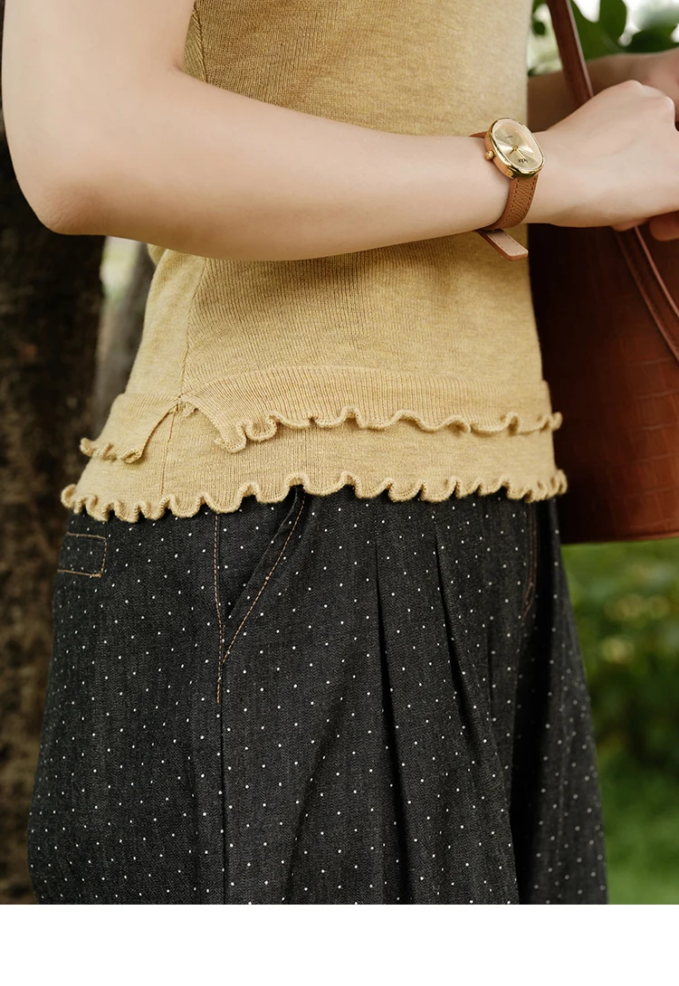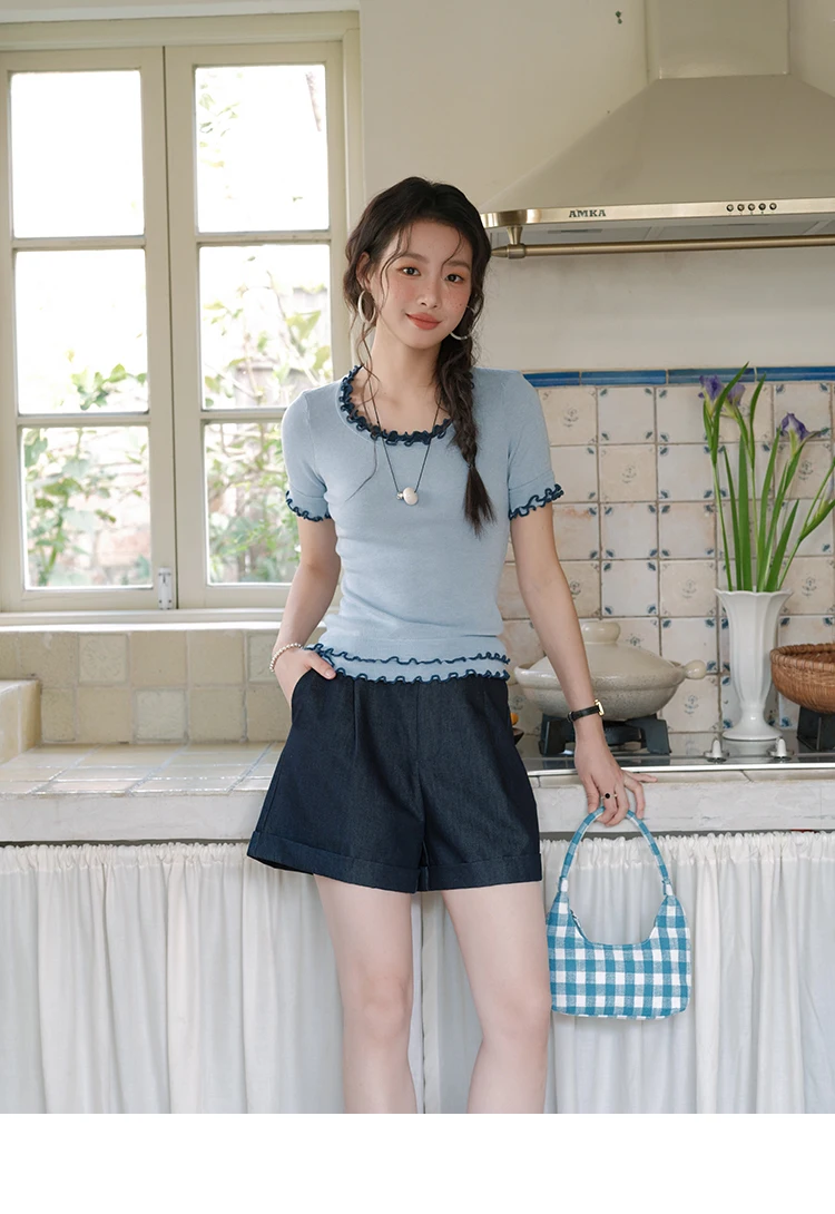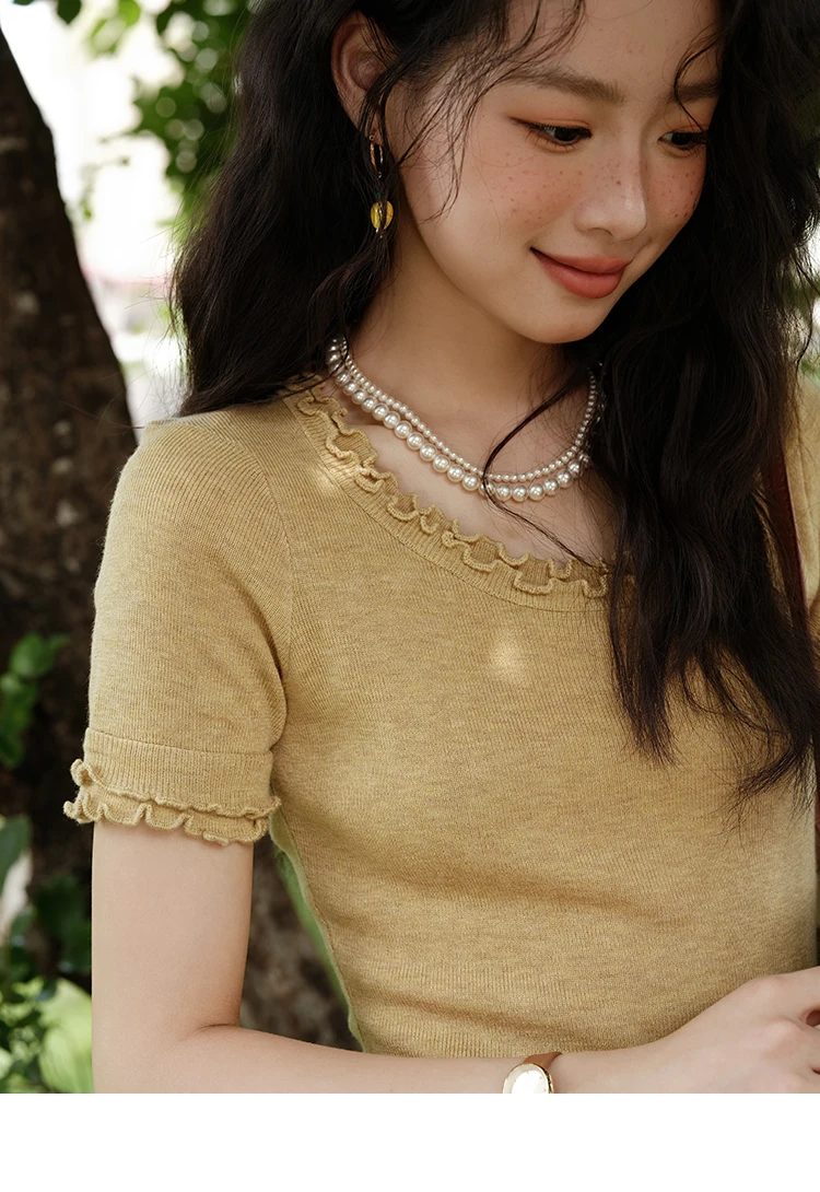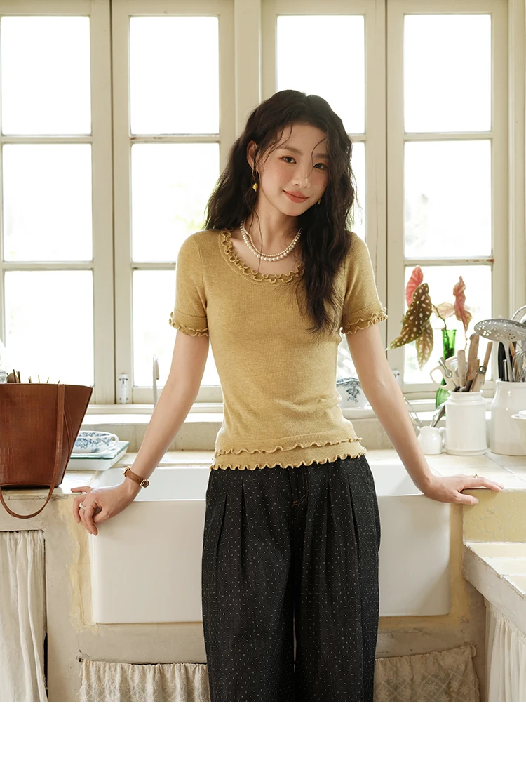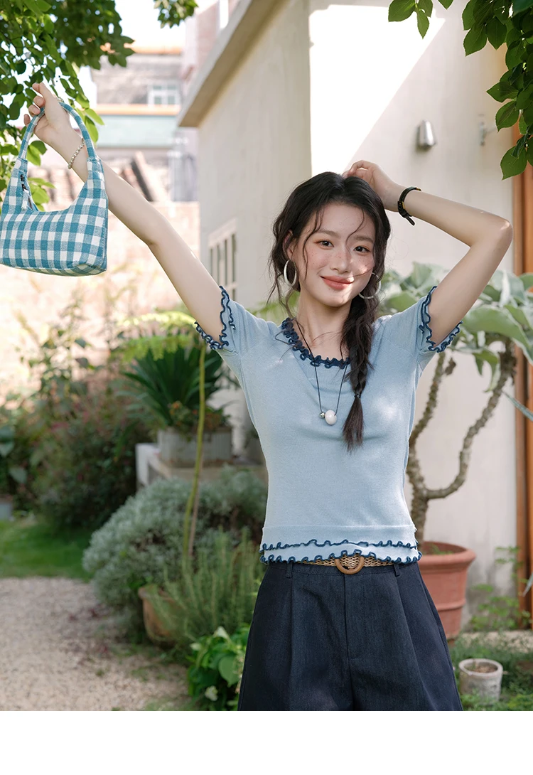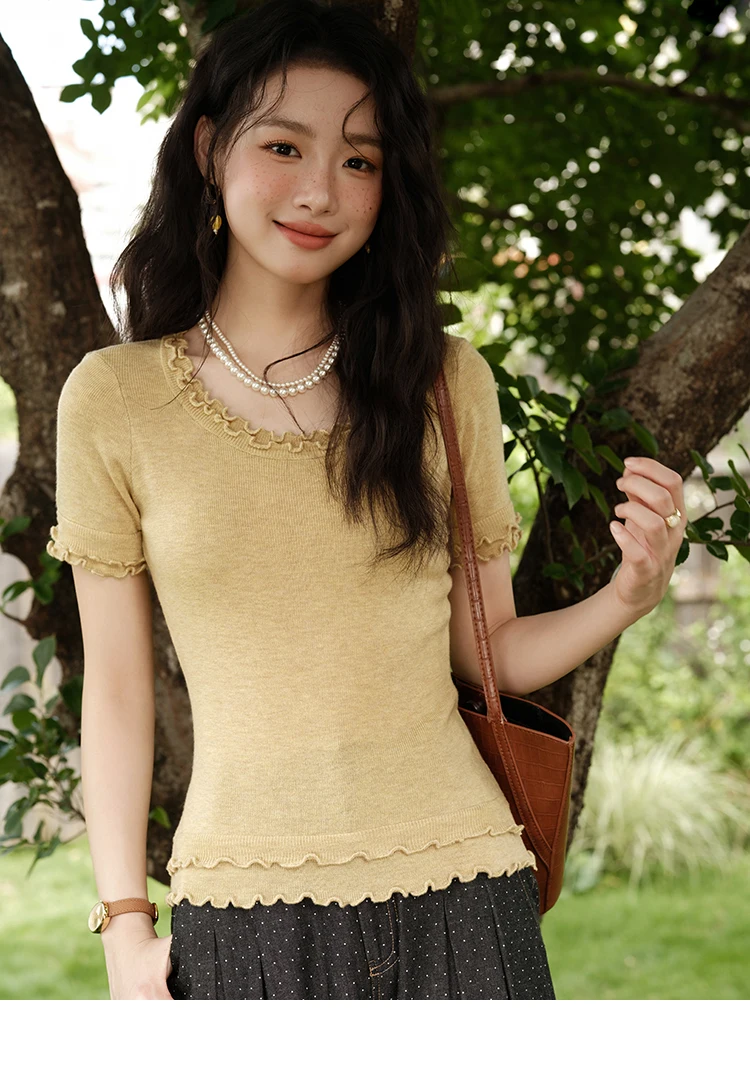 MISHOW Women's Round Neck Knit T-shirt Summer 2025 Fashion Ear Edge Short Top Casual Short Sleeve Tee Female Clothing MXE32Z1233