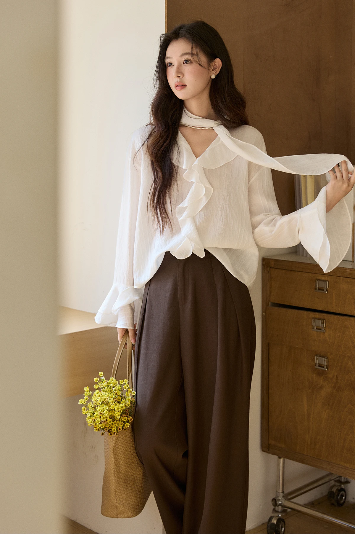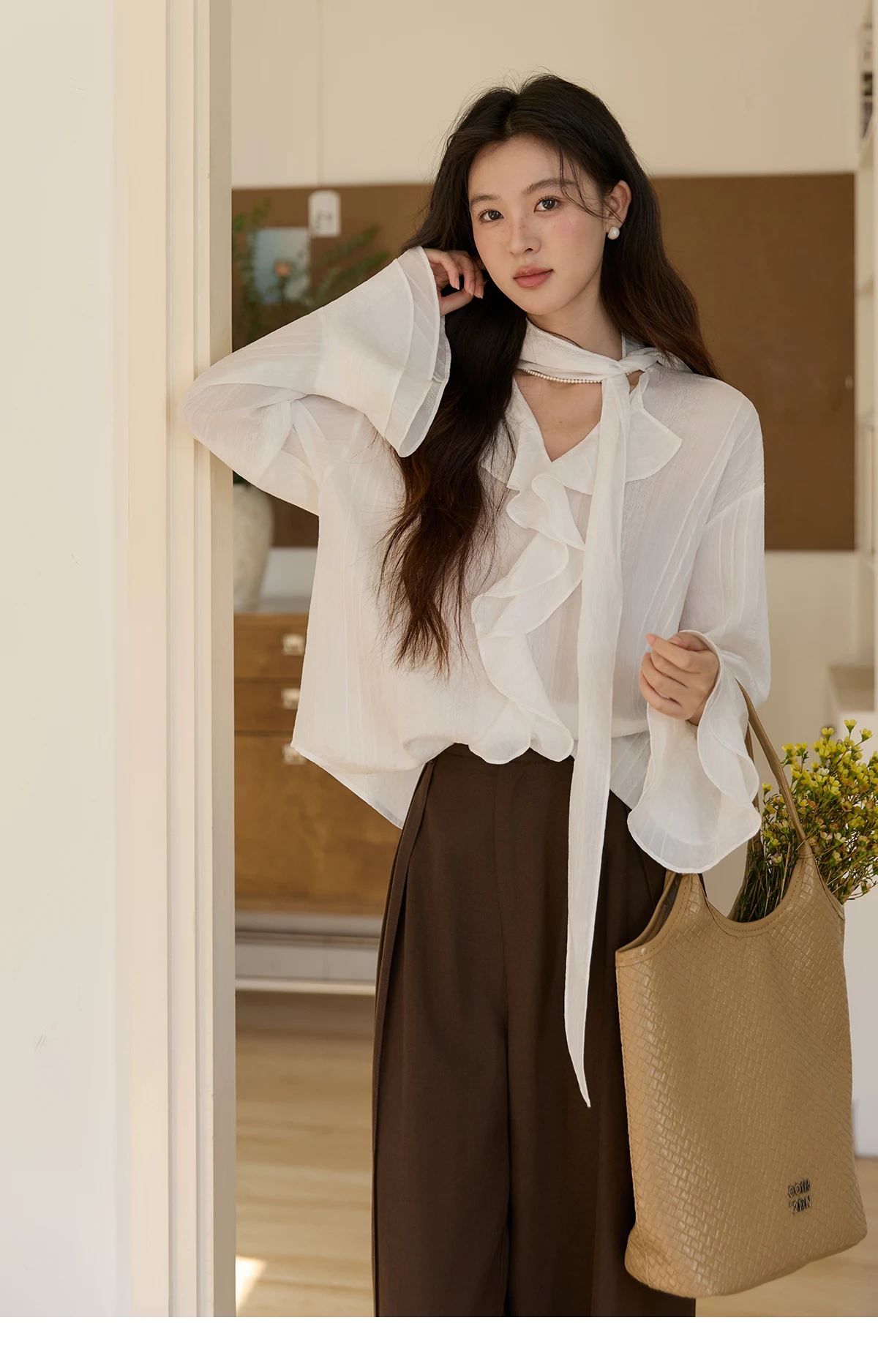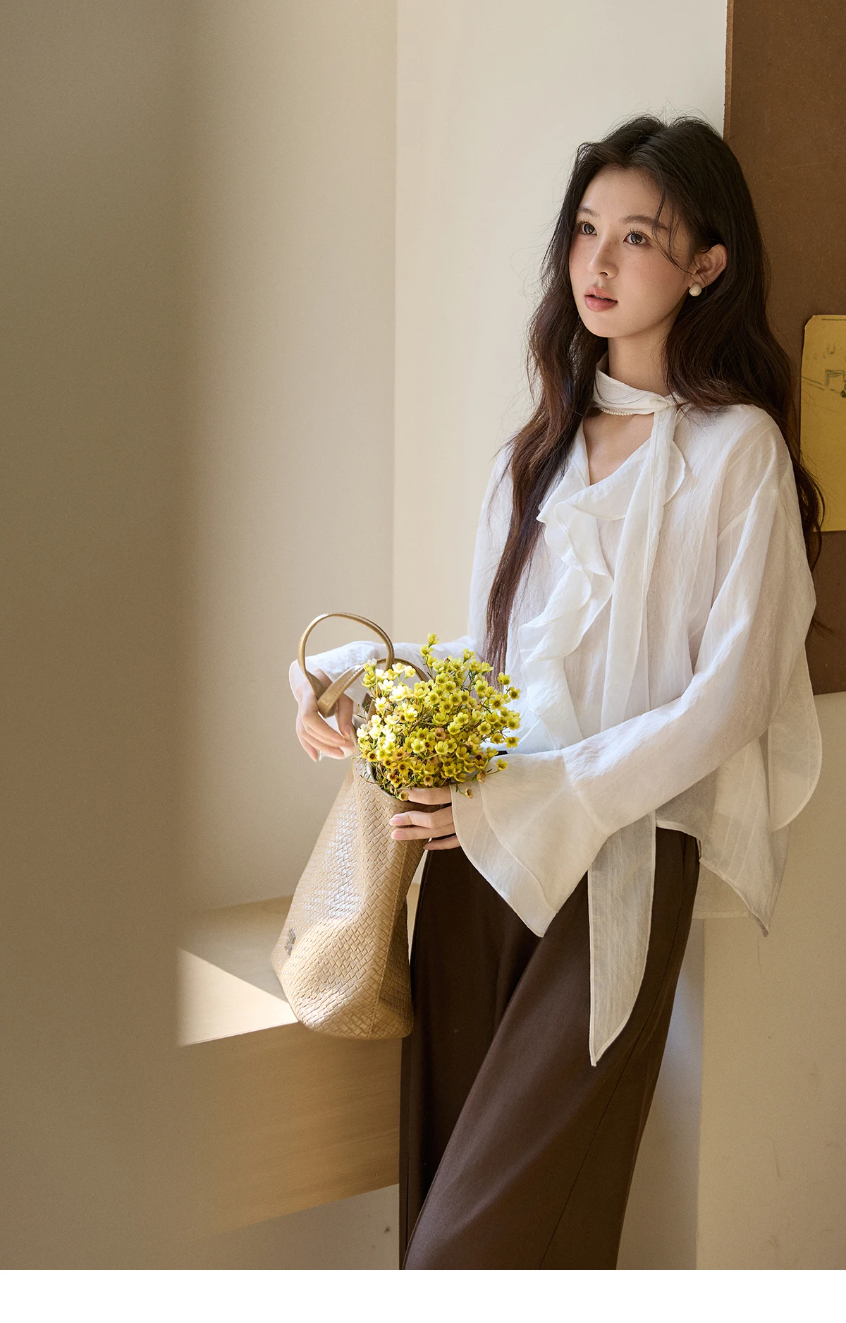 MISHOW Women's Ruffle Trim Chiffon Blouse with Detachable Scarf 2026 Spring Long Sleeve Loose Fit Casual White Top MXF108X0999