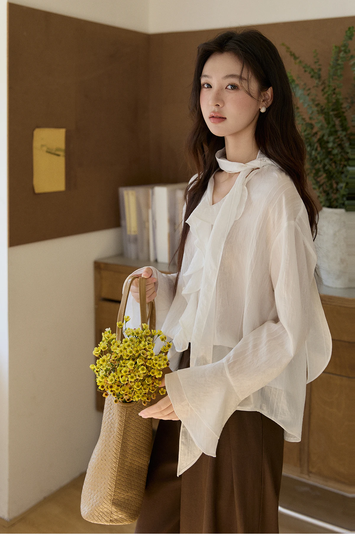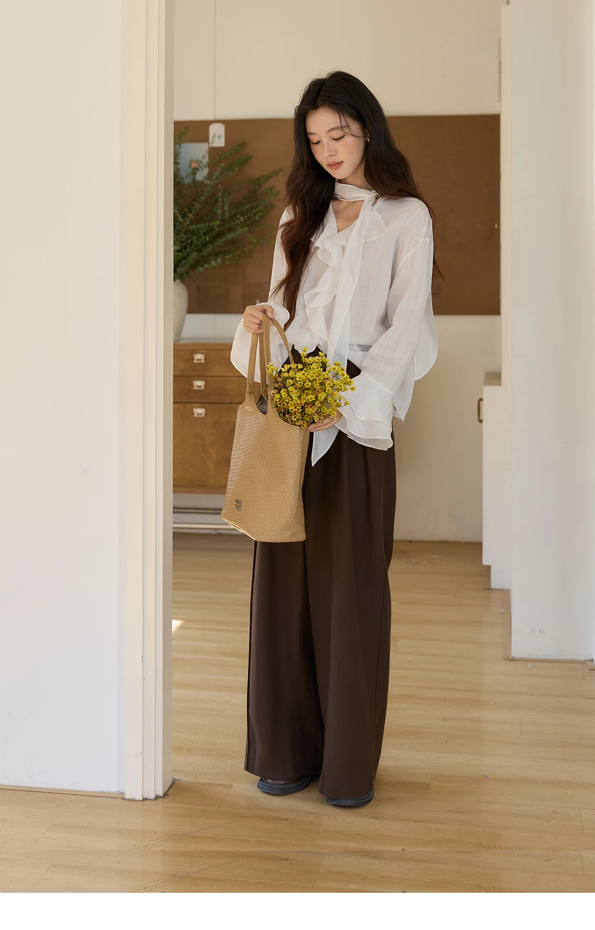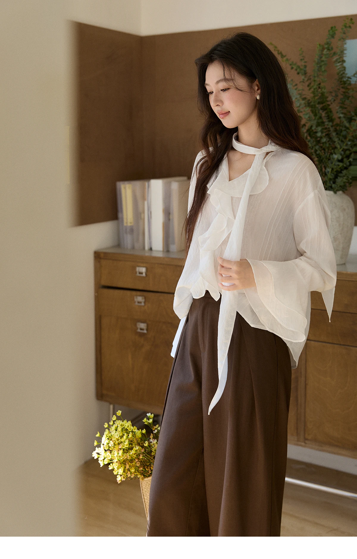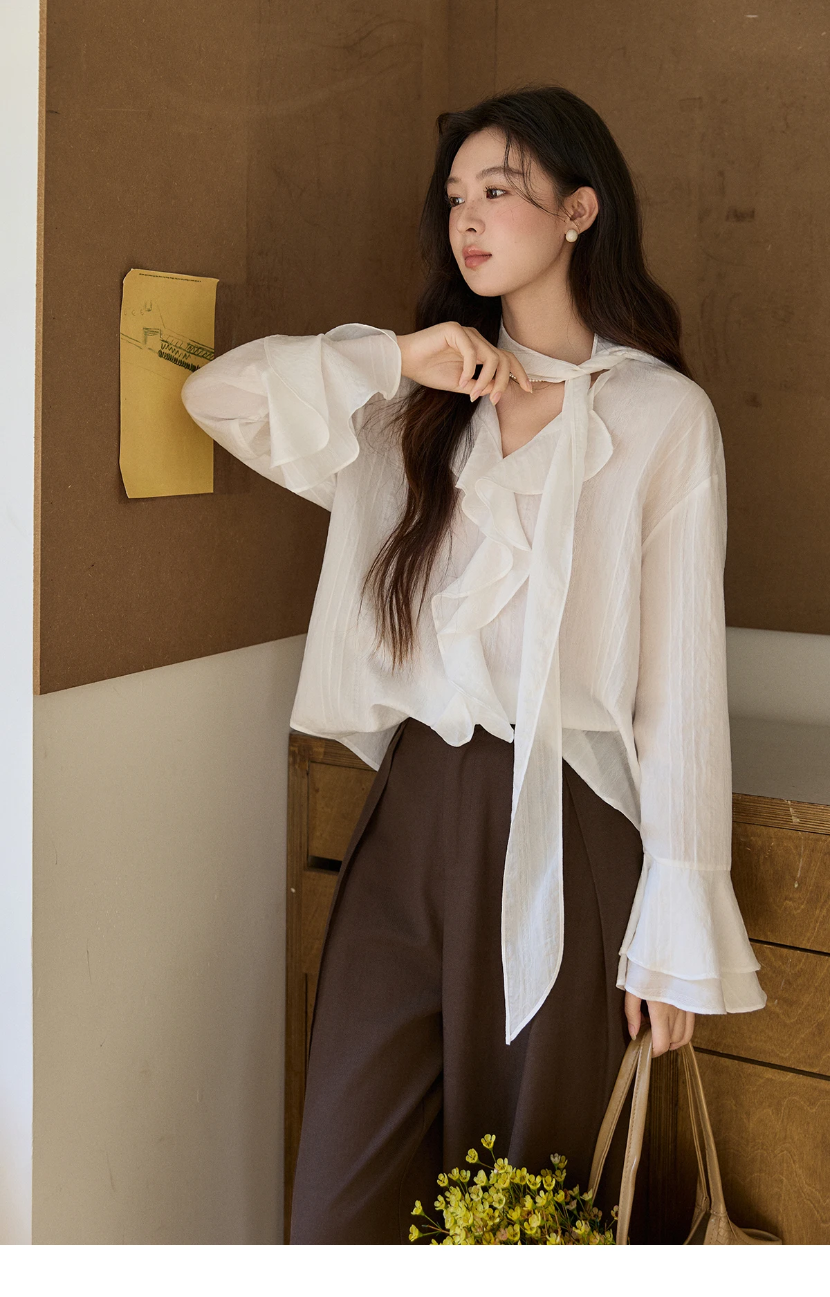 MISHOW Women's Ruffle Trim Chiffon Blouse with Detachable Scarf 2026 Spring Long Sleeve Loose Fit Casual White Top MXF108X0999