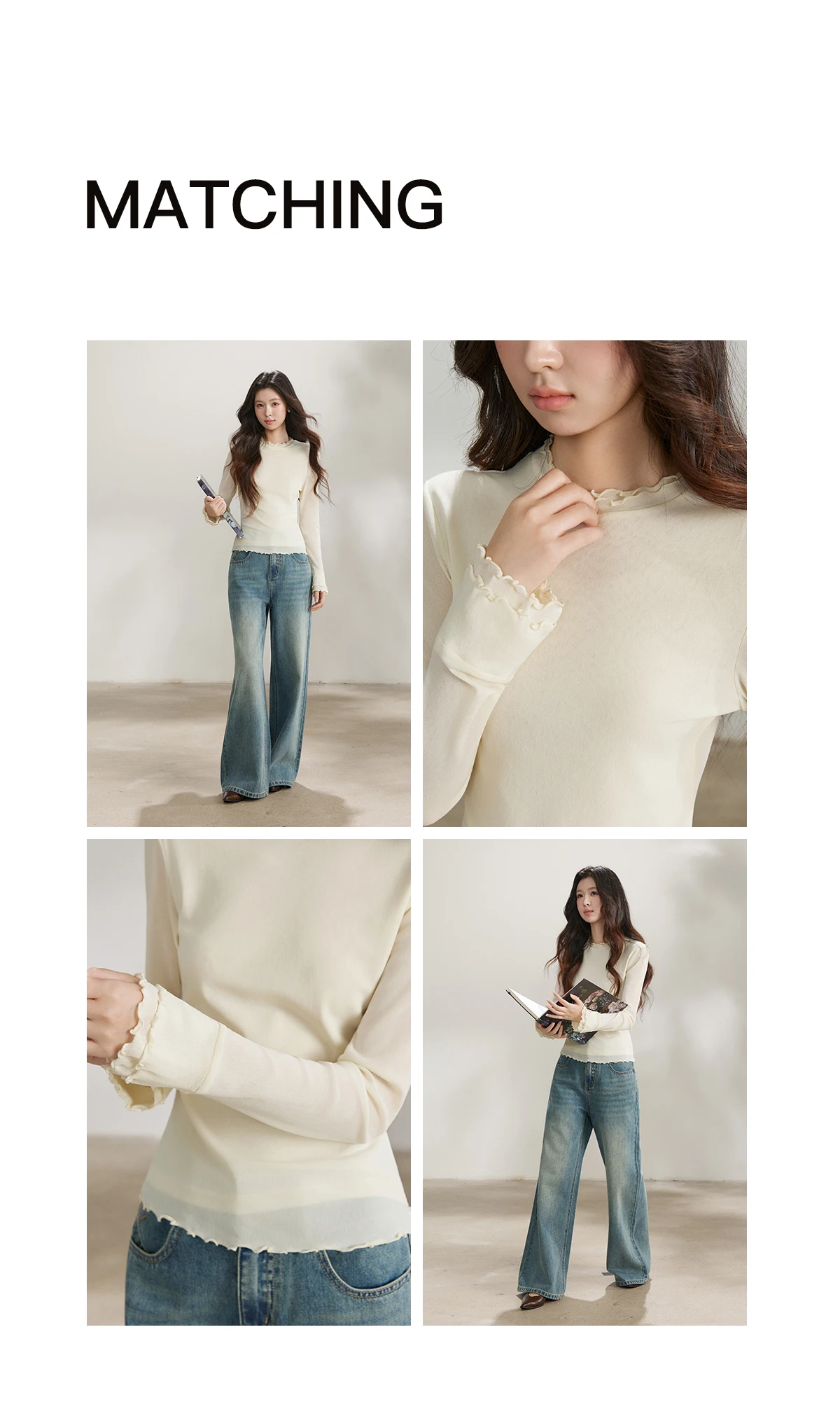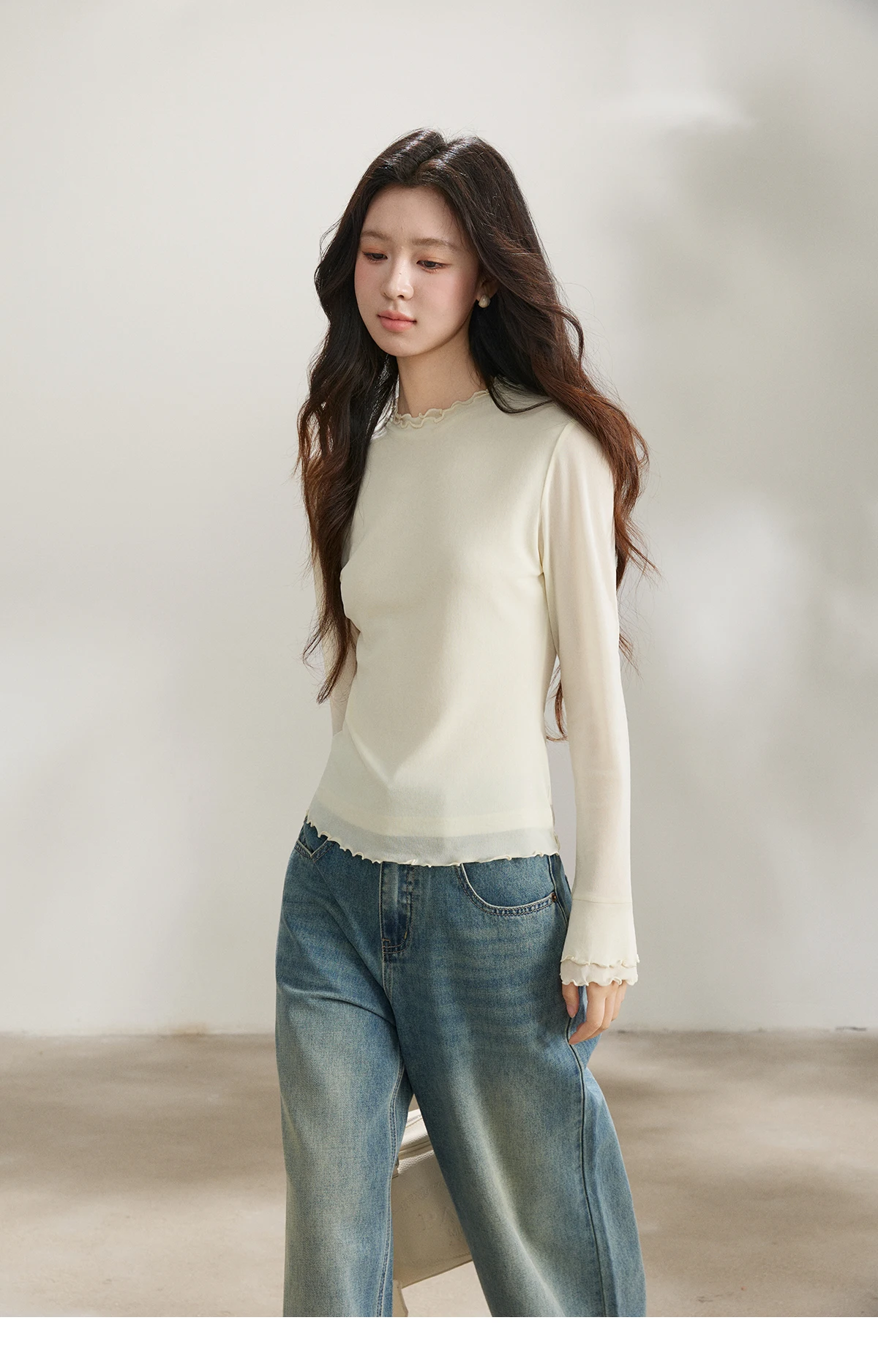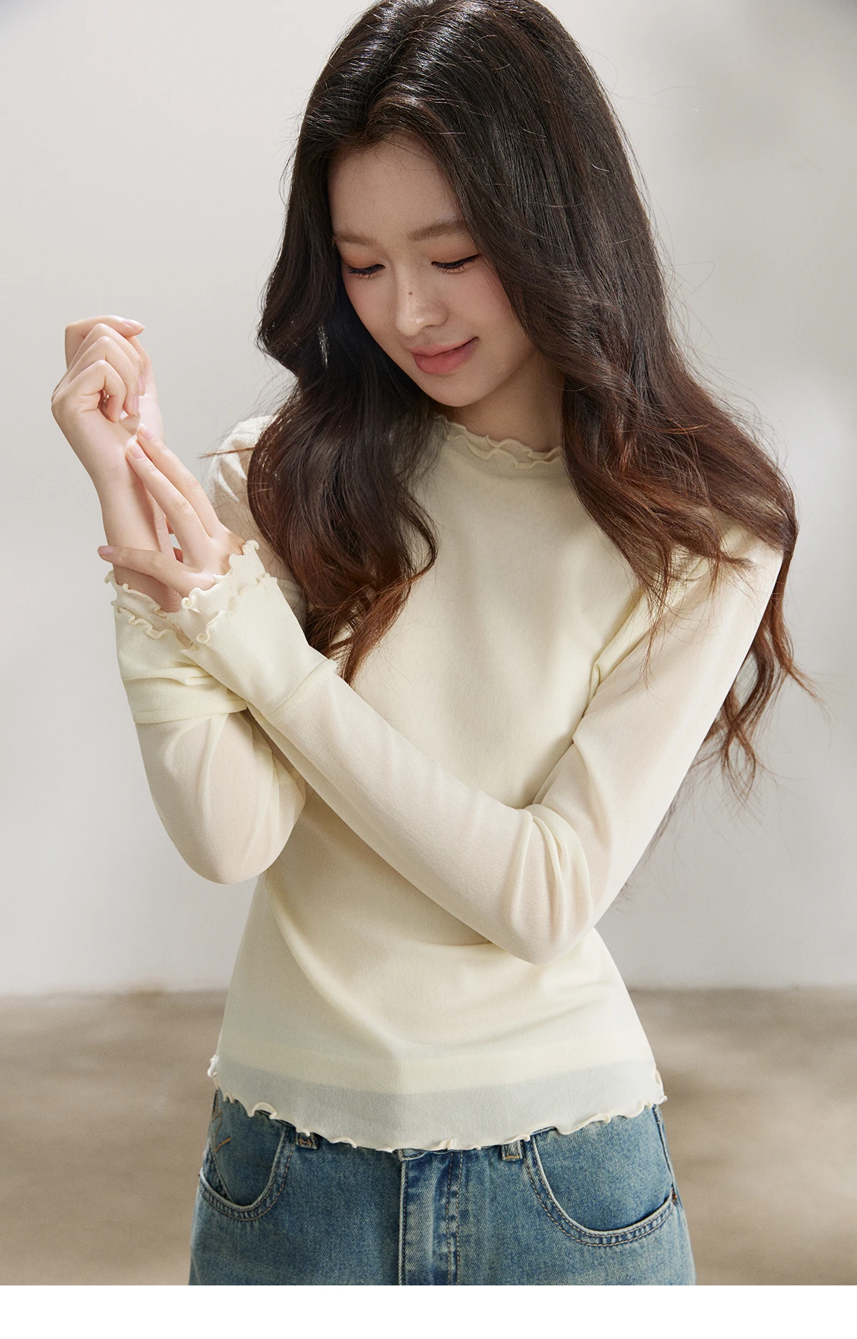 MISHOW Women's Ruffled Crew Neck Interior T-shirt 2026 Spring Lightweight Transparent Mesh Tops Slim Casual T-Shirt MXF11Z2914