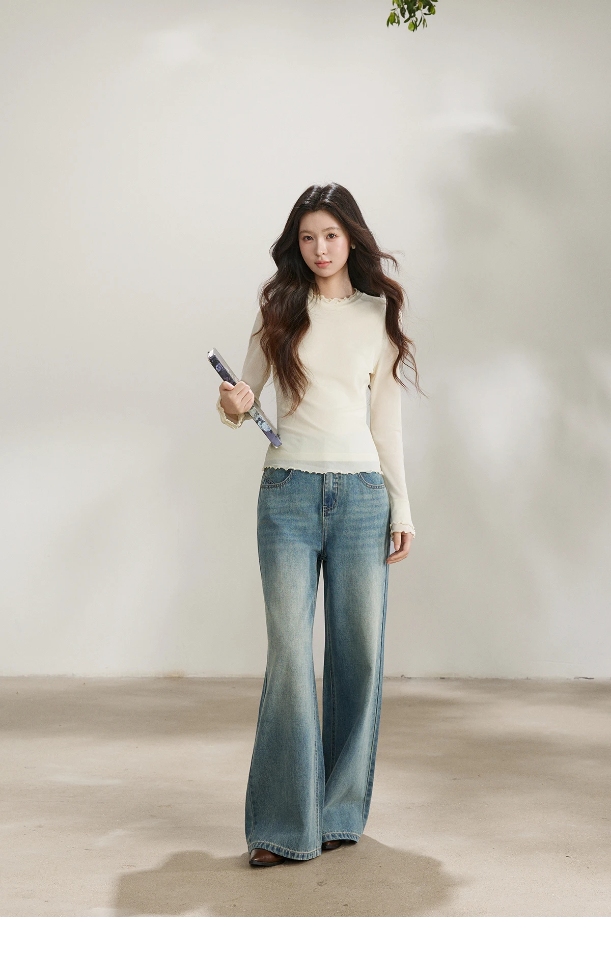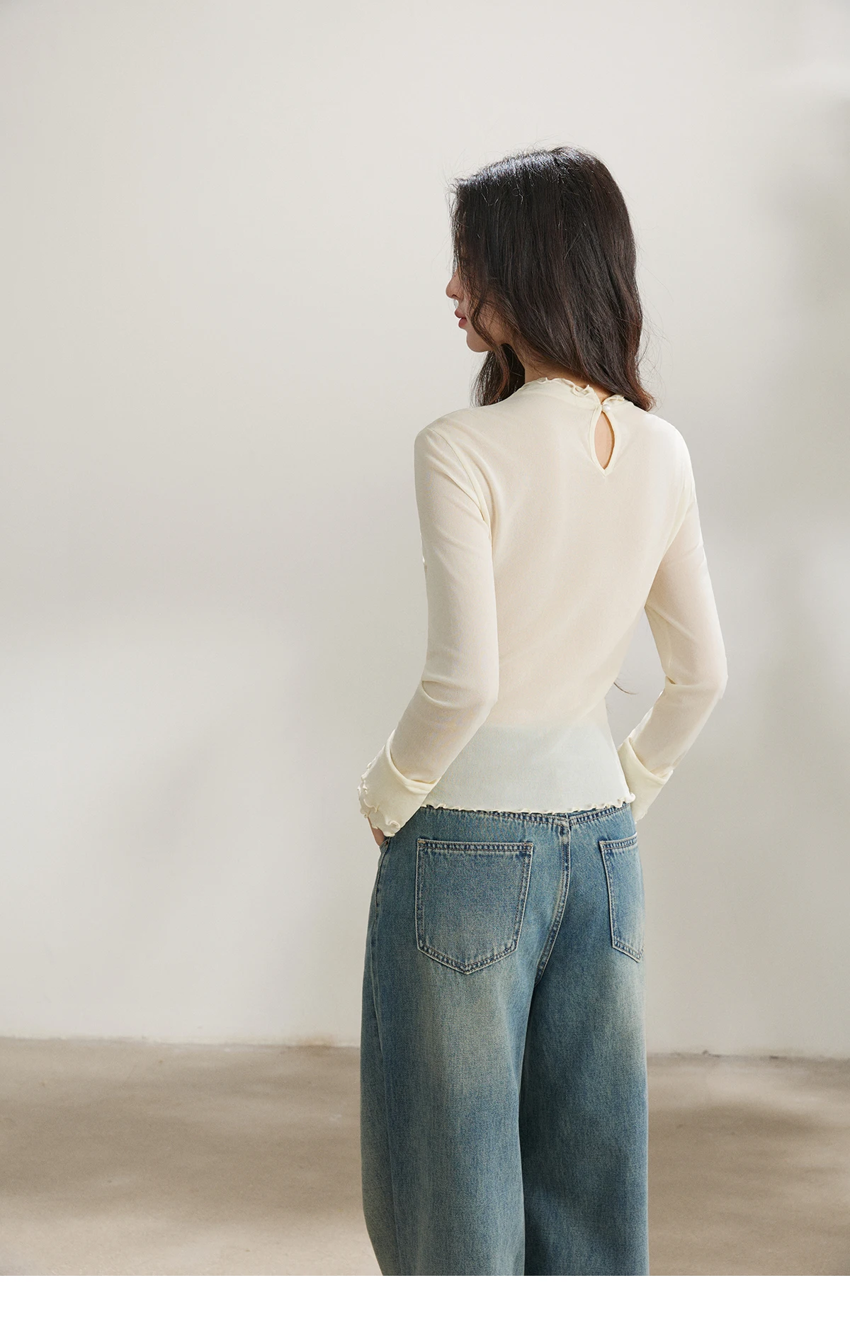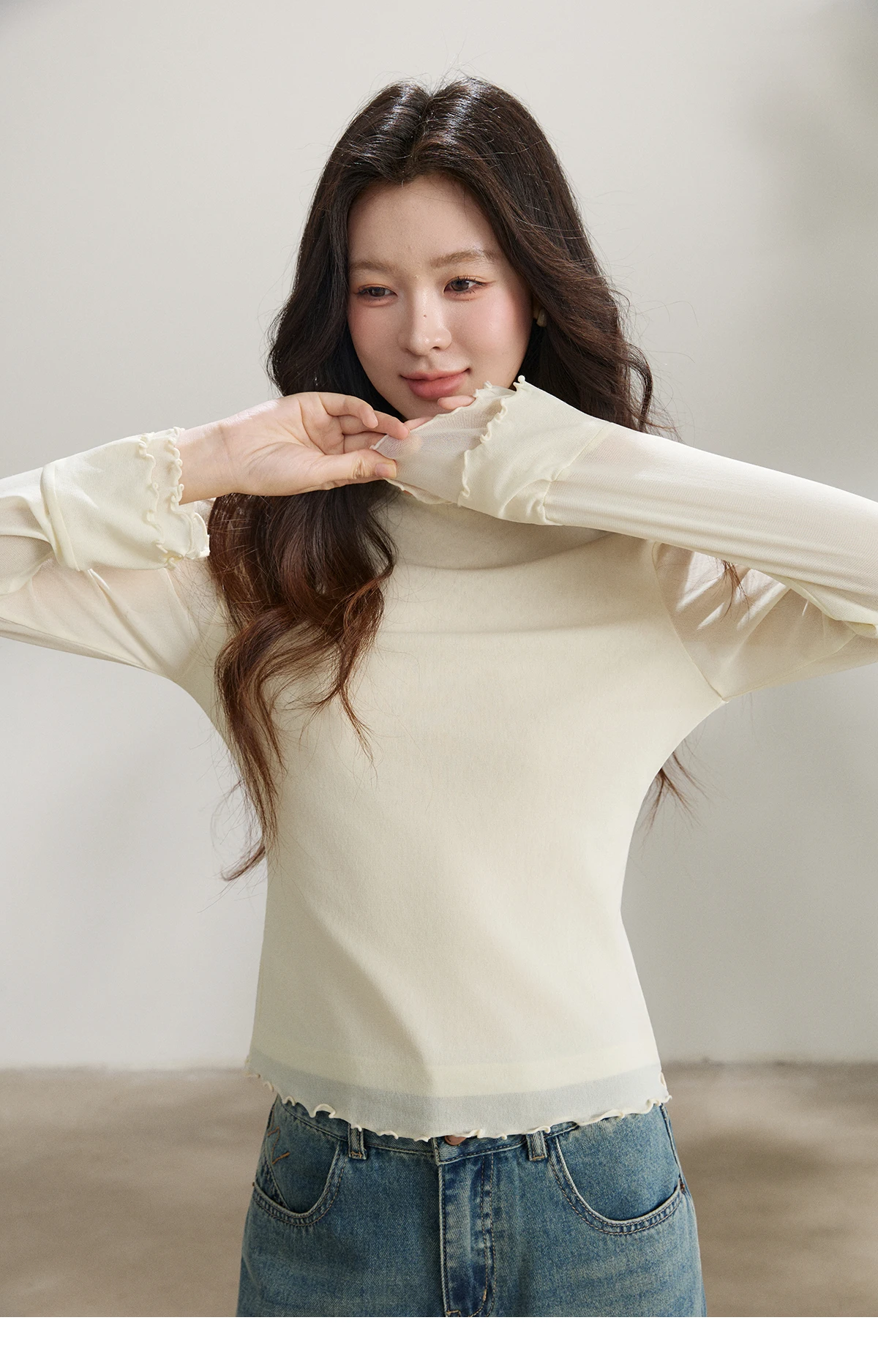 MISHOW Women's Ruffled Crew Neck Interior T-shirt 2026 Spring Lightweight Transparent Mesh Tops Slim Casual T-Shirt MXF11Z2914