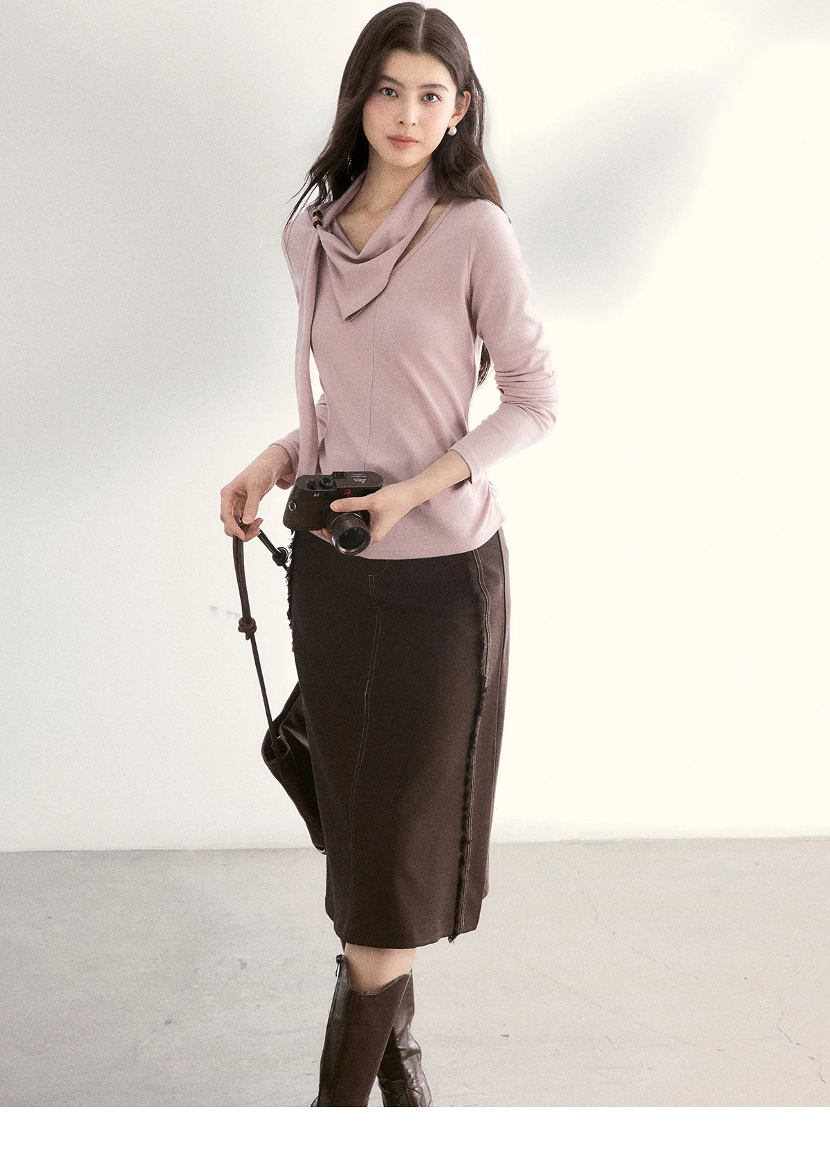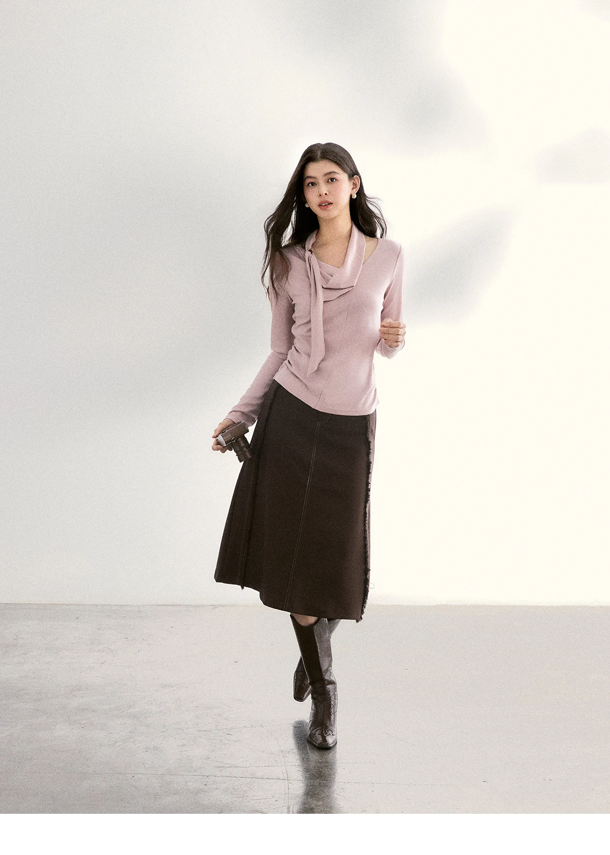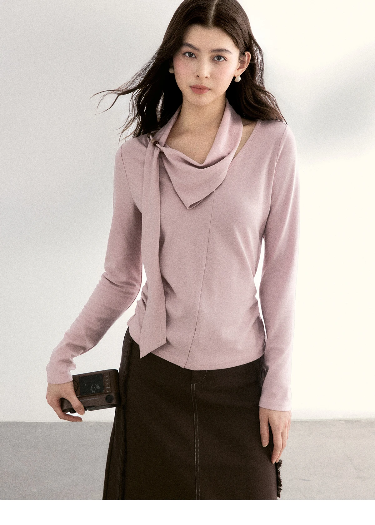 MISHOW Women's Scarf Neck Pink Long Sleeve Top 2026 Spring Color Collision Bead Asymmetrical Tops Knitted Sweaters MXF108Z1025