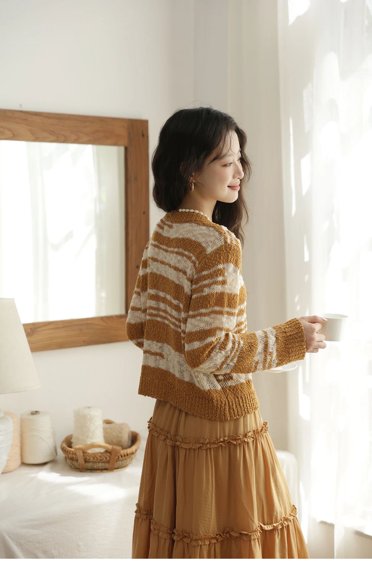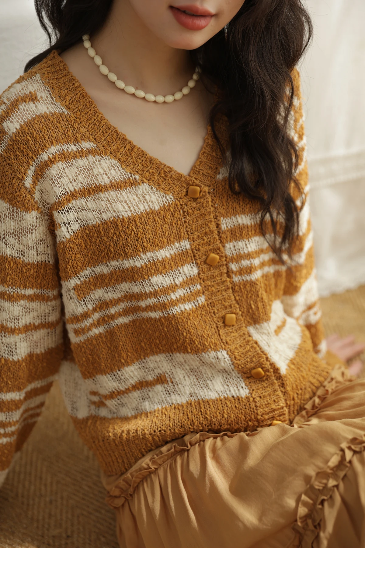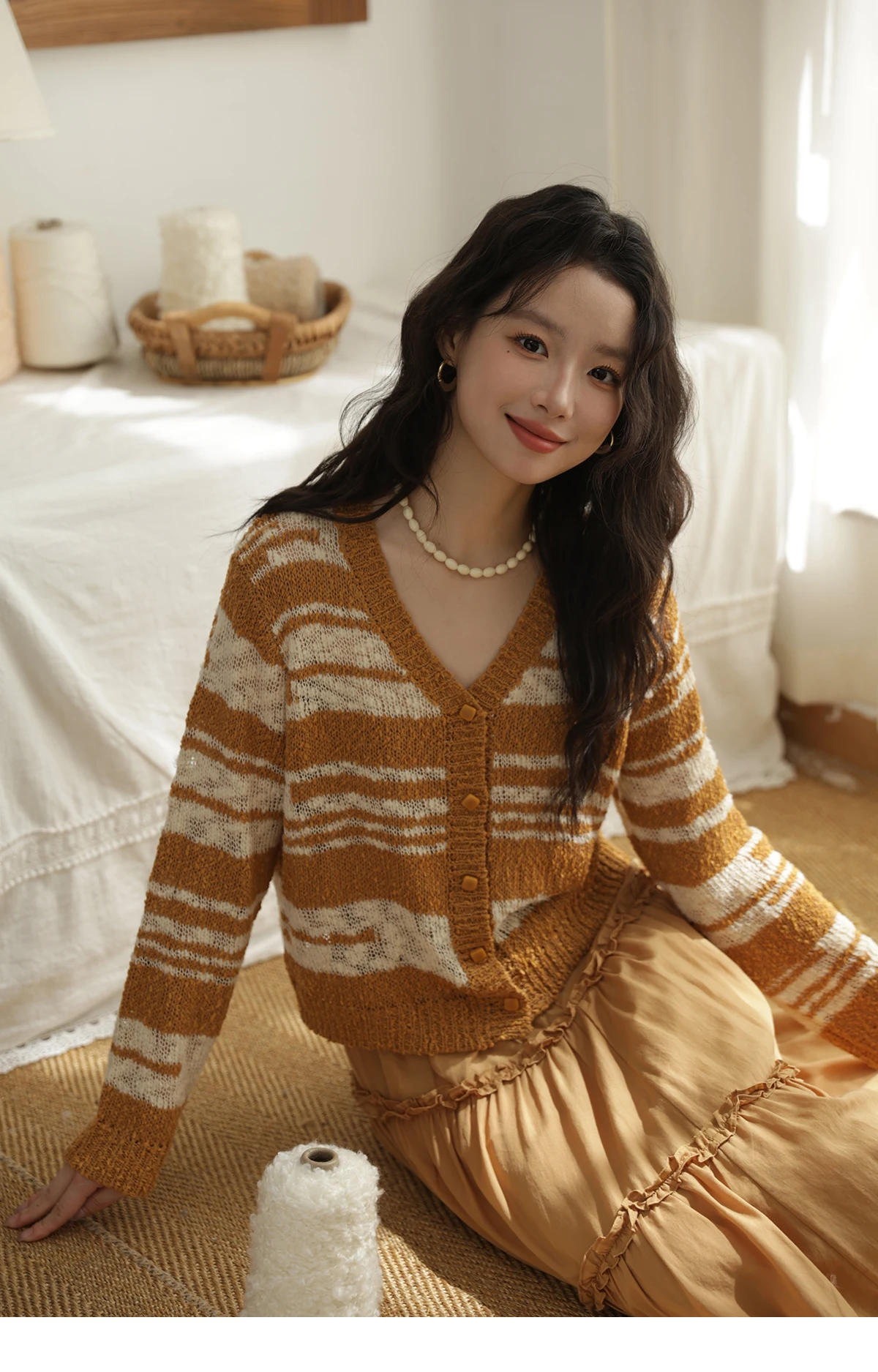 MISHOW Women's Striped Cardigan 2025 Autumn New Retro Yellow V-neck Long Sleeves Single-breasted Short Sweater Coats MXE44Z2516