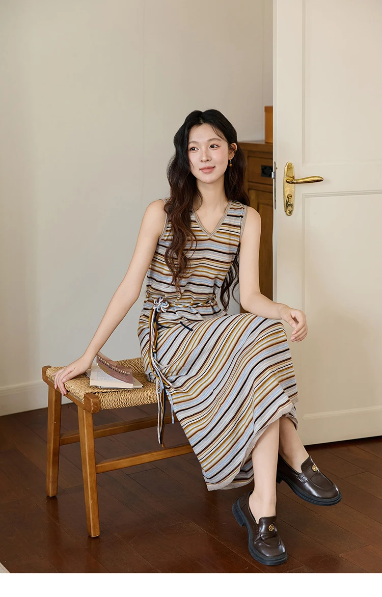 MISHOW Women's Striped V-neck Dress Autumn 2025 Loose Sleeveless Core Spun Yarn Dresses Tied Waist Casual Long Dress MXE46L2521