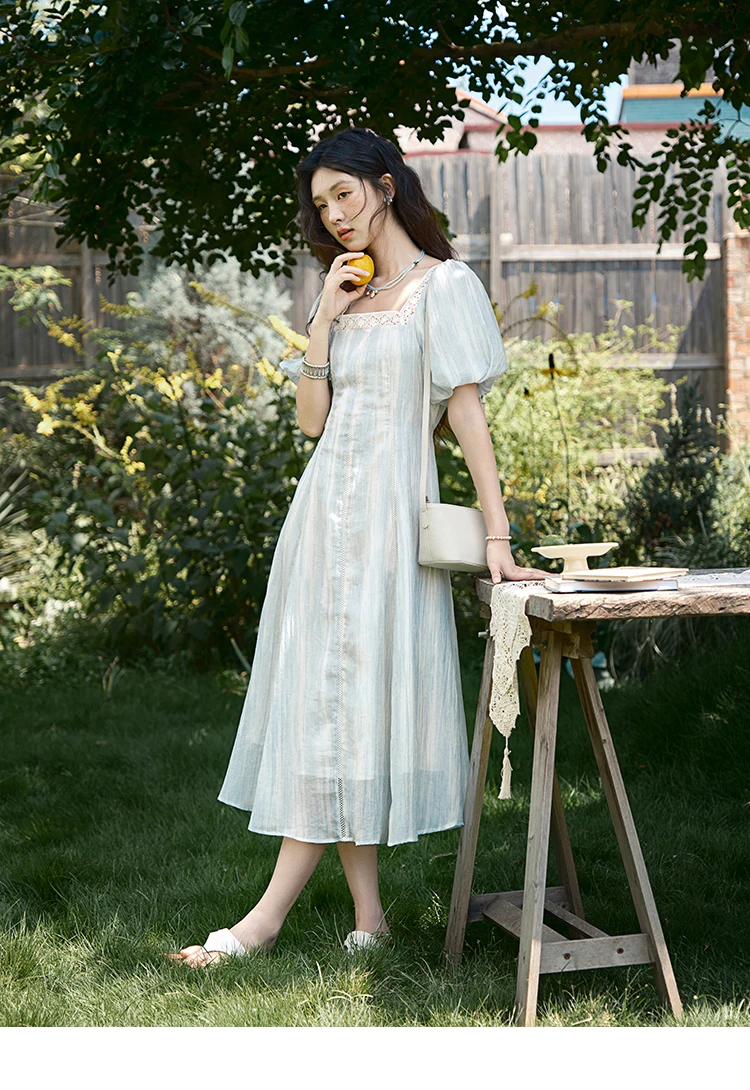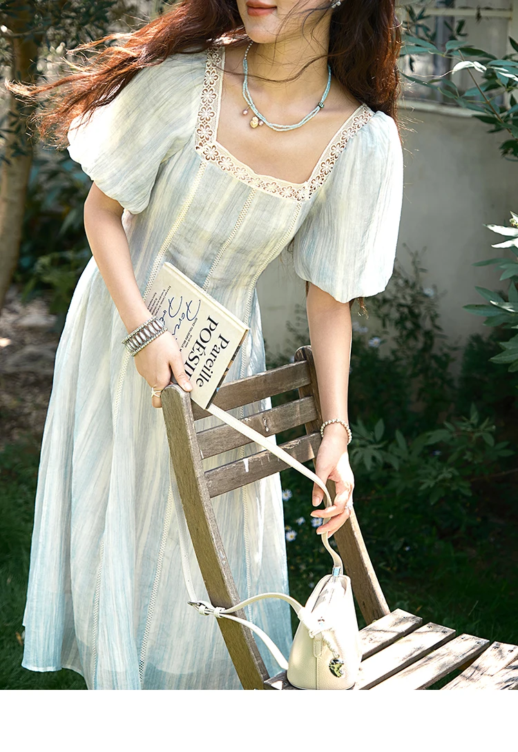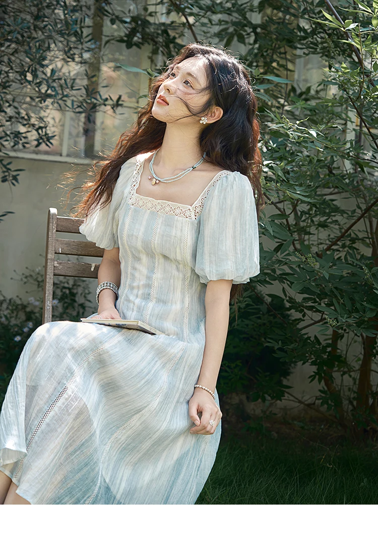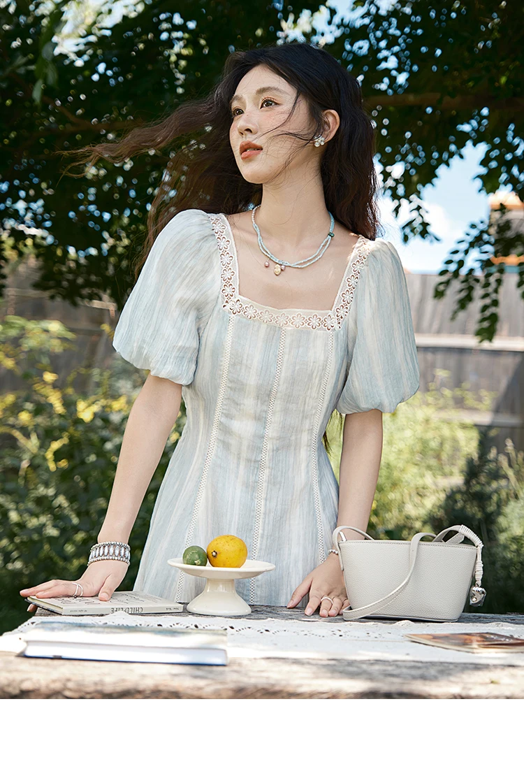 MISHOW Women's Summer Dress 2025 New Fashion Striped Square Neck Spliced Lace Hollow Out Dress Waist Lace Up Dresses MXE39L2403