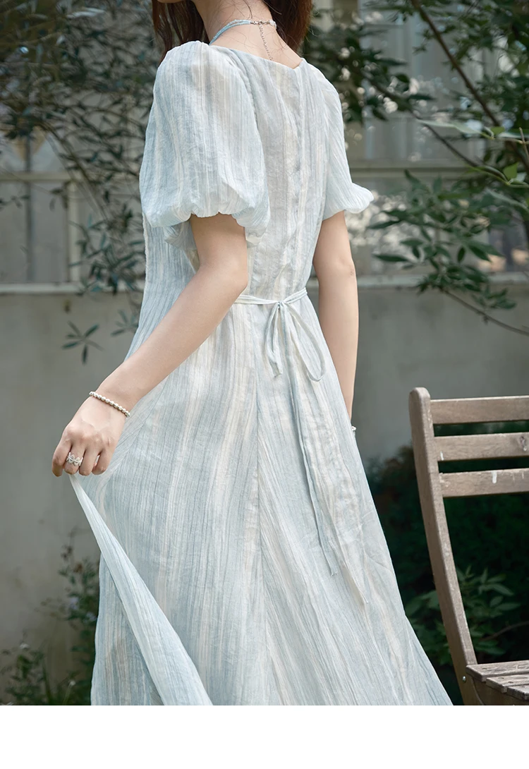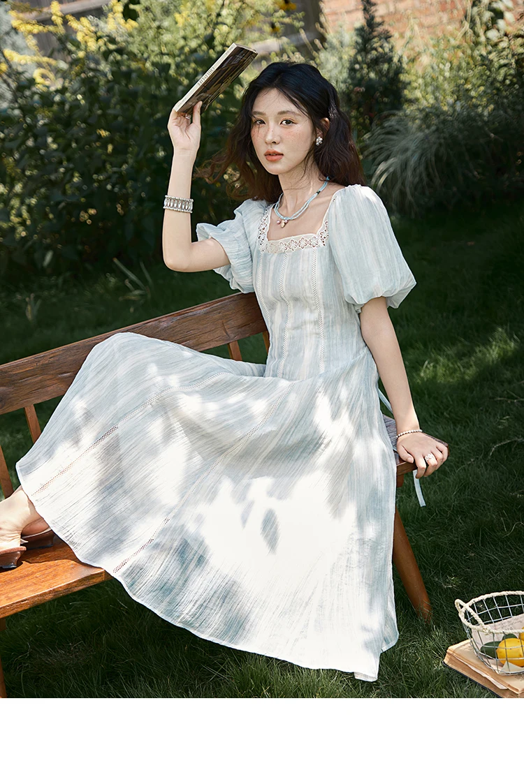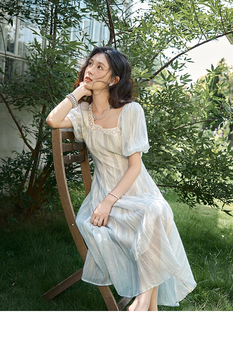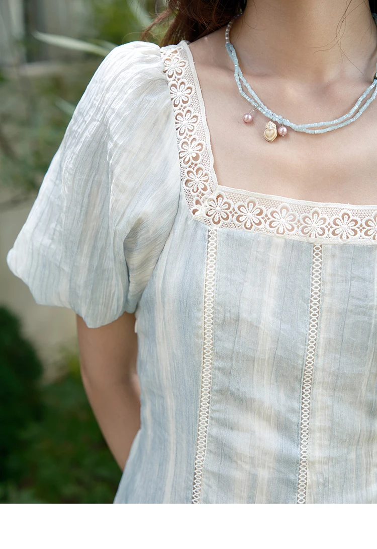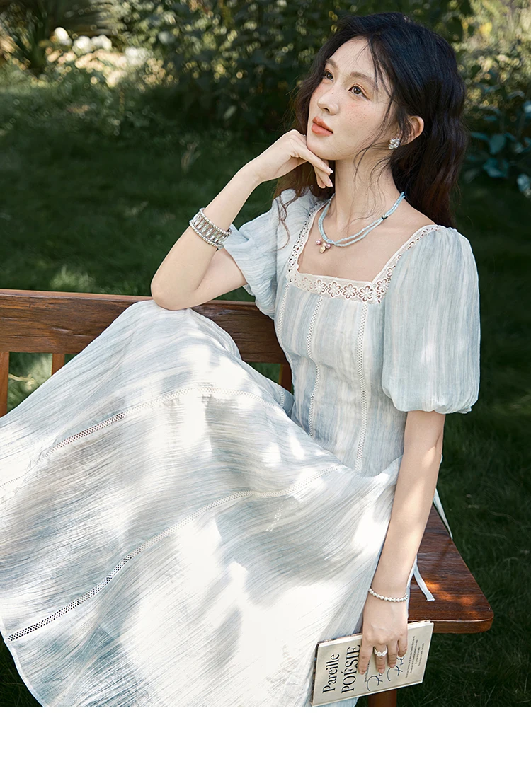 MISHOW Women's Summer Dress 2025 New Fashion Striped Square Neck Spliced Lace Hollow Out Dress Waist Lace Up Dresses MXE39L2403