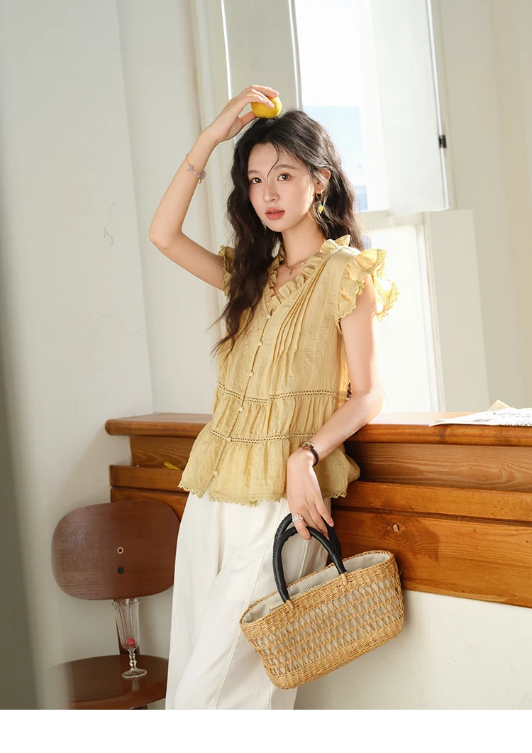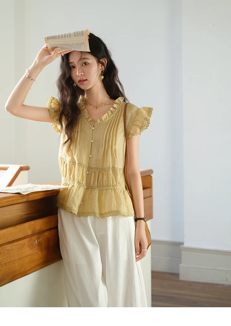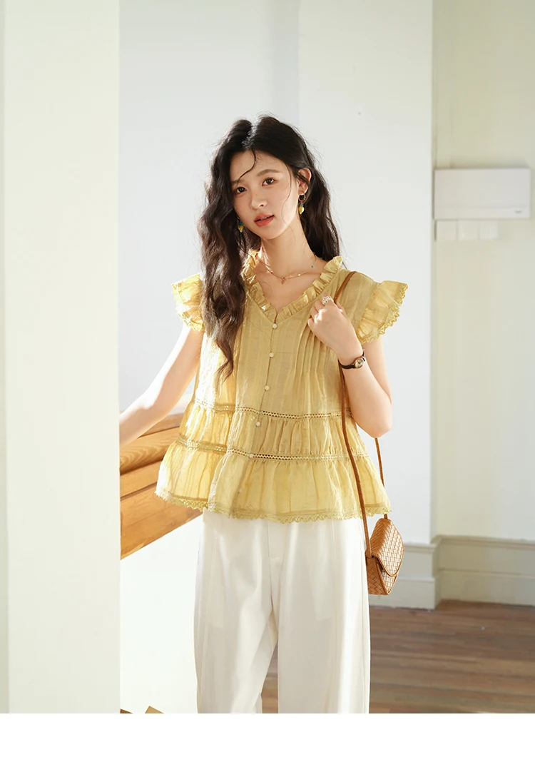 MISHOW Women's Summer Shirt 2025 New Wood Ear V-neck Flying Sleeve Shirt Casual Wrinkle Spliced Button Ladies Top MXE37X1908