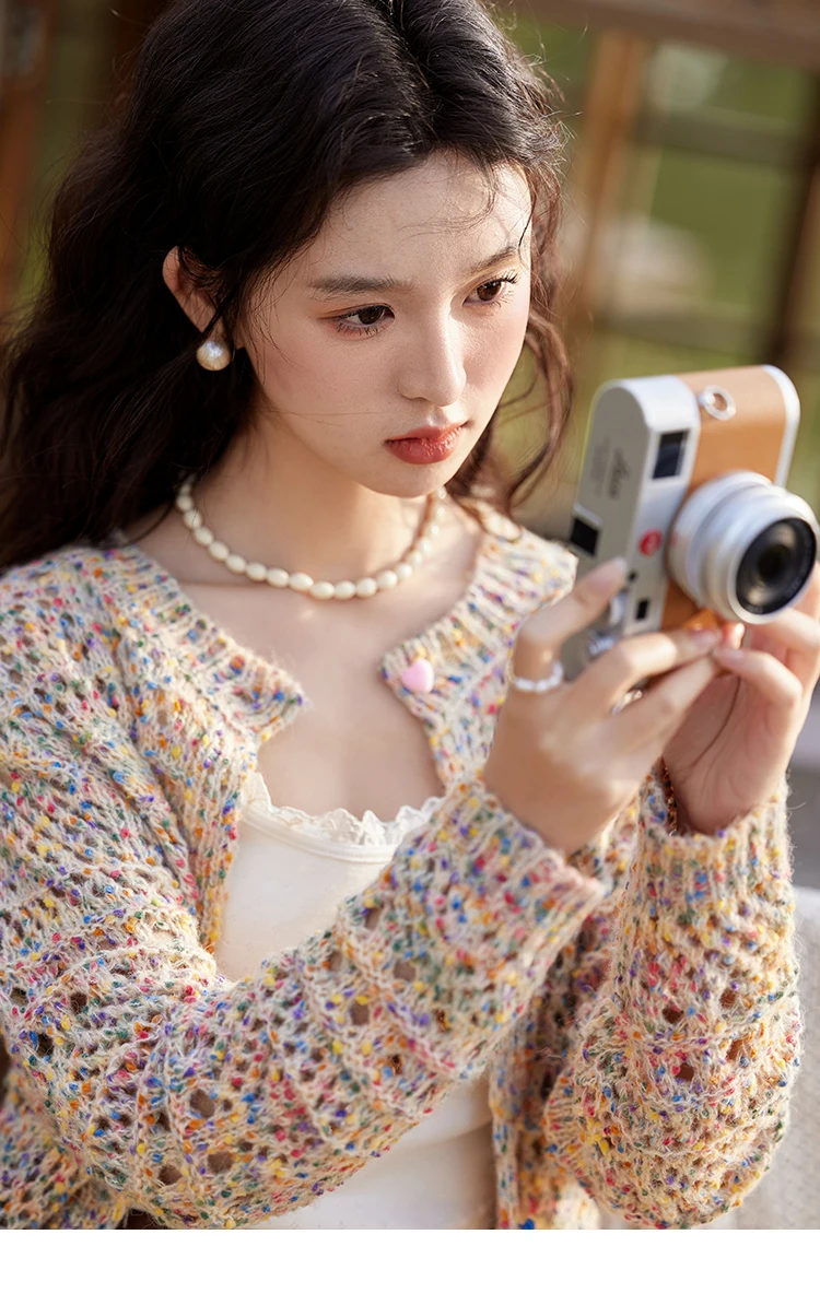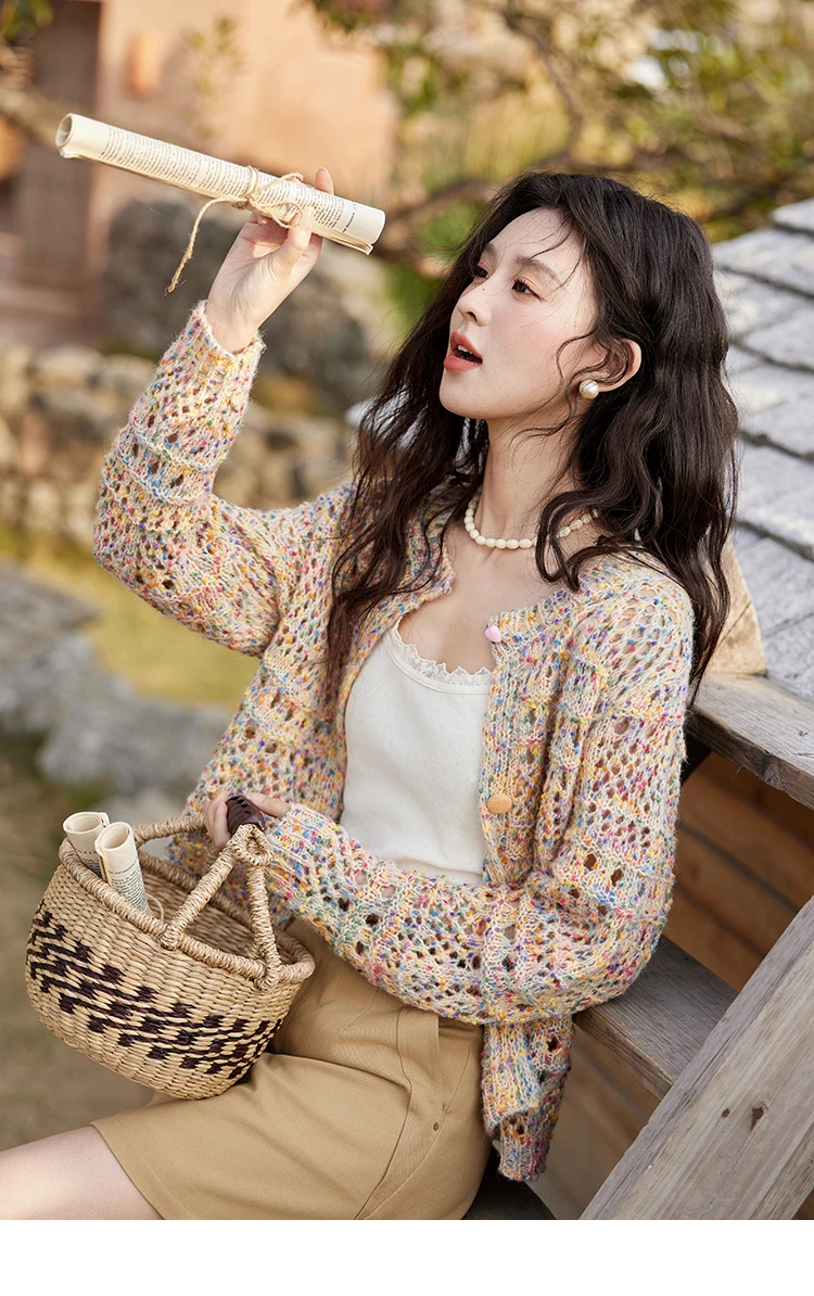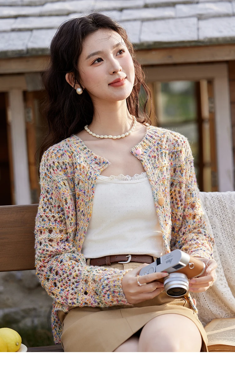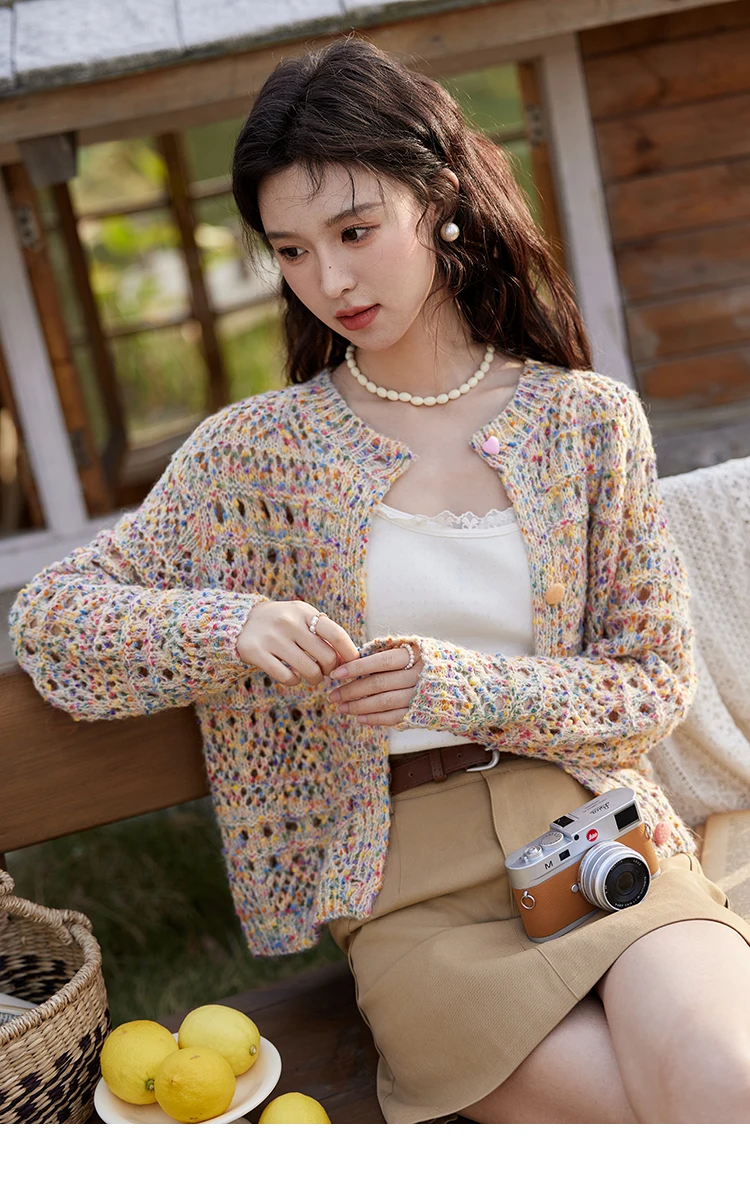 MISHOW Women's Sweet Woven Hollow Knitted Cardigan 2025 Spring Rainbow Button Single Breasted Top O-neck Cardigan MXE13Z1110